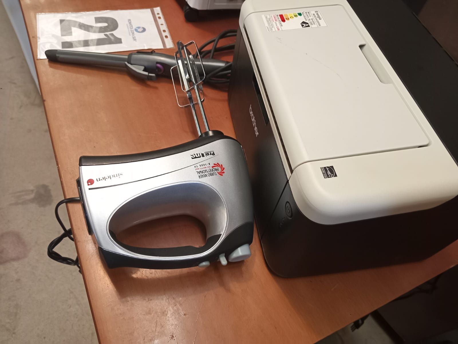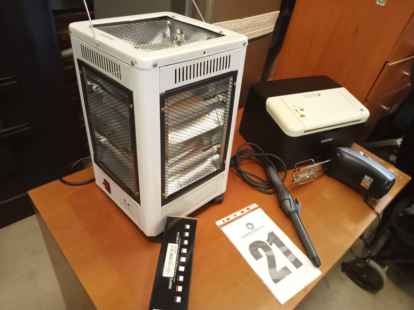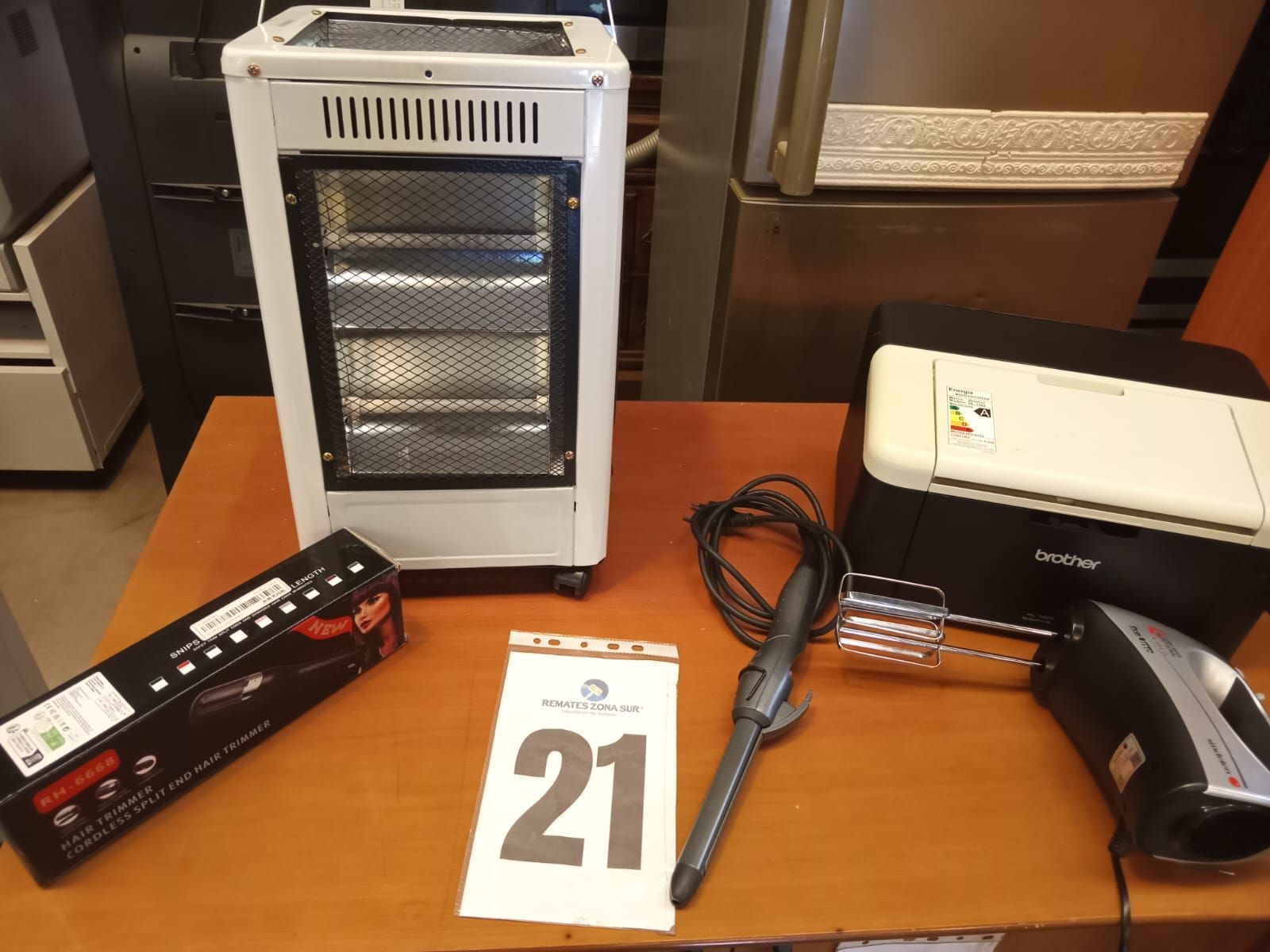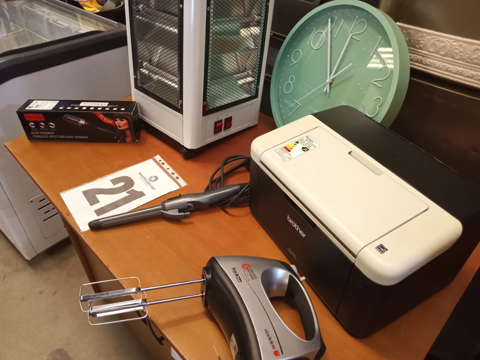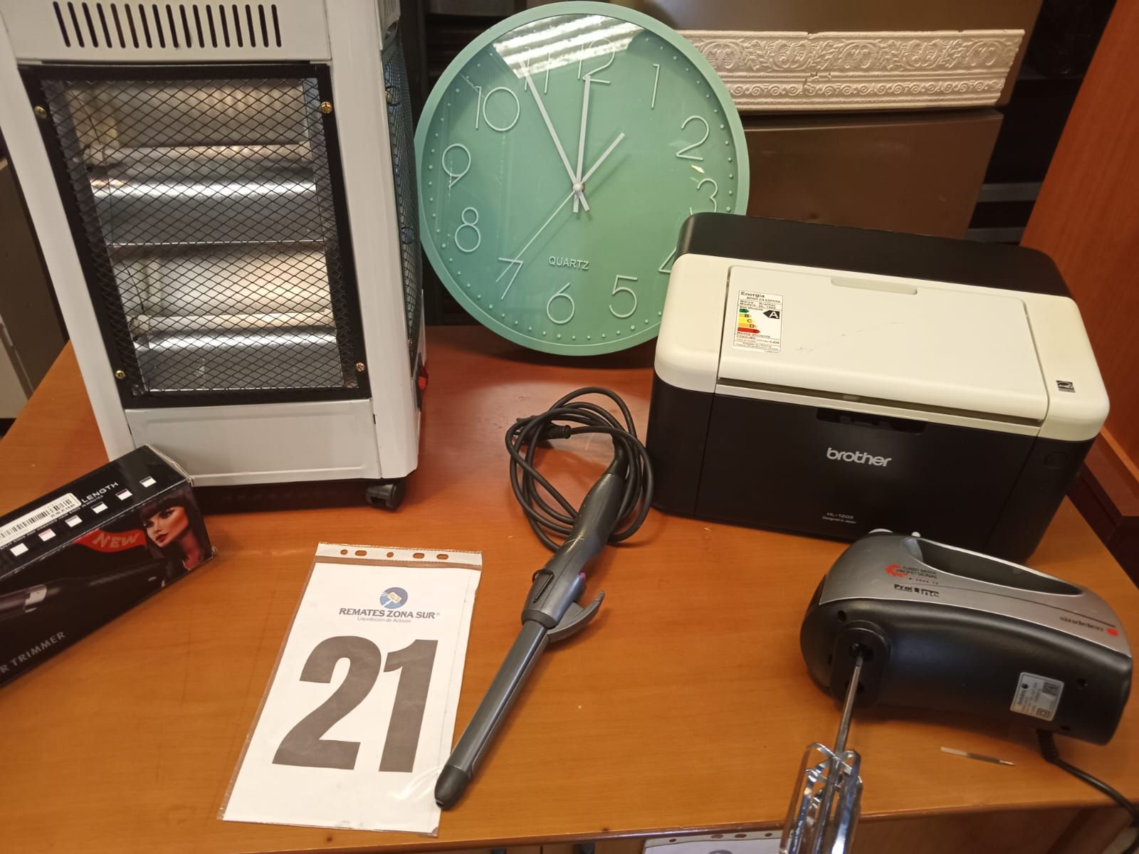 LOTE 21: Impresora Brother. Onduladora de pelo Remington. Cortador de puntas de pelo Hair Timmer. Reloj mural Quartz. Estufa electrica Vida amor.