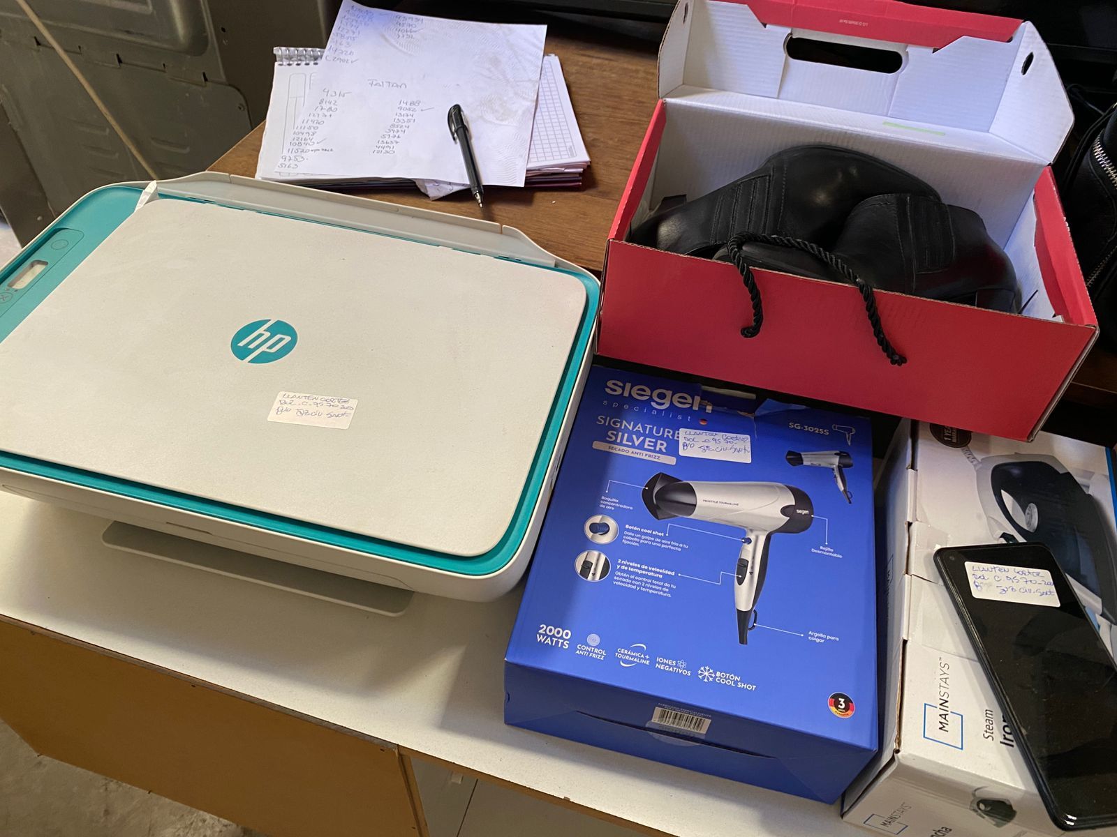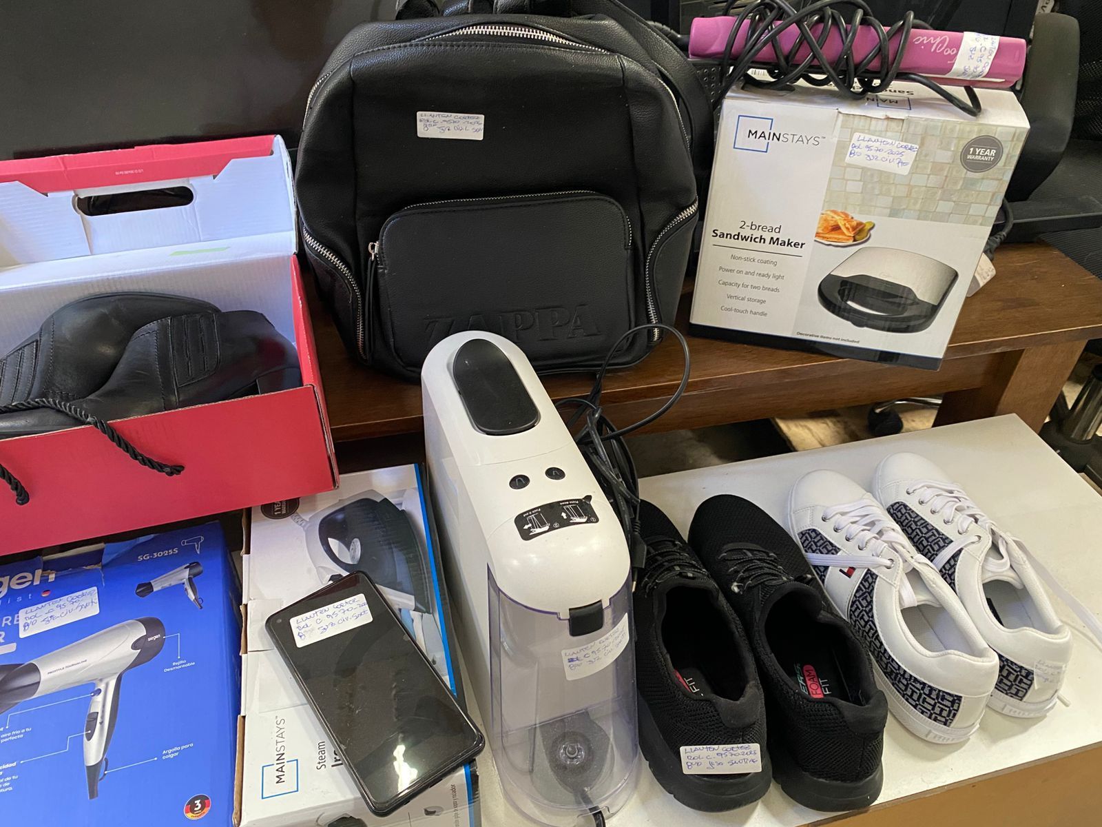 LOTE 46: Teléfono celular Samsung. Par de botines negros. Par de zapatillas blancas. Mochila negra Zappa. Cafetera blanca Marley. Plancha alisadora de pelo Gama. Par de zapatillas negras skechers. Impresora Hp. Plancha a vapor en caja Manstays. Sandwichera de dos panes Masntays. Secador de pelo Siegen. (Retiro En Stgo. de Chile) SUSPENDIDO