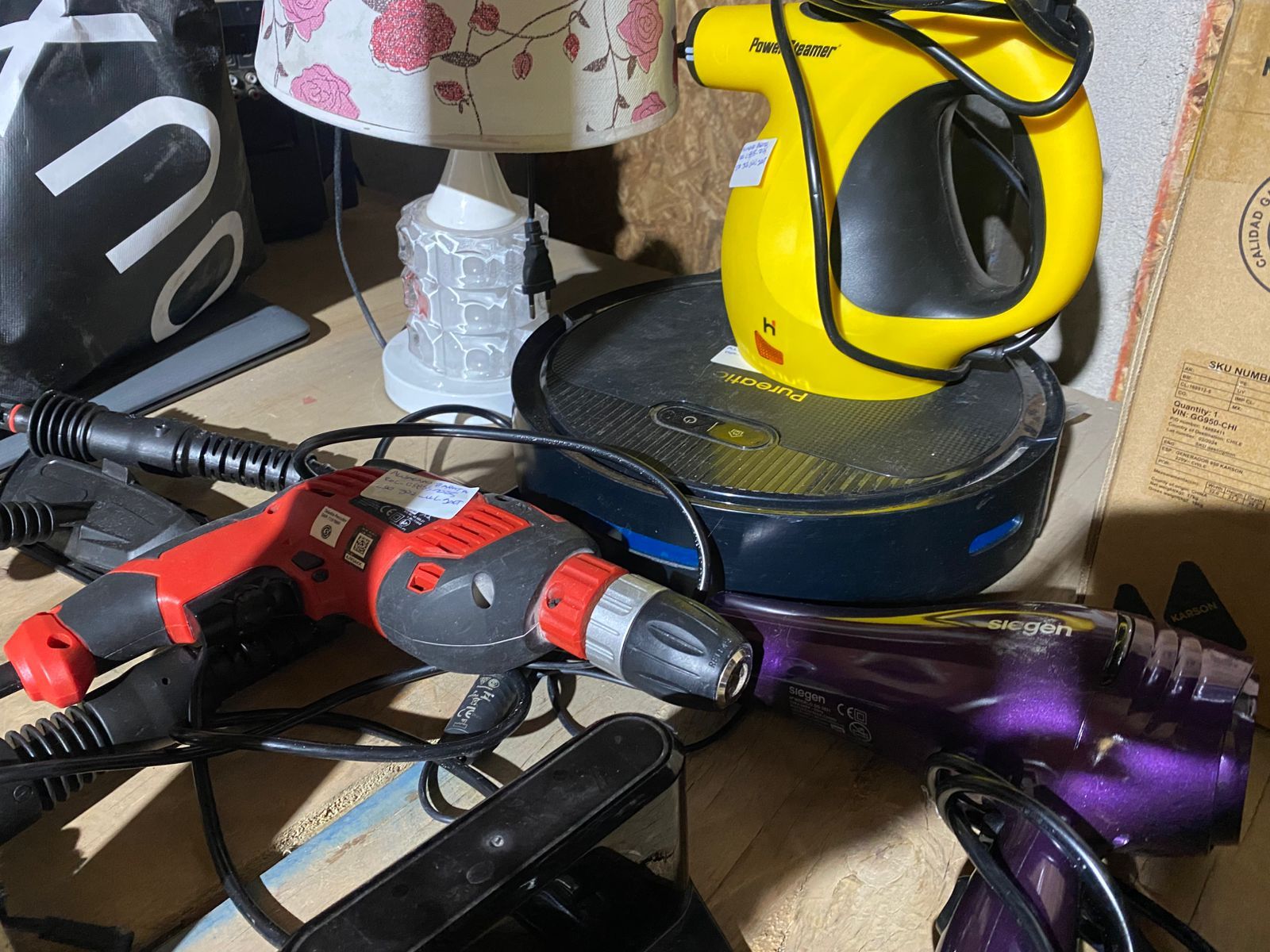 LOTE 45: Aspiradora robot Pureatic. Secador de pelo Siegen. Maquina limpieza a vapor Hausen. Taladro percutor Heinhell. Lámpara sin marca. Maquina de afeitar Phillips. (Retiro En Stgo. de Chile)