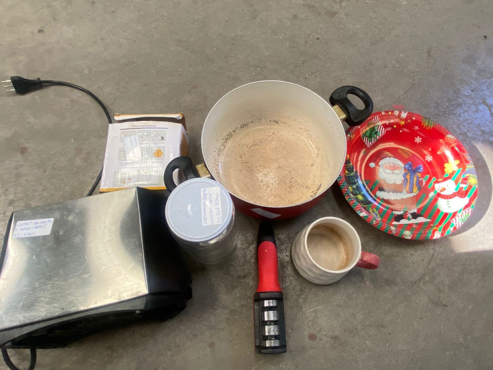 LOTE 53: Olla roja. Afilador de cuchillo. Bandeja plástica navidad. Limpia vidrios. Tostador de pan. Juego de tazas. Jarra de vidrio.