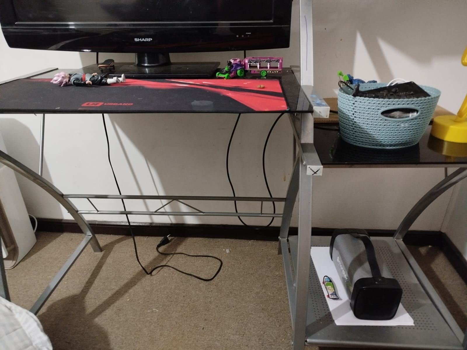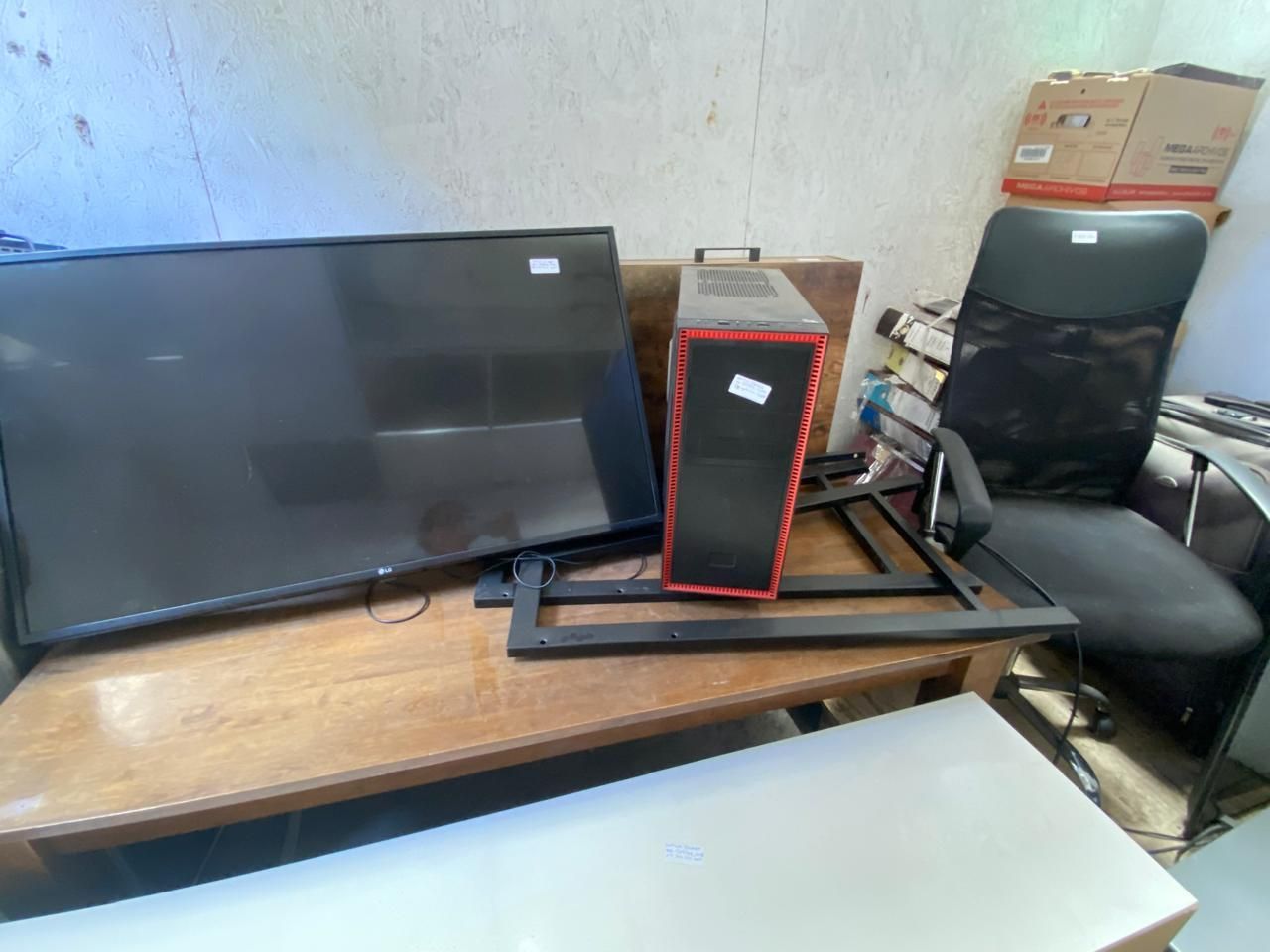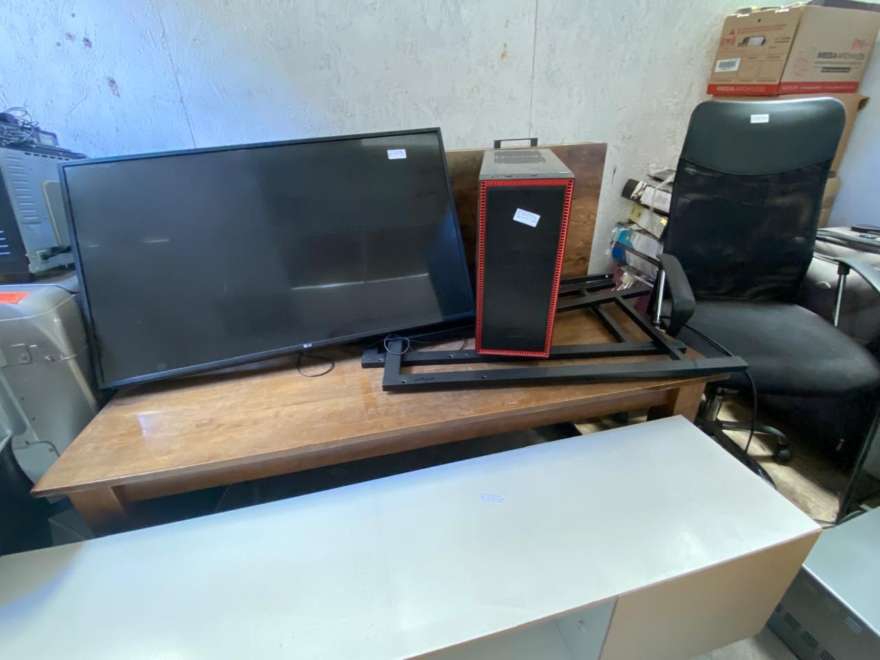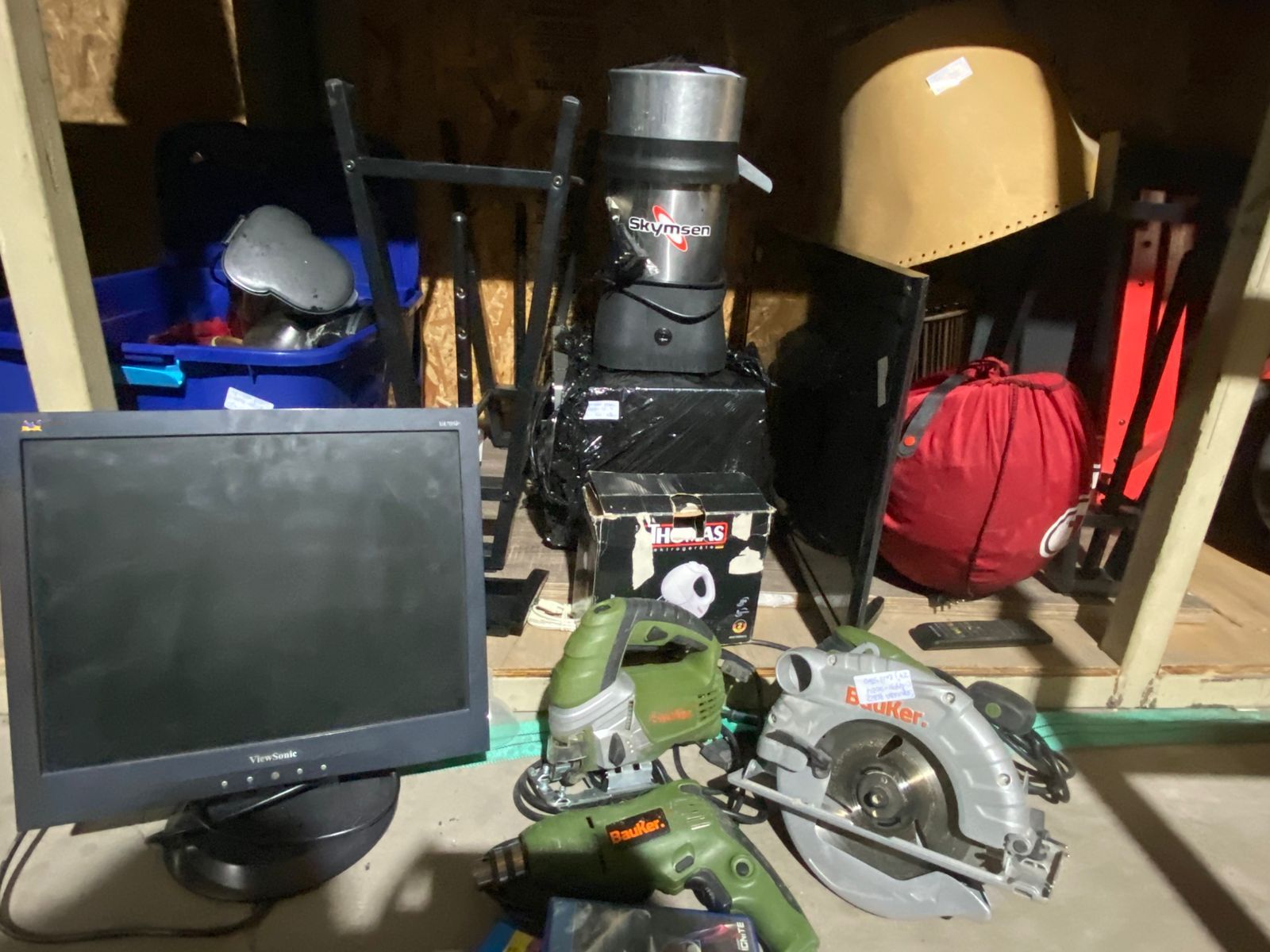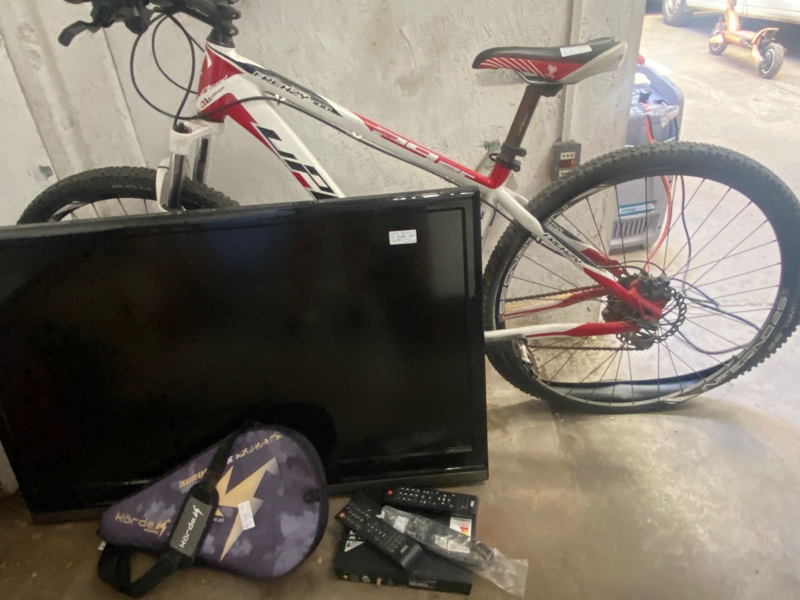 LOTE 35: Perchero blanco. Cesta de frutas de madera. Televisor Samsung negro. Centro de entrenamiento de madera. Lámpara de cobre. Mesa de madera para oficina. Bicicleta Trek ploma. Juegos Playstation. Computador de escritorio Hp. Monitor view Sony negro. Mesa de madera. Taladro. Caladora. Sierra circular. Microondas Thomas color plomo. Parrillera Electrica Somela. Cafetera Oster. Juguera Oster. Tostiarepa Oster. Picadora eléctrica th-9010v. Casco moto negro. Casco moto blanco. Exprimidor de jugo ex skypsem. (Retiro Stgo. de Chile)