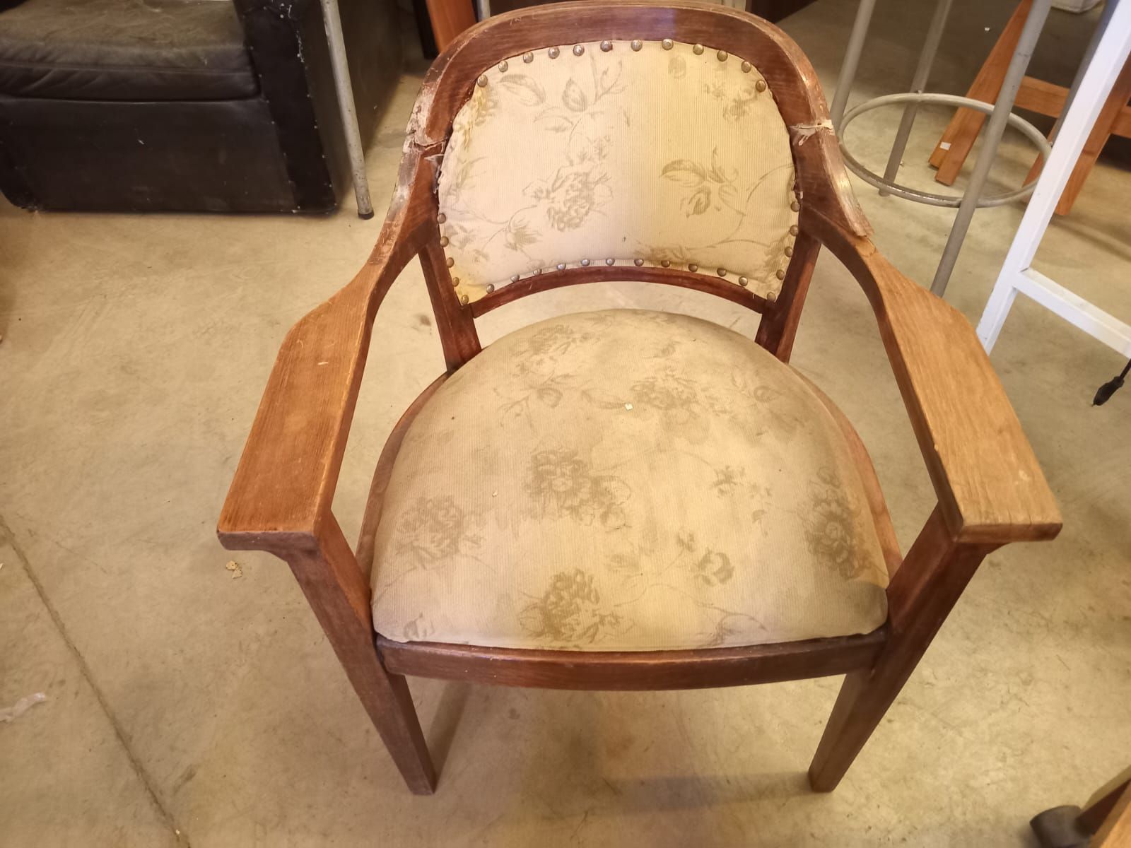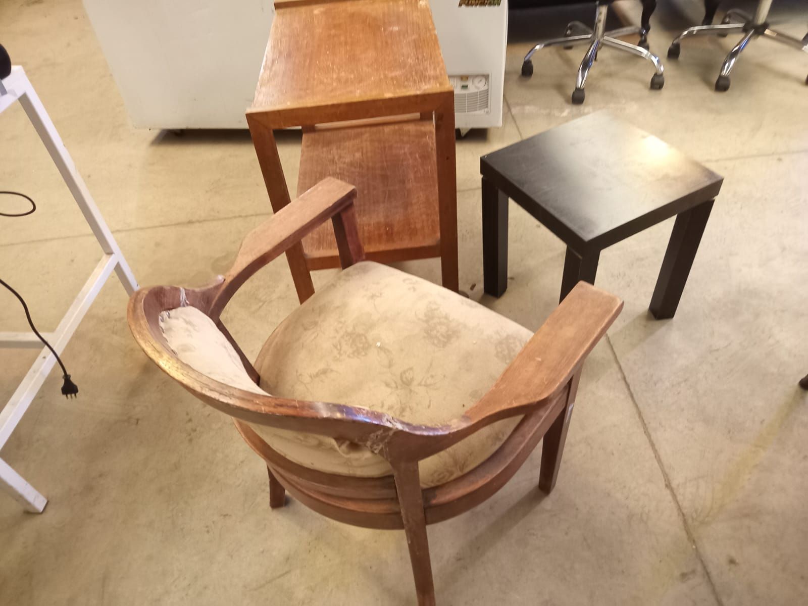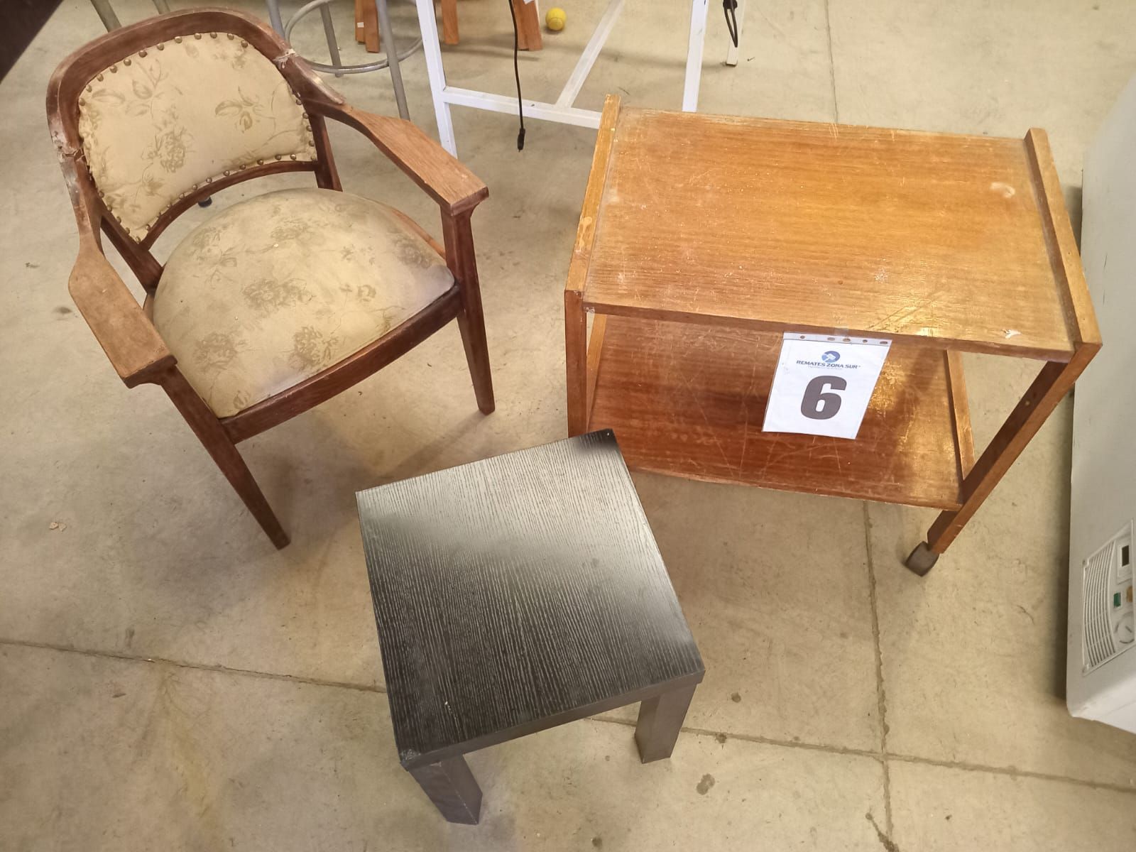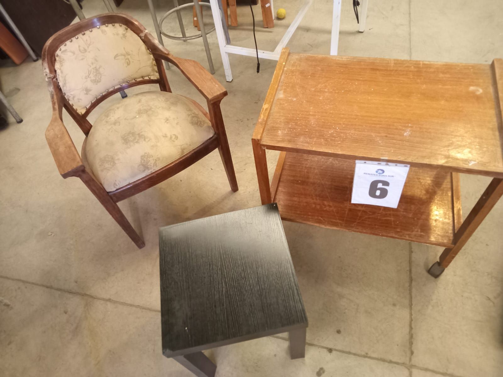 LOTE 06: Poltrona. Mesa de arrimo. Mesa de centro. (Retiro en Sede Rzs)