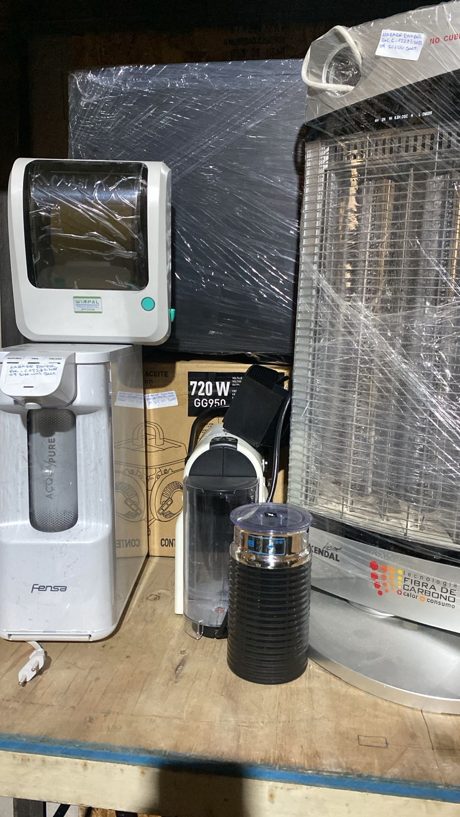 LOTE 48: Estufa infrarroja 2 en 1 thor green. Estufa de carbono eléctrica gris Kendal. Generador eléctrico bencinero partida manual karson. Purificador de agua Fensa. Espumador de leche gris Nespresso. Cafetera blanca Nespresso. Impresora térmica adhesiva usb.(Retiro En Stgo. de Chile)