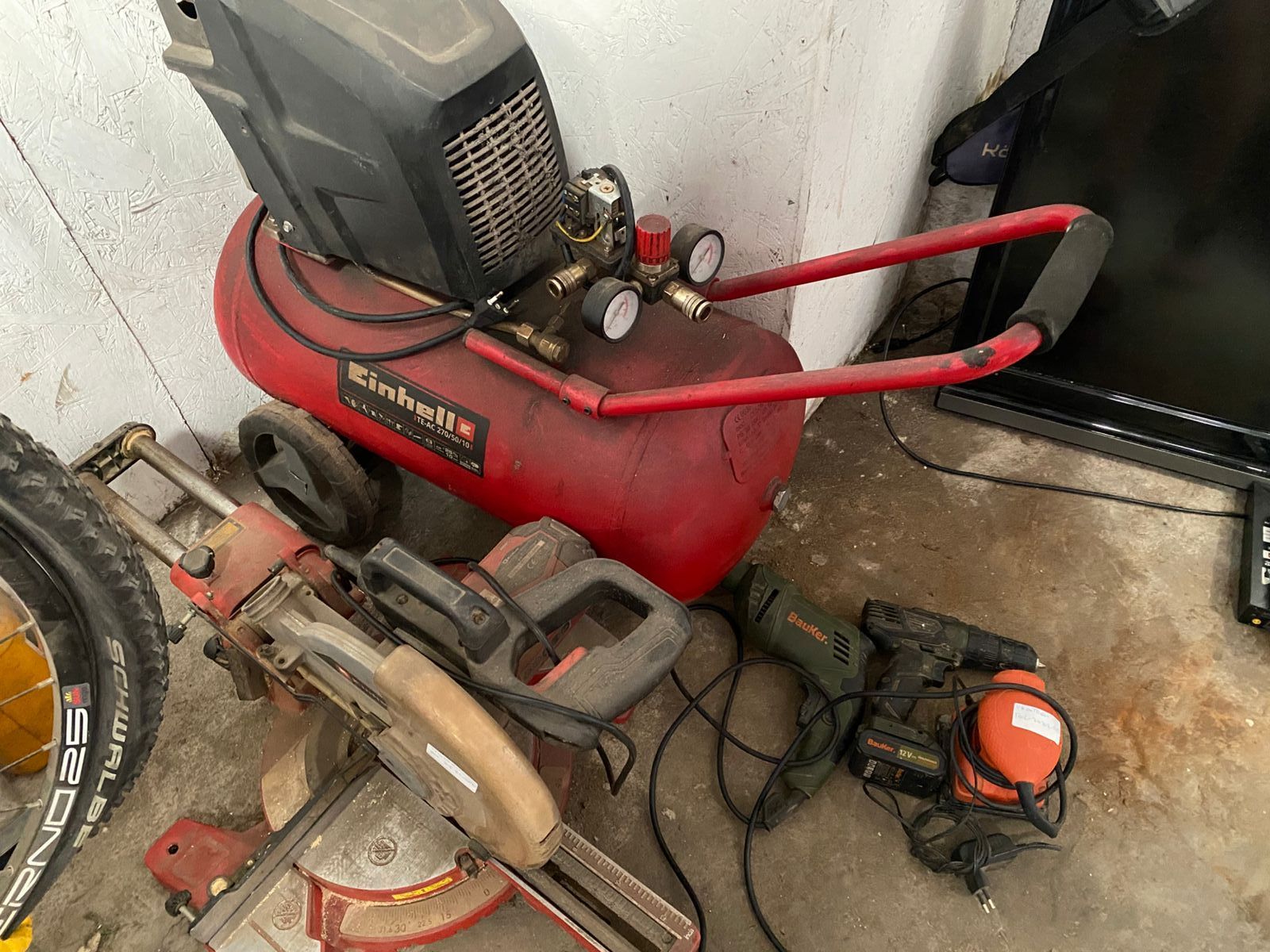 Compresor de aire Einhell rojo. ingleatadora Telescopica einhell gris. Lijadora de mano Blanck&Decker naranja. Taladro inalambrico Bauker verde 650 watts. Taladro inalambrico 12v bauker verde.