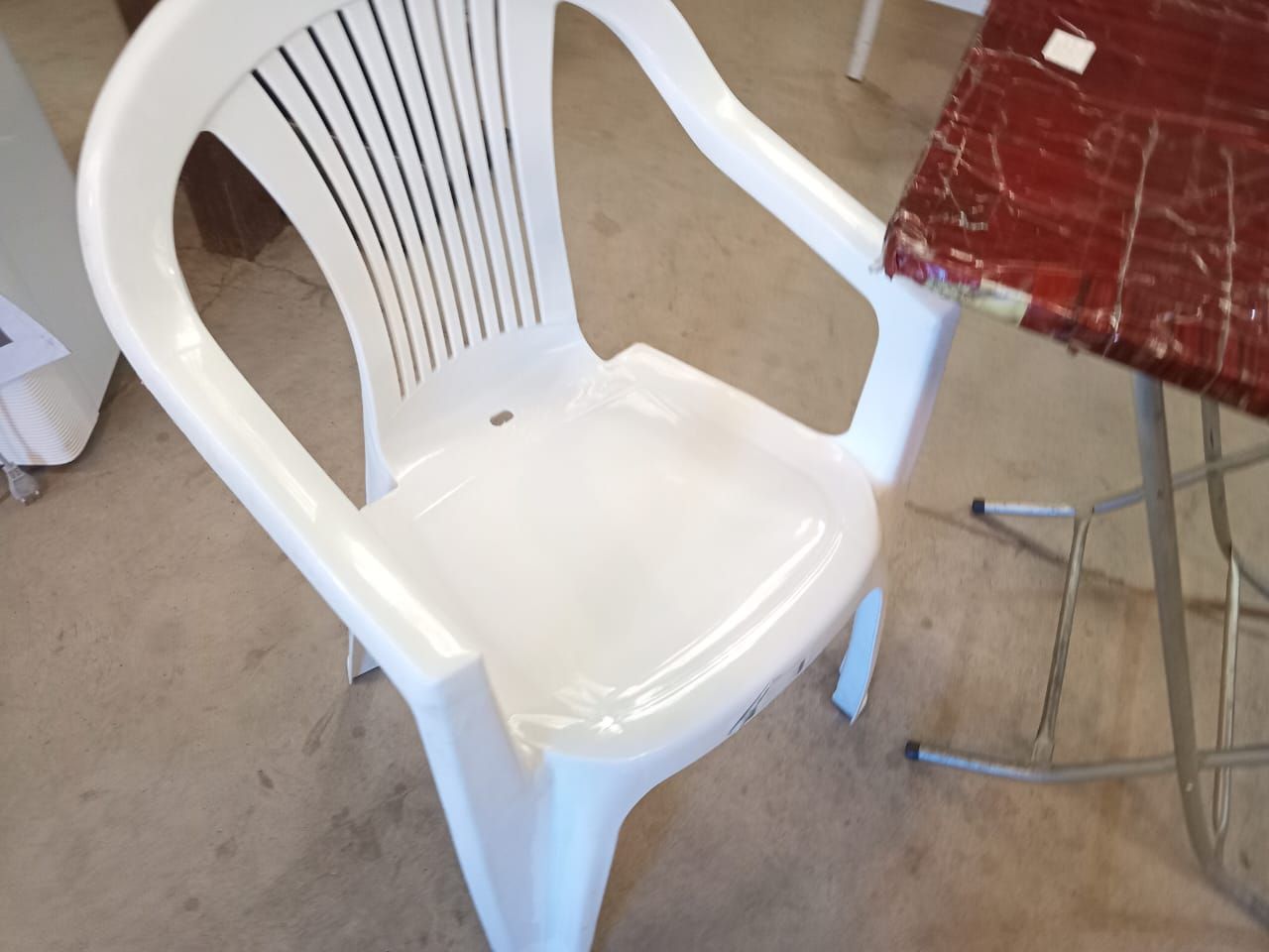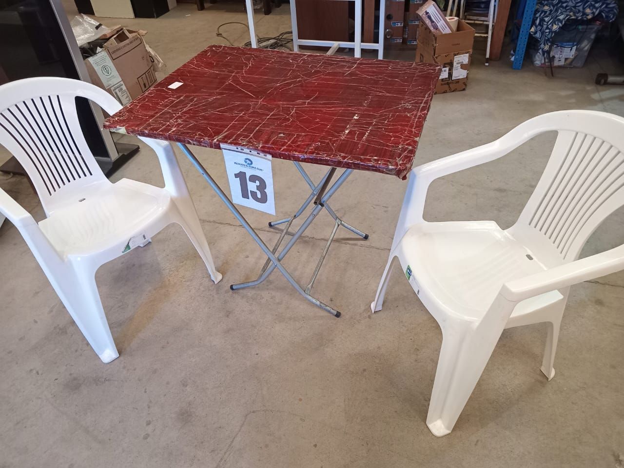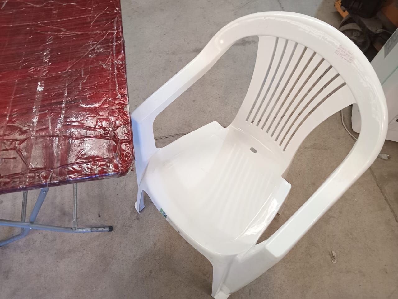 LOTE 13: Sillas plasticas Wenco. Una mesa de café plegable.