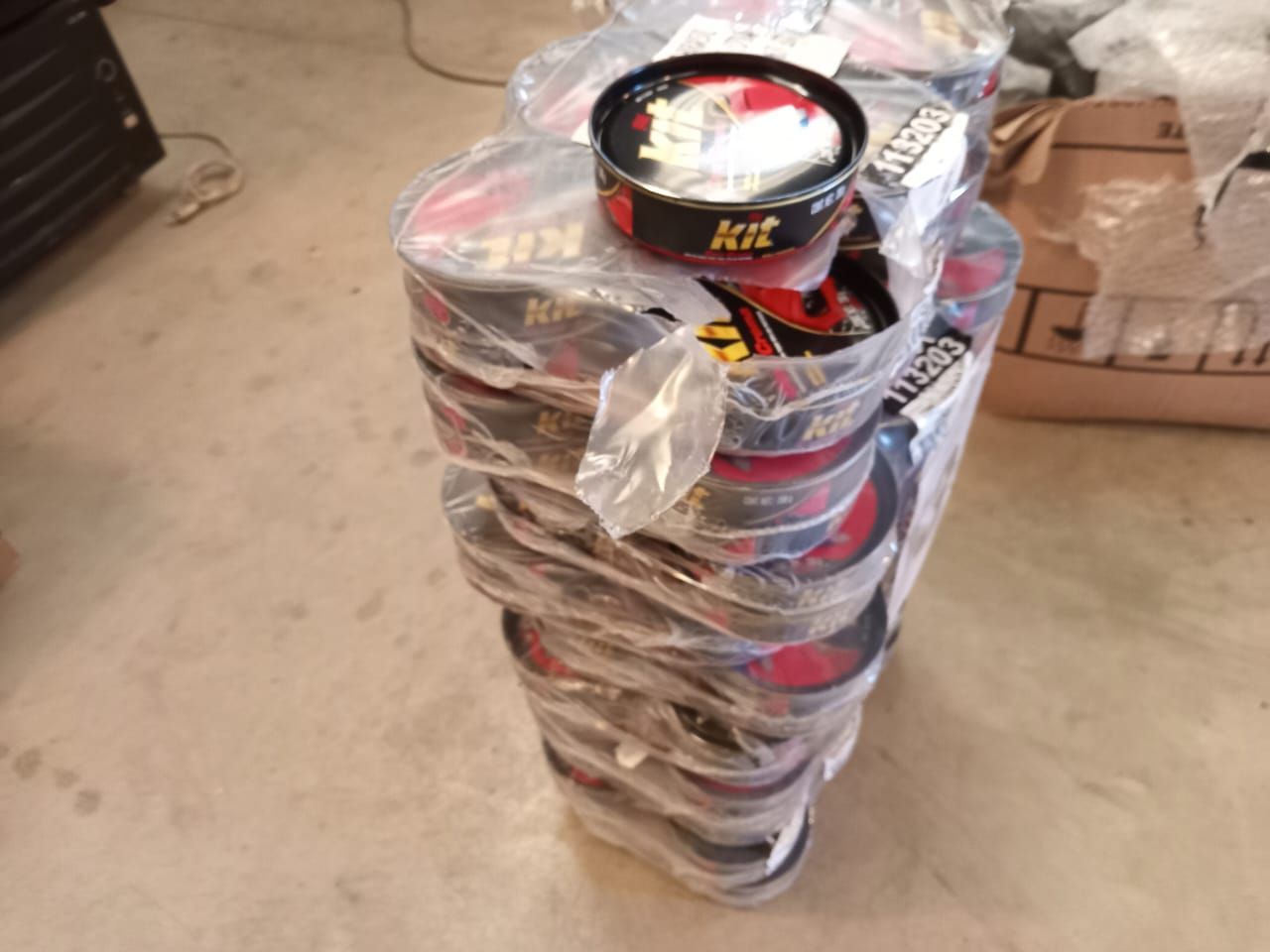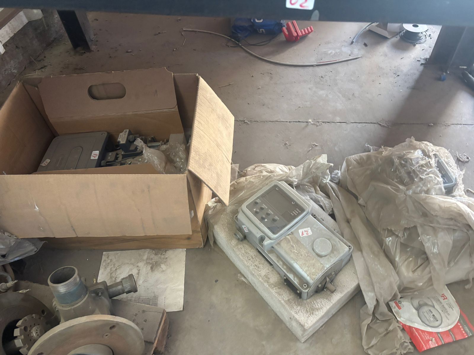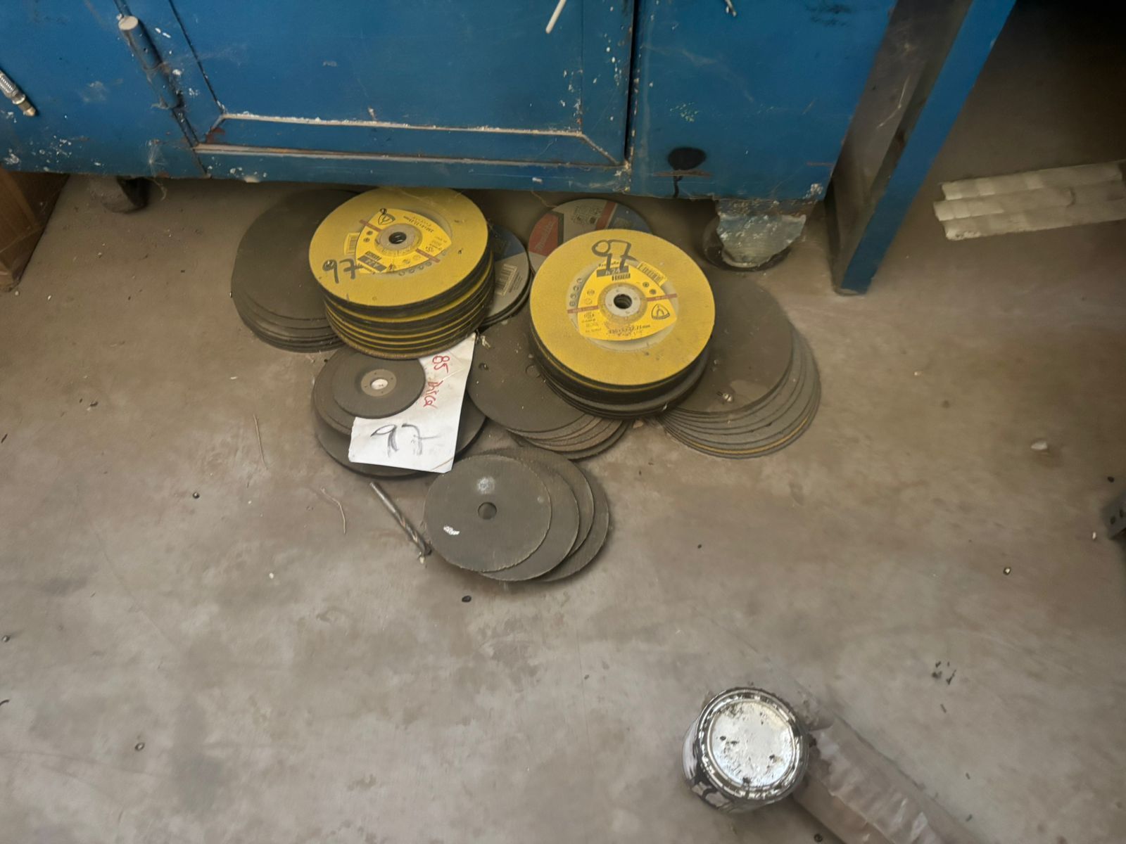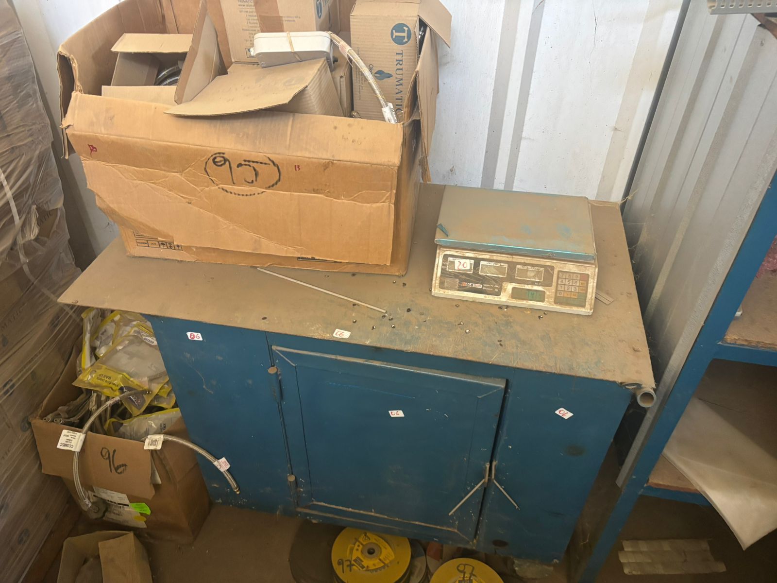 LOTE 87: Cajón Metálico Color Azul Con Ruedas. Una Balanza Electrónica. 265 Sistema Okey Gas. 100 Flexibles Diferentes Medidas. 85 Discos Corte.