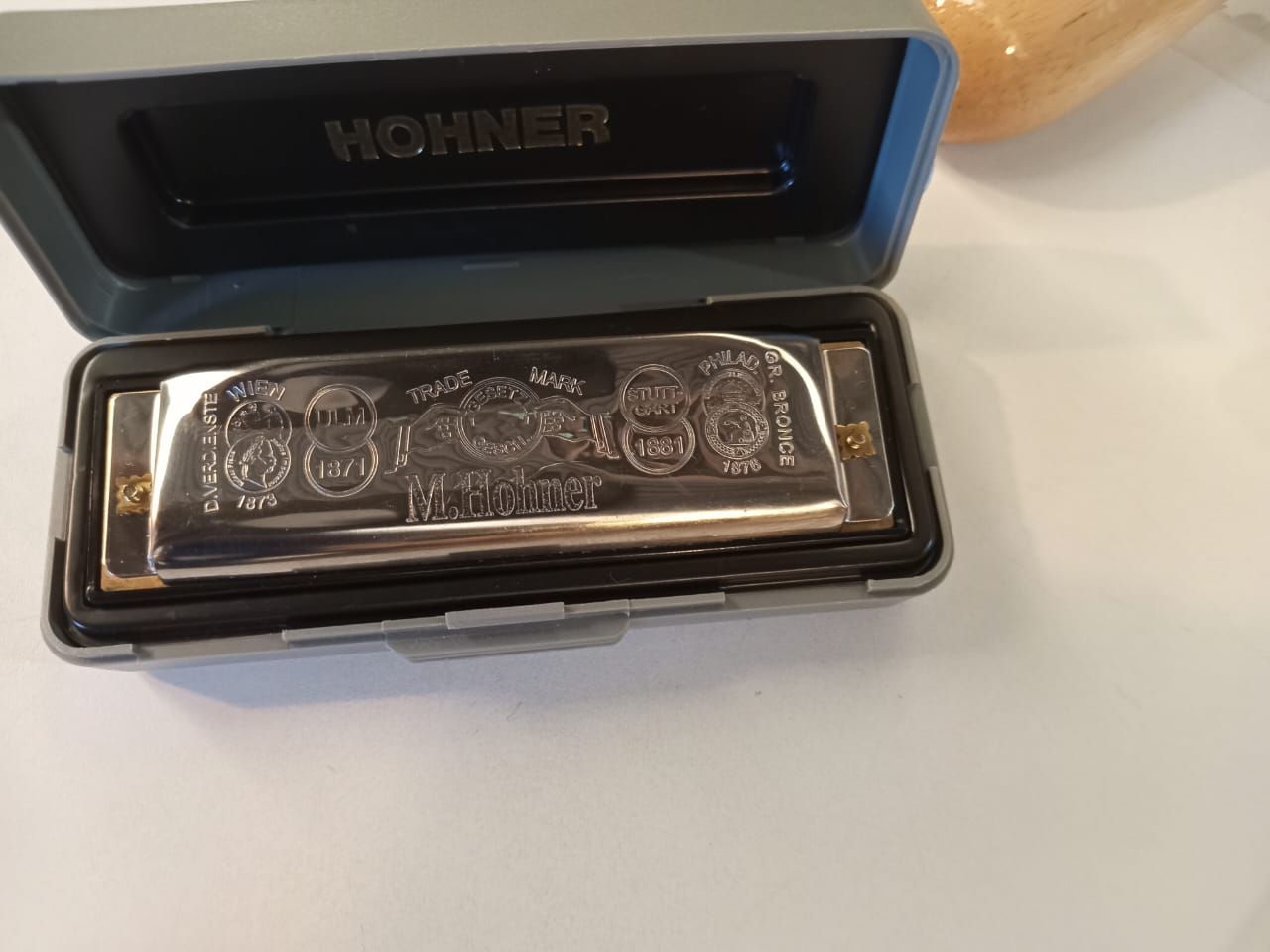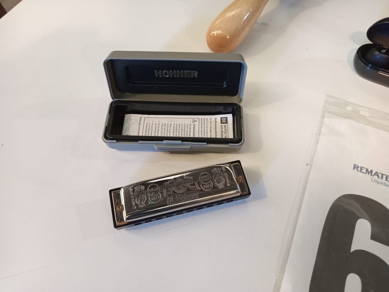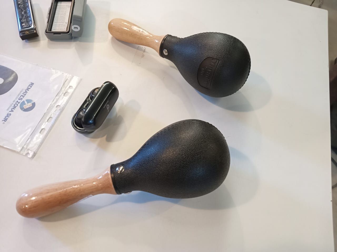 Unos audifonos Anker Soundcore Liberty Neo. Un par de maracas Matador M293. Una armonica Hohner Special 20 "E".