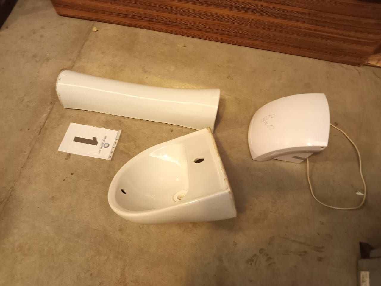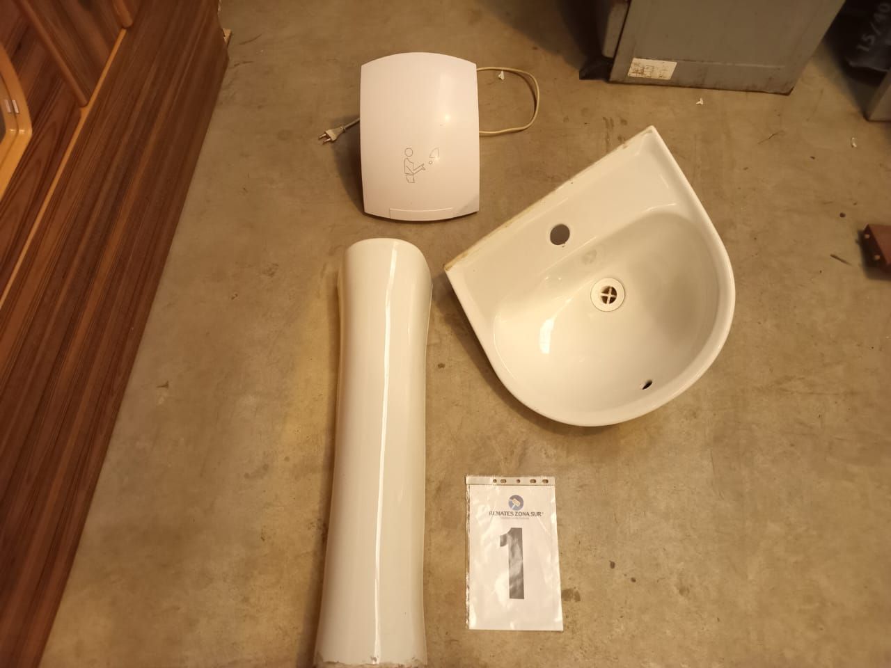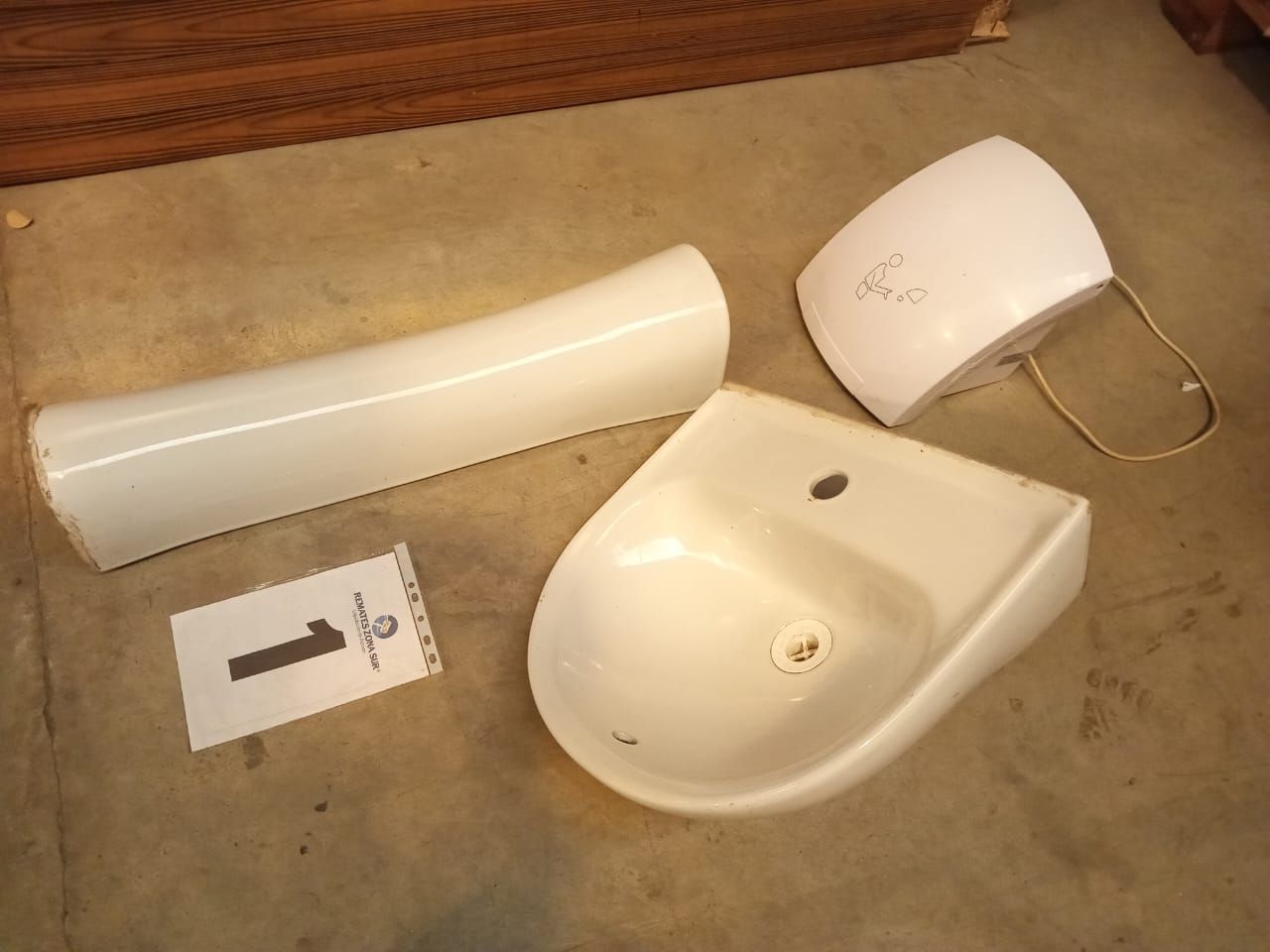 LOTE 01: Un Lavamanos genérico. Un Soporte Lavamanos genérico. Un secador de manos Han Dryer.