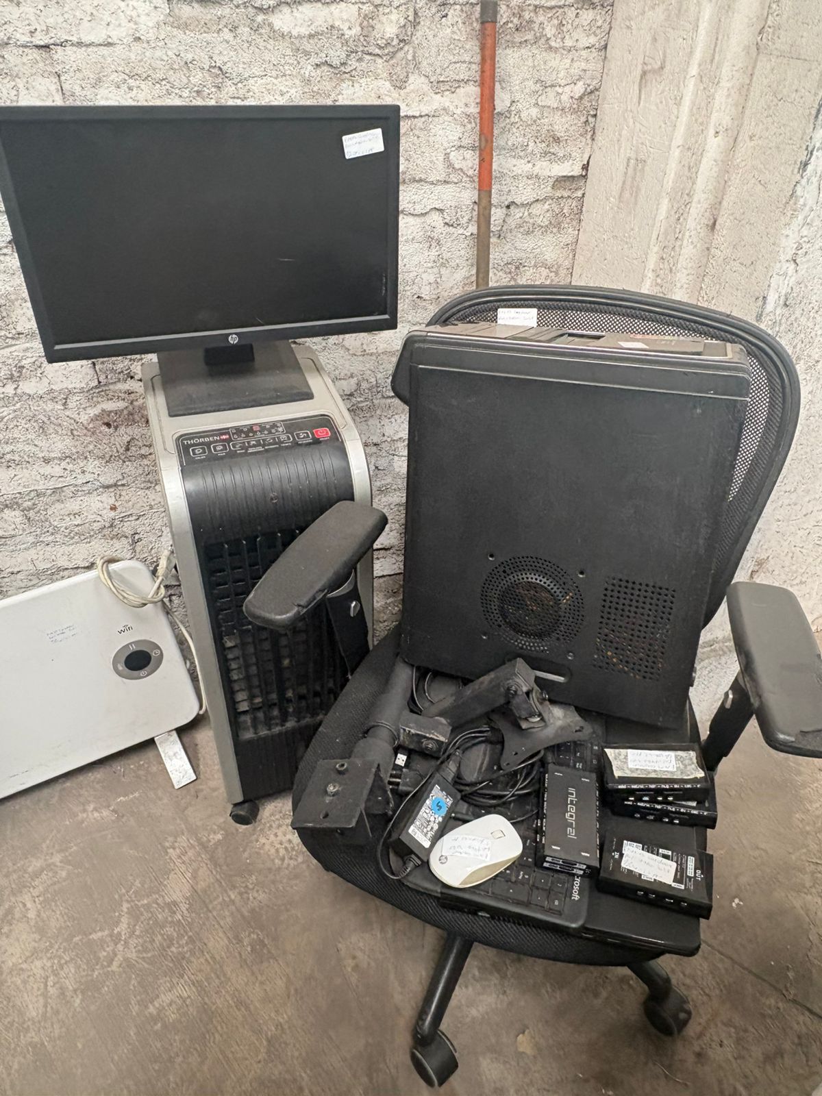 LOTE 103: Un silla de escritorio. Una notebook Dell. Un escritorio. Un calefactor Toyotomi. Un enfriador Torben. Una pantalla PC HP. Un soporte de pantalla. Un PC escritorio. Un teclado ergonomico Microsoft. Un closet. Un televisor 32" Recco. Un calentador de agua Bestway. Un mouse HP. KVM USB 401. Un calefactor Kendal. Una mochila camping National Geographic. Muebles de cocina.. (Retiro En Stgo. De Chile)