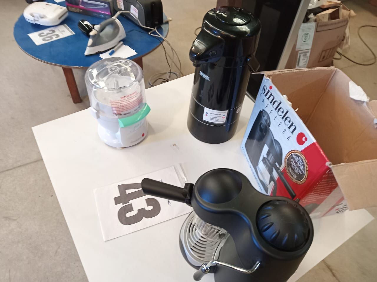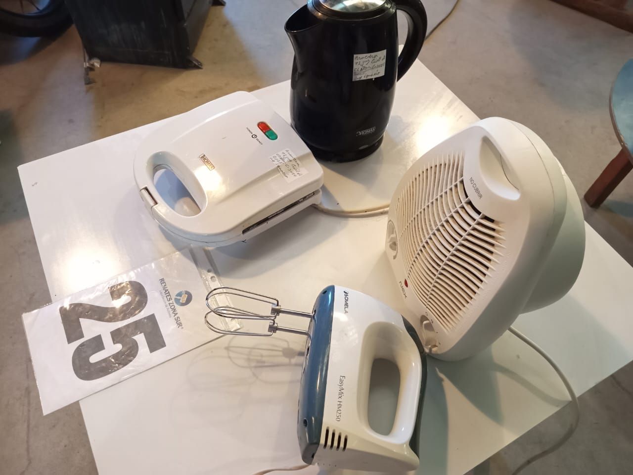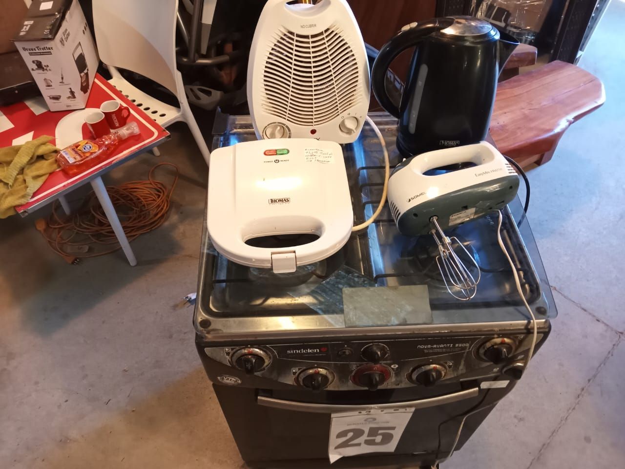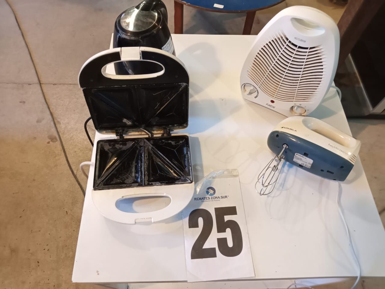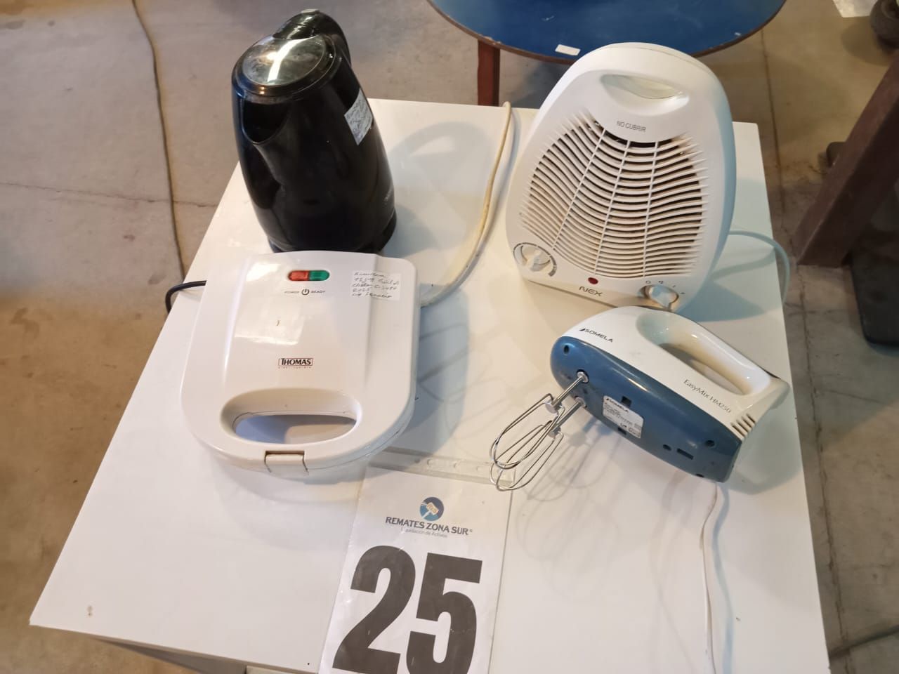 LOTE 25: Una batidora manual, Somela. Una Cocina Sindelen. Un hervidor Thomas. Una sandwichera Thomas. Un termoventilador Nex. (Retiro En Sede Rzs)