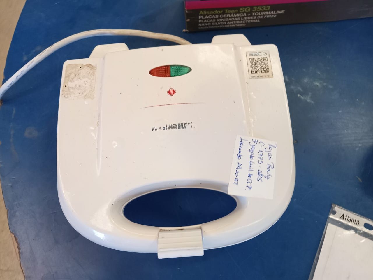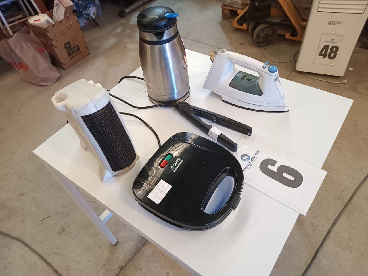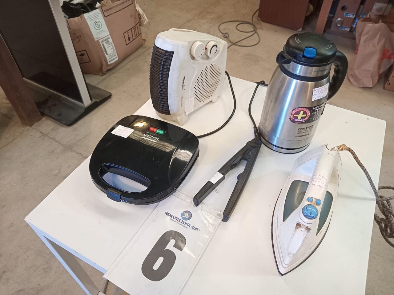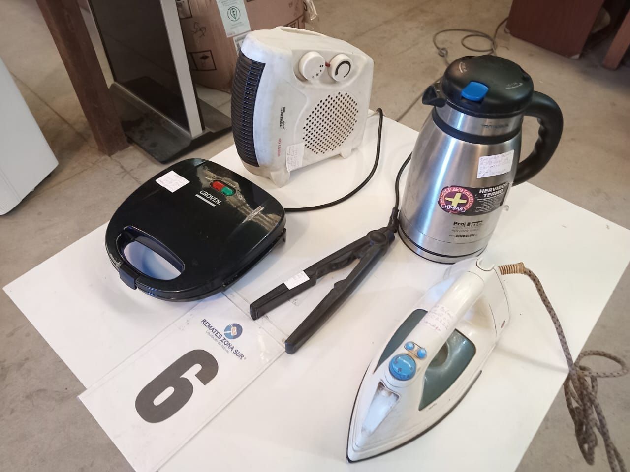 LOTE 06: Un Calefactor Kendal. Un Hervidor Termo Sindelen. Una Plancha De Pelo Láser. Una Plancha Recco. Un Sanguchera Groven. (Retiro en Sede Rzs)