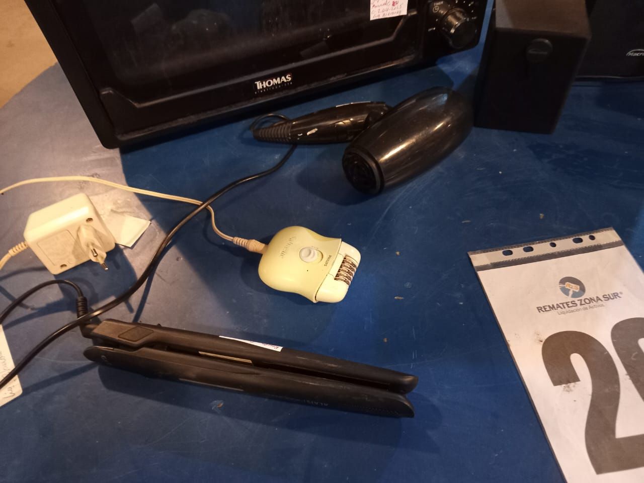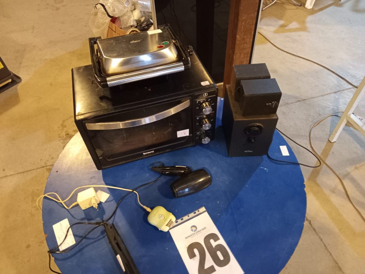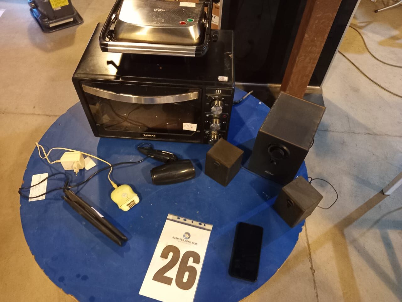 LOTE 26: Un horno electrico Thomas. Un secador de pelo Somela. Una plancha de pelo Gama. Una sandwichera Oster. Un celular Samsung. Una depiladora Philips. Un suboofer macrotel. (Retiro En Sede Rzs)
