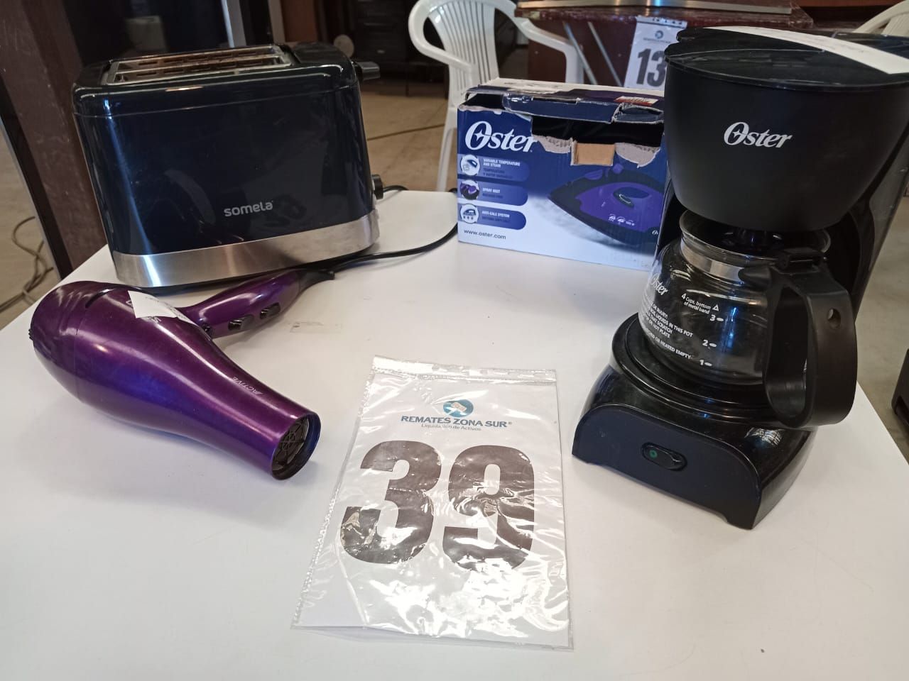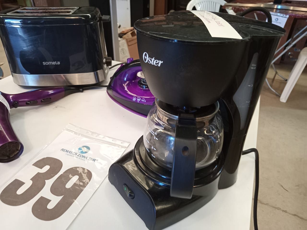LOTE 39: Un Cafetería Oster. Una Plancha de Ropo Oster. Un Tostador Somela. Un Secador de Pelo Siegen.