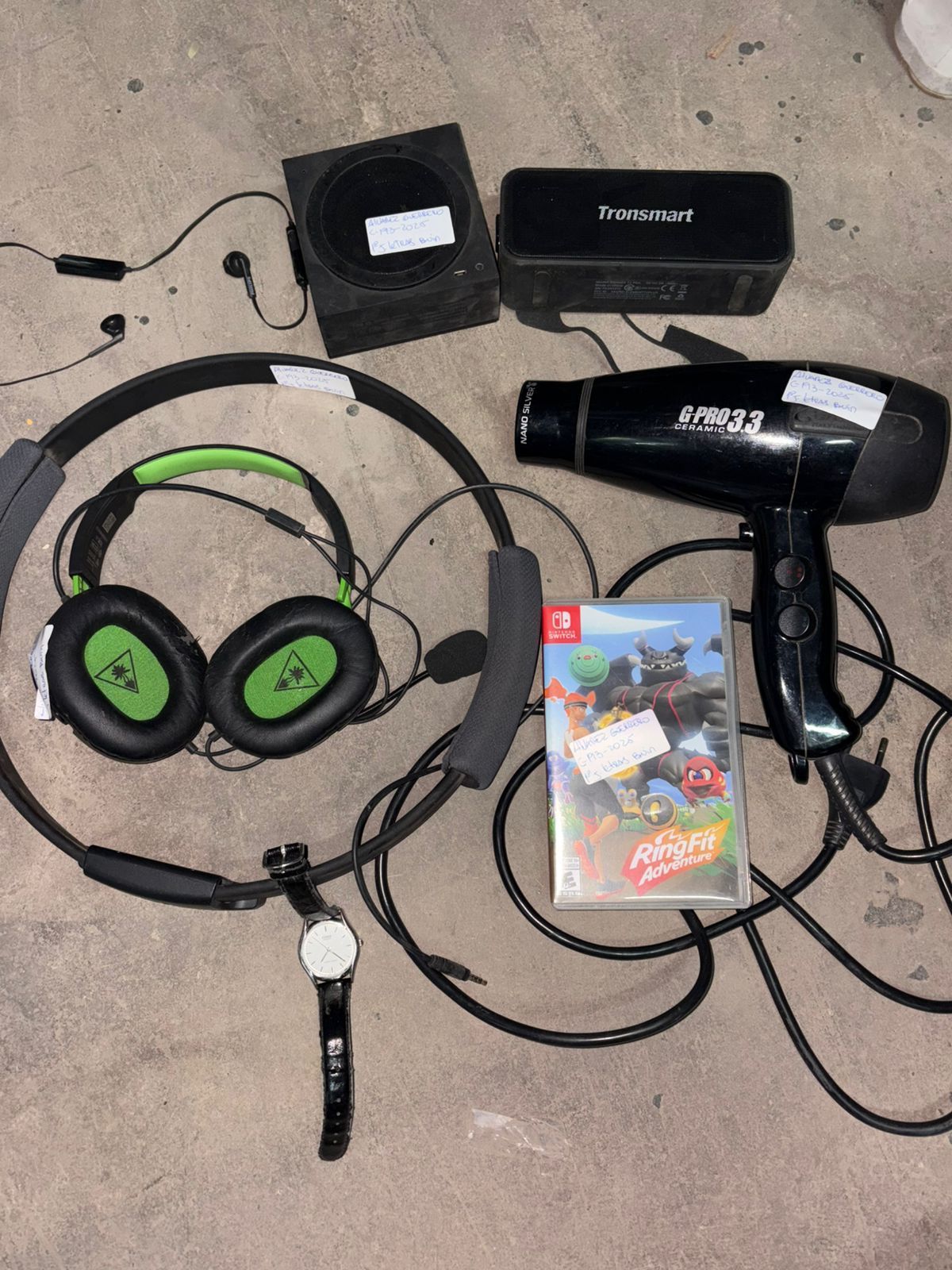 LOTE 95: Un accesorio de consola de nintendo Switch. Unos audifonos Gamer Recon. Unos audifonos inalambrico Philips. Un parlante Divoon. Un parlante Tronsmart. Un reloj Casio. Un reloj swatch sin cargador. Un reproductor mp3 sin audifonos. Un secador de pelo.