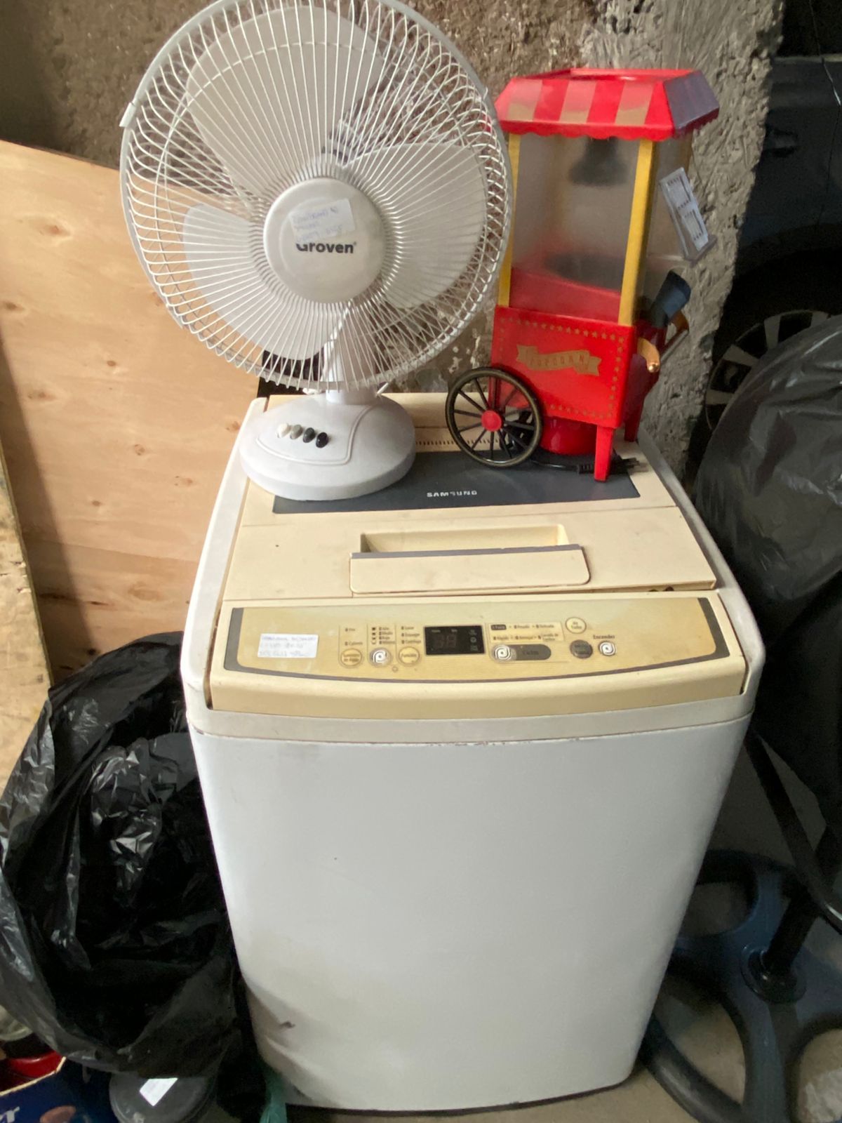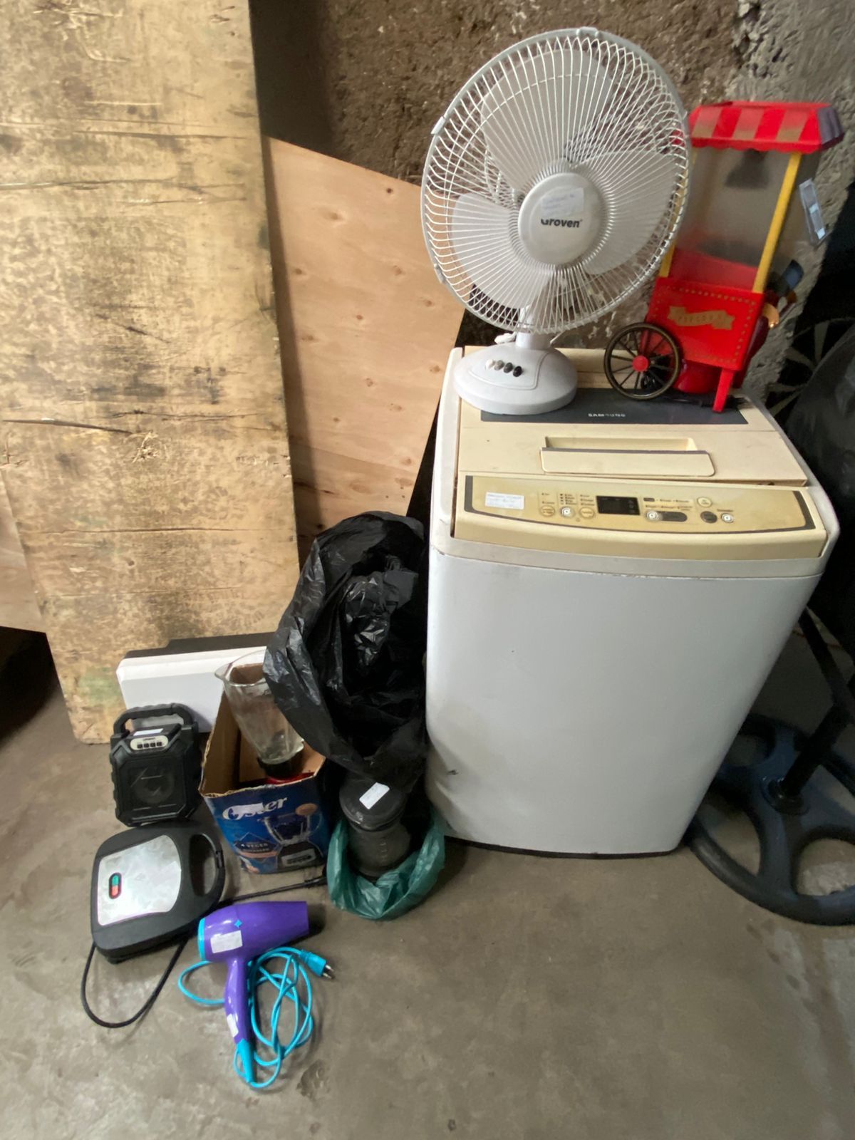 LOTE 98: Una lavadora 6kg Samsung. Un parlante urbano inlambrico. Un ventilador Groven. Un aire termico para el frio electrico. Una licuadora Oster. Una cotufera electrica Thomas. Un secador de cabello GAMA. Una cafetera electrica Thomas. Una sandwichera Recco. Un ventilador grande. (Retiro en Stgo. De Chile)