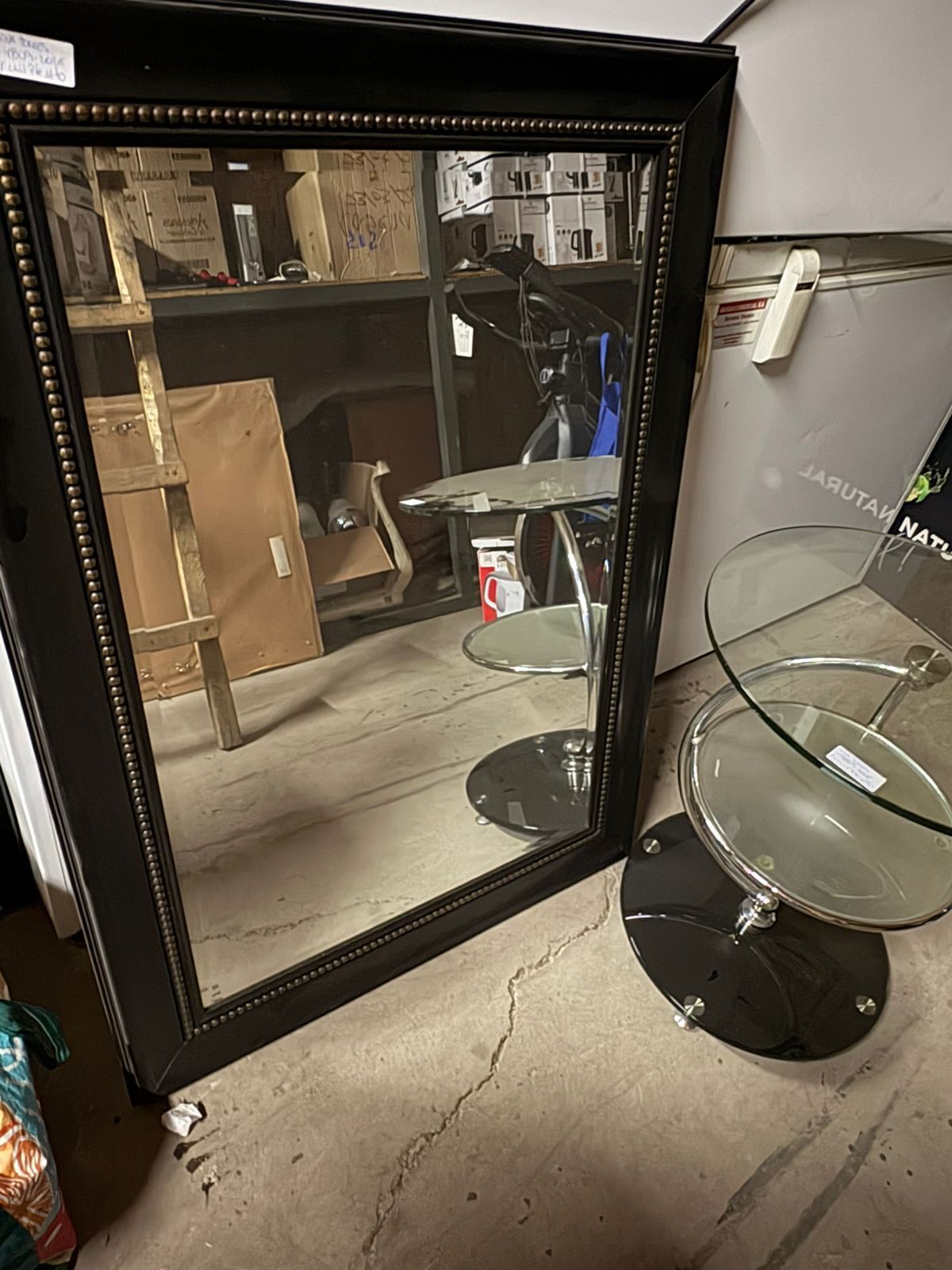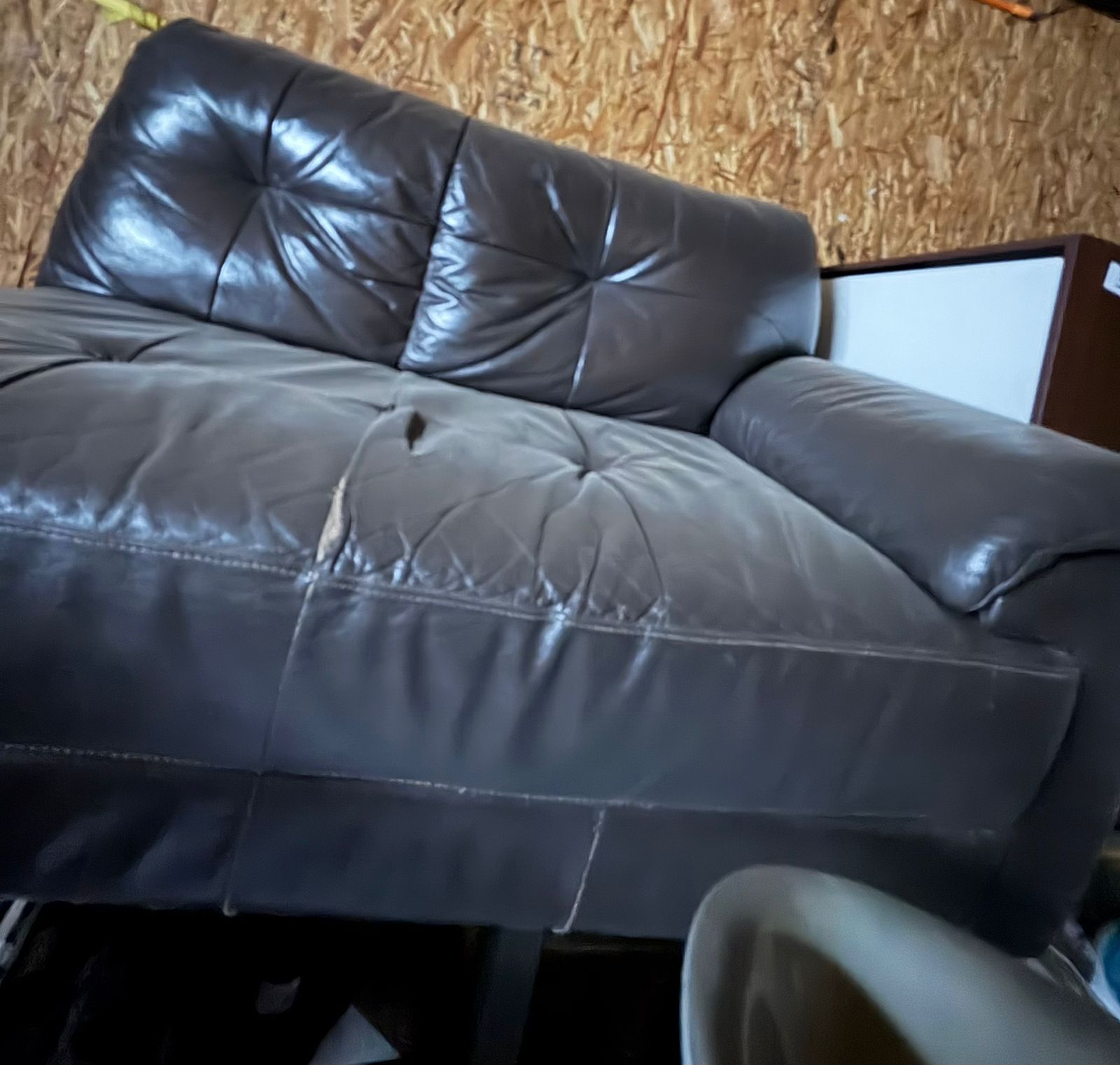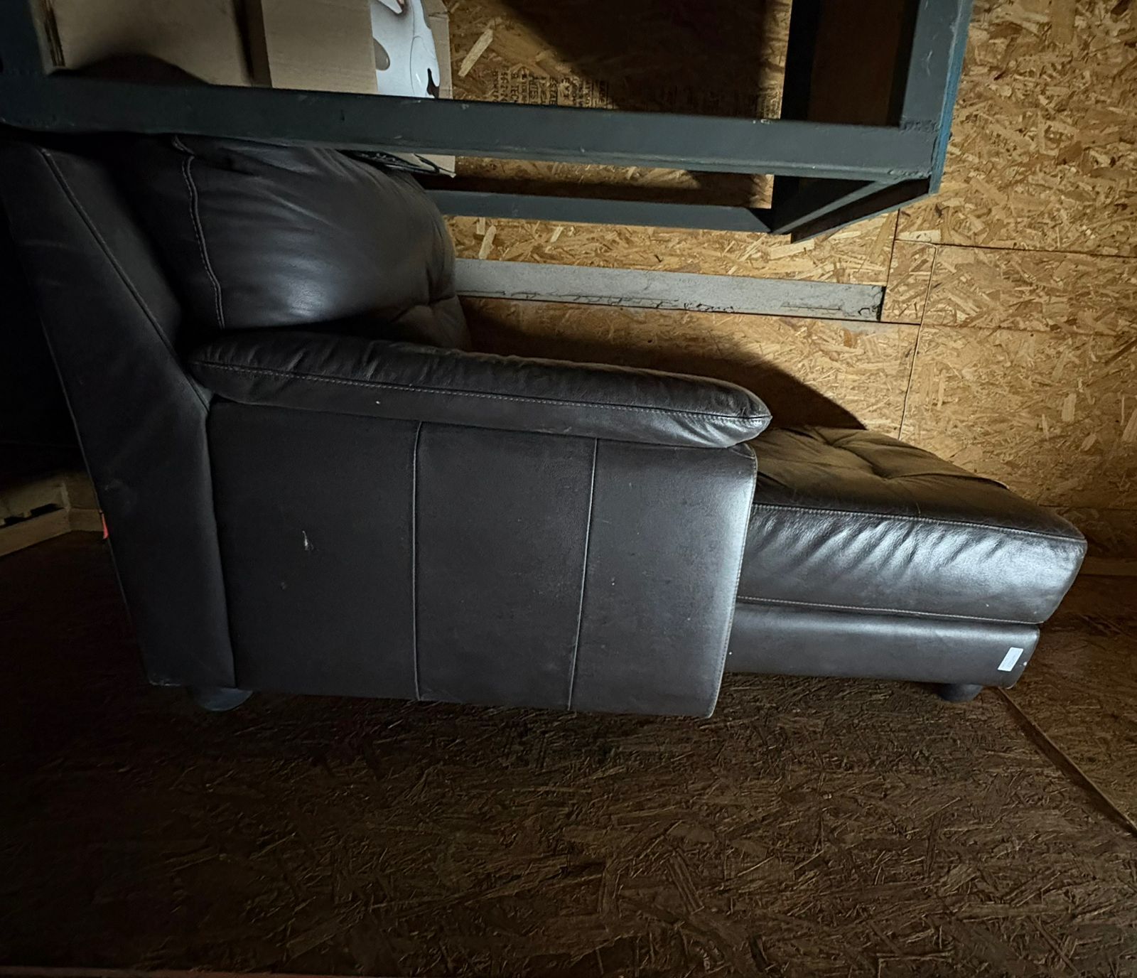 LOTE 106: Un container. Una mesa esquinera. Un espejo de pared. Un sofa de cuero. (Retiro En Stgo. De Chile)