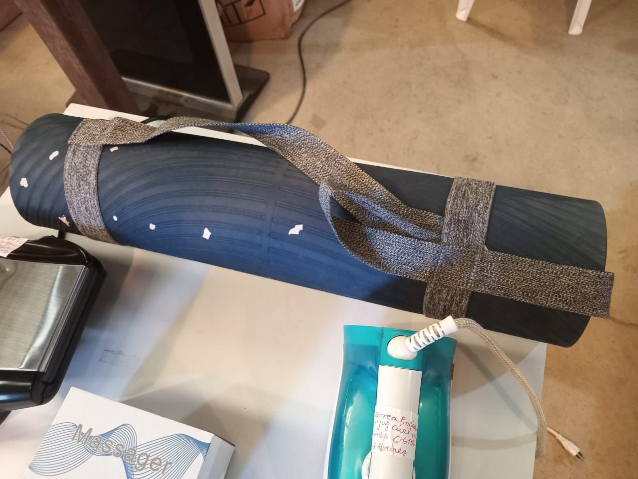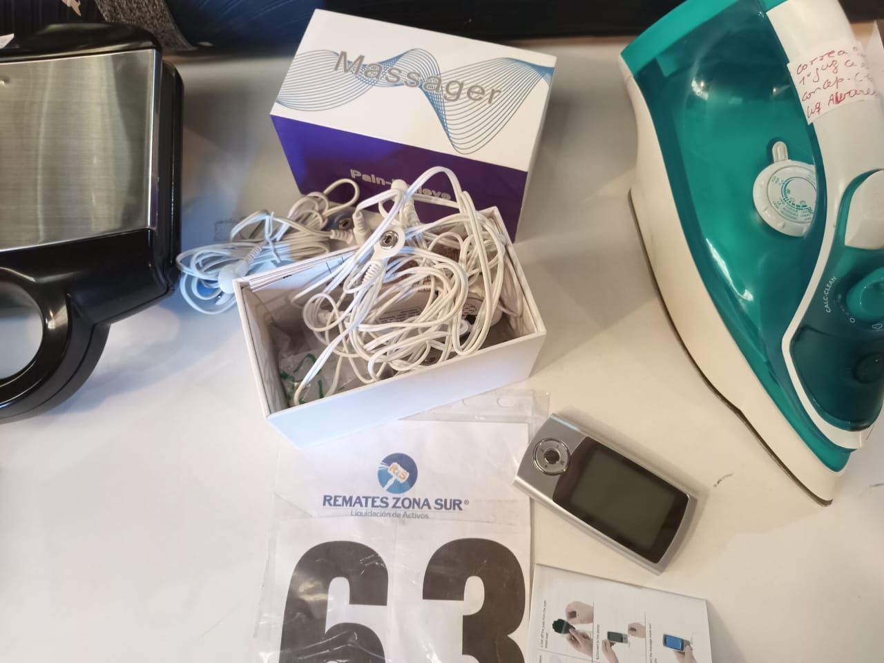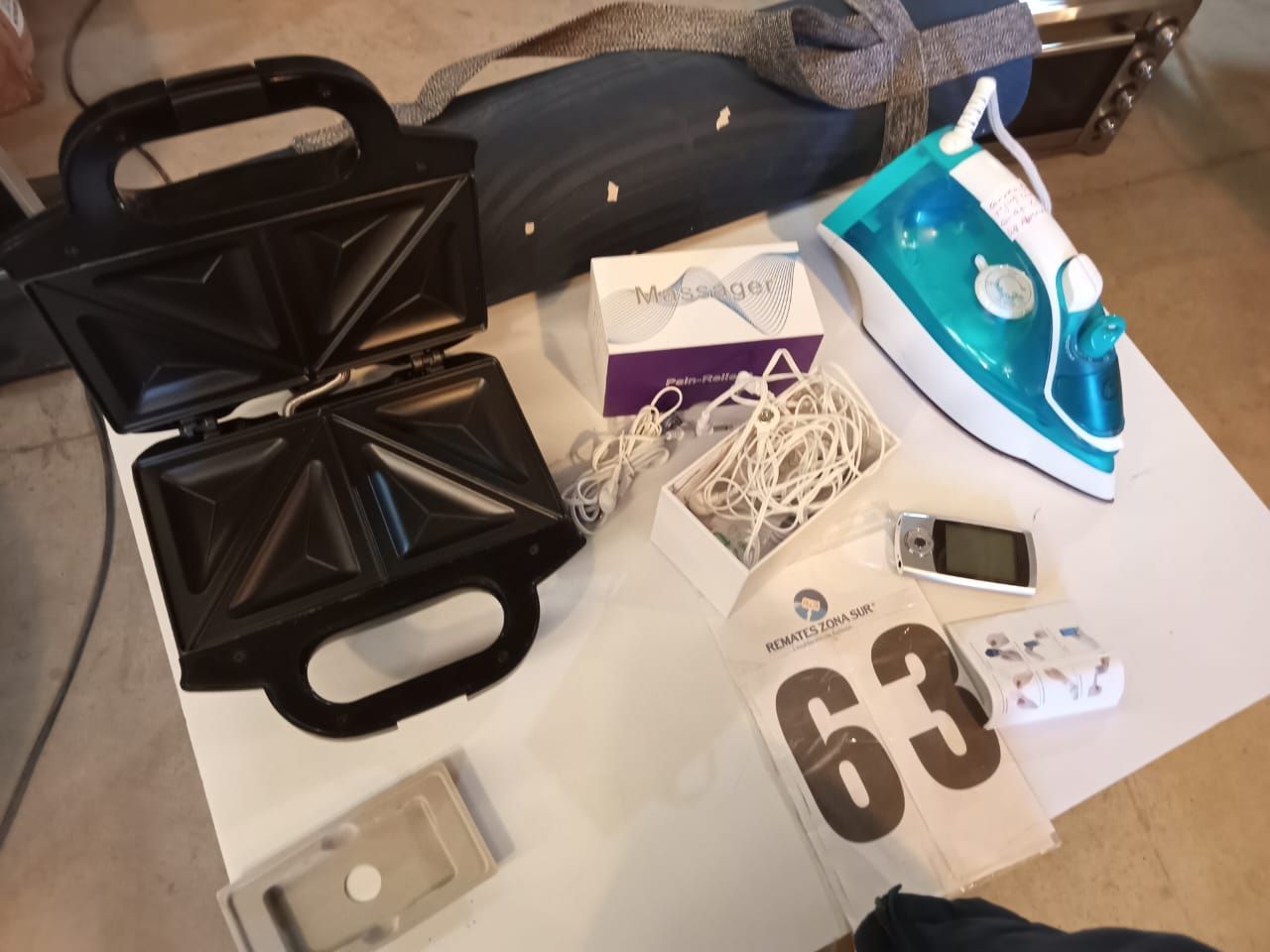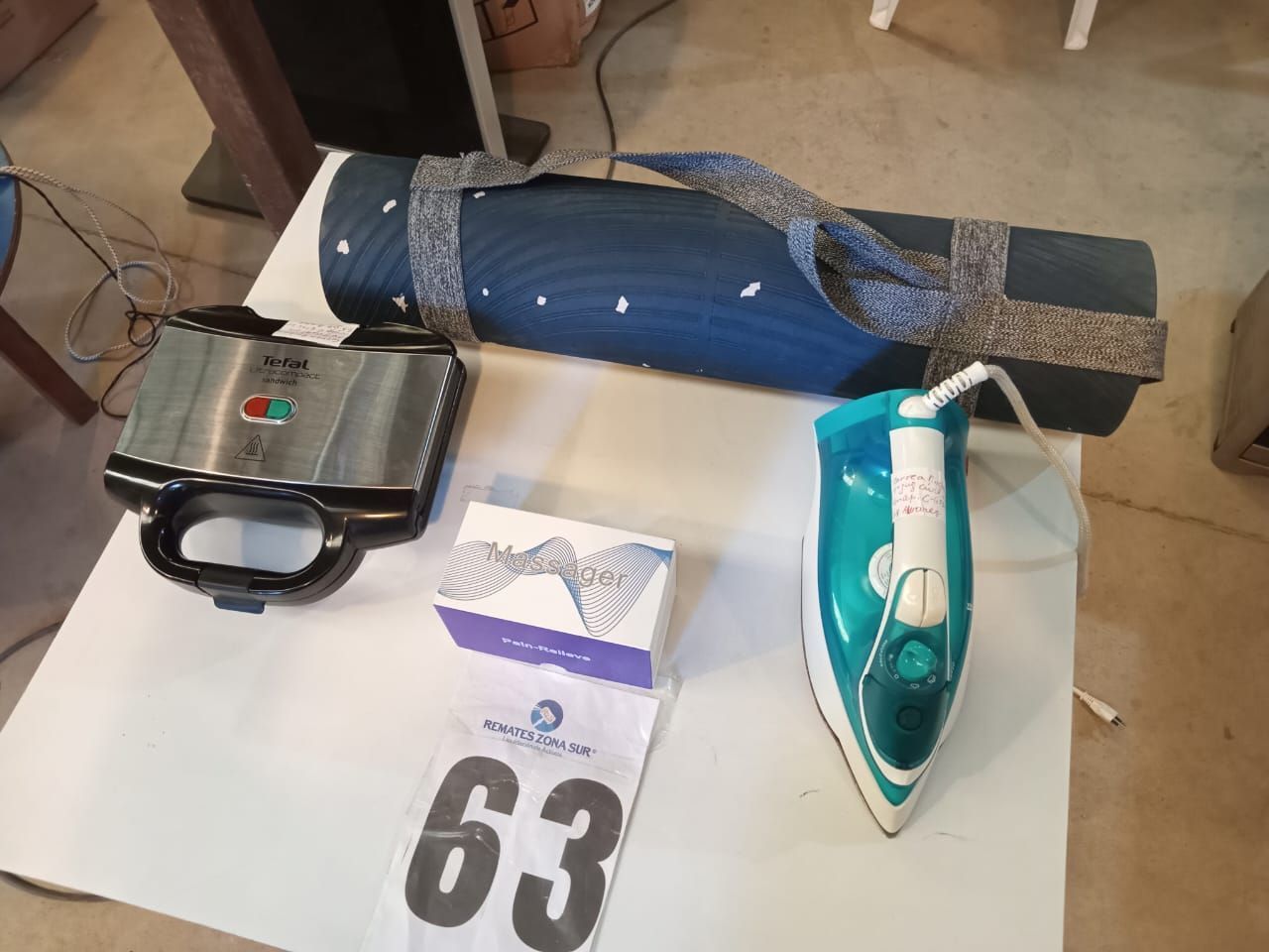 LOTE 63: Una Sandwichera Tefal Ultracompact 9000 isl. Una plancha Phillips GC2520. Un masajeador electrico MH-1080. Un mat yoga Kimjaly.