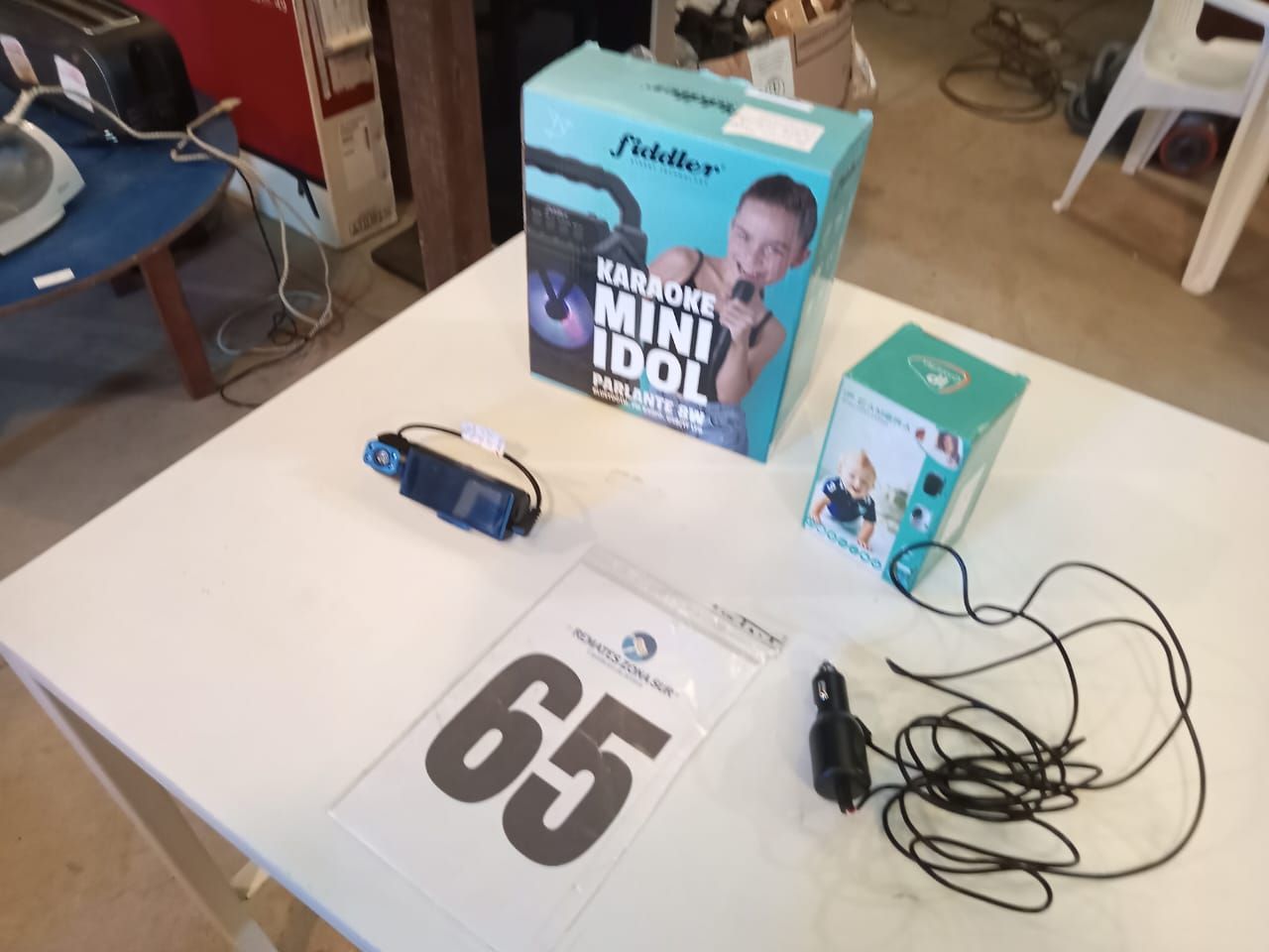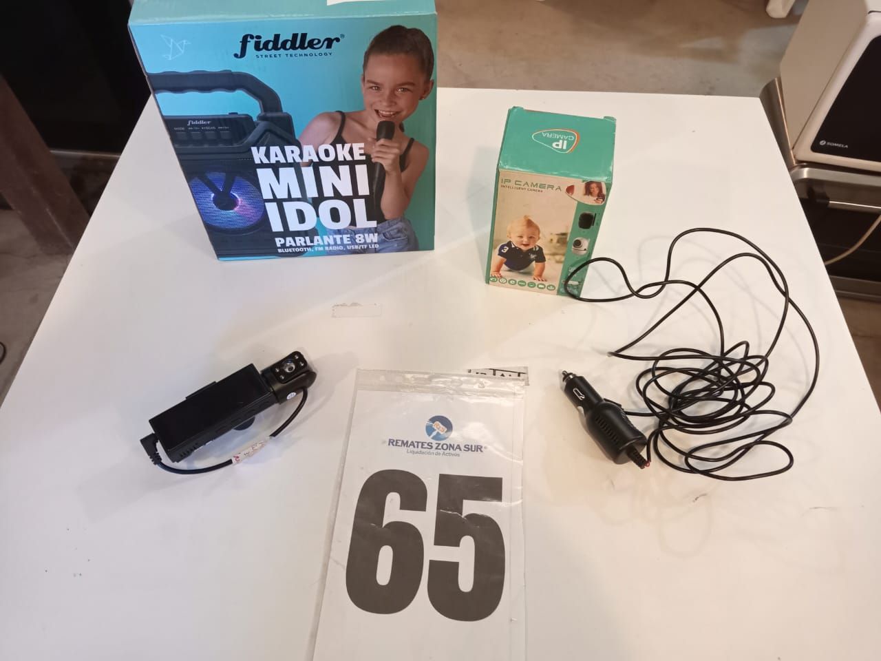 Una camara de vigilancia inteligente Ourlife. Una camara de coche dual ZK Cam Spy. Un karaoke mini idol Fiddler.