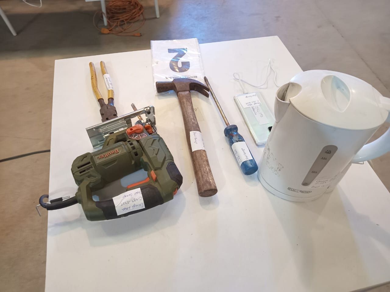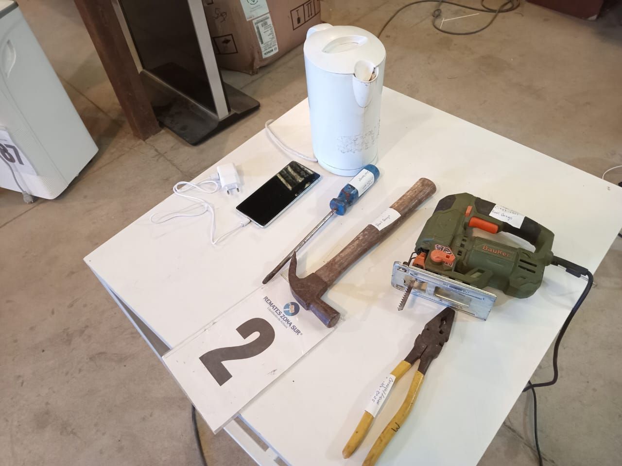 LOTE 02: Un Martillo genérico. Un Alicate Genérico. Un Desatornillador genérico. Un Sierra Caladora Bauker. Un Hervidor Black And Decker. Un celular Samsung S10. (Retiro en Sede Rzs)