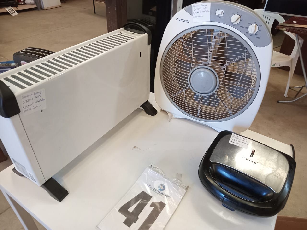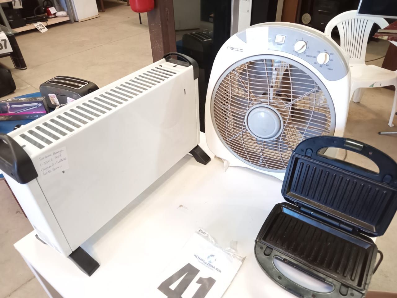 Un electroventilador Recco. Un calefactor eléctrico Kendal. Una sandwichera eléctrica Haeger. Derechos sociales sobre Sociedad Kinean Spa. (Retiro En Sede Rzs)