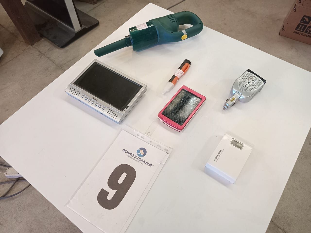 LOTE 09: Un cargador universal Power Bank. Un cargador solar 10,000 Mah DM. Un inversor de corriente alterna 150watt, 17EV35D. Un medidor de corriente alterna. Una mini aspiradora. Un mini TV Hitech. (Retiro en Sede Rzs)