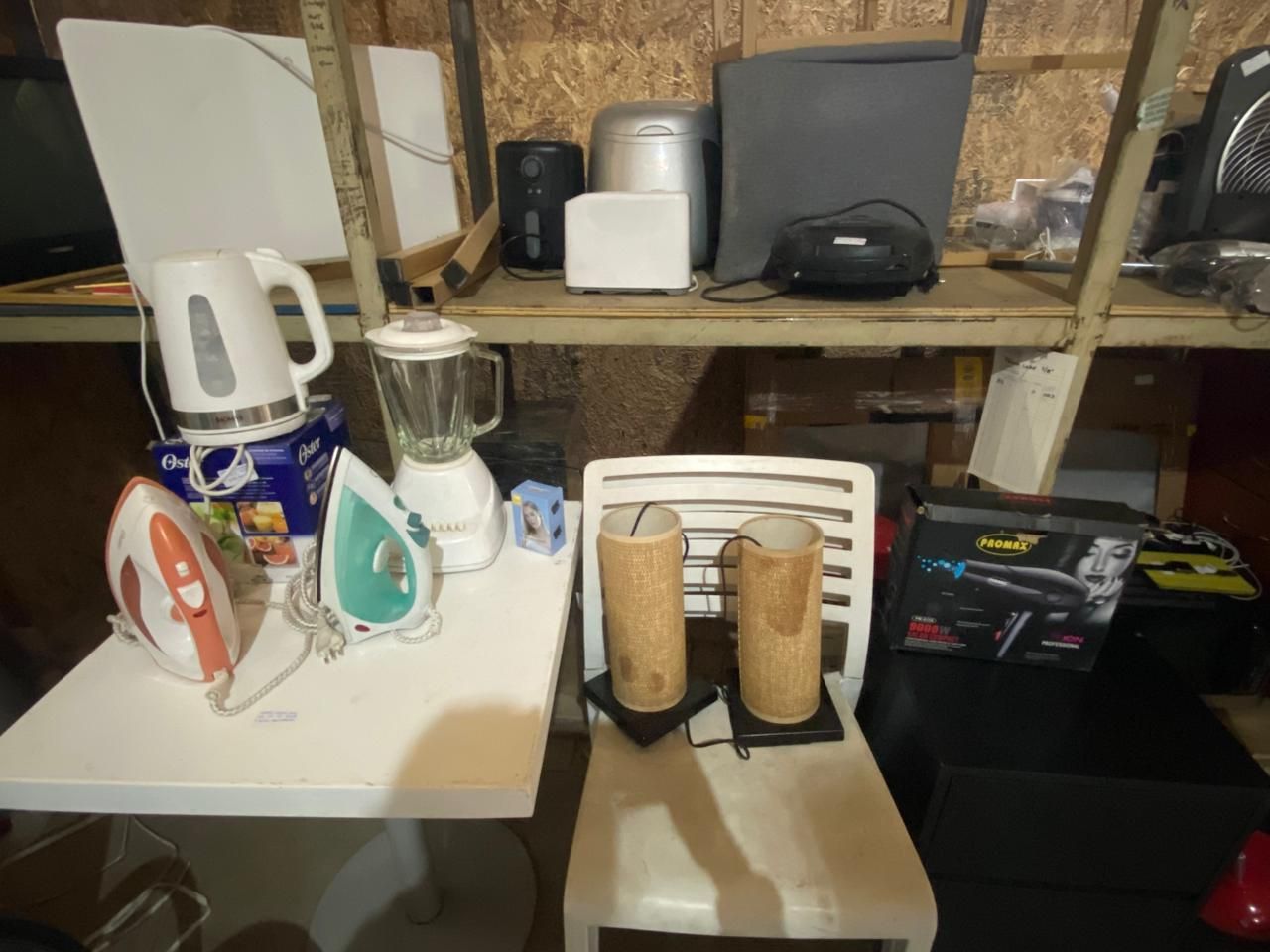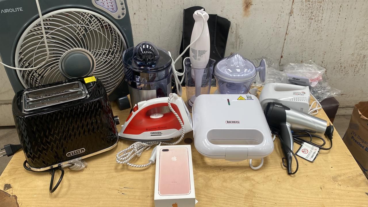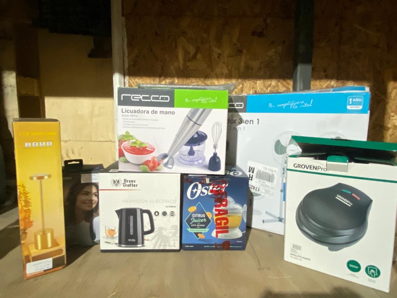 LOTE 127: 02 Velador. Secador de pelo. Mesa para terraza. 02 Sillas terraza. Juguera recco. Hervidor Recco. Maquina para hacer hielo. Tostiarepas Oster. 02 Plancha de ropa. Tostador de pan. Calefactor. Mesa de Comedor. 02 Sillas de Comedor. 02 lamparas de velador. Extractor de jugo. Audifonos inalambrico. (Retiro En Stgo. De Chile)