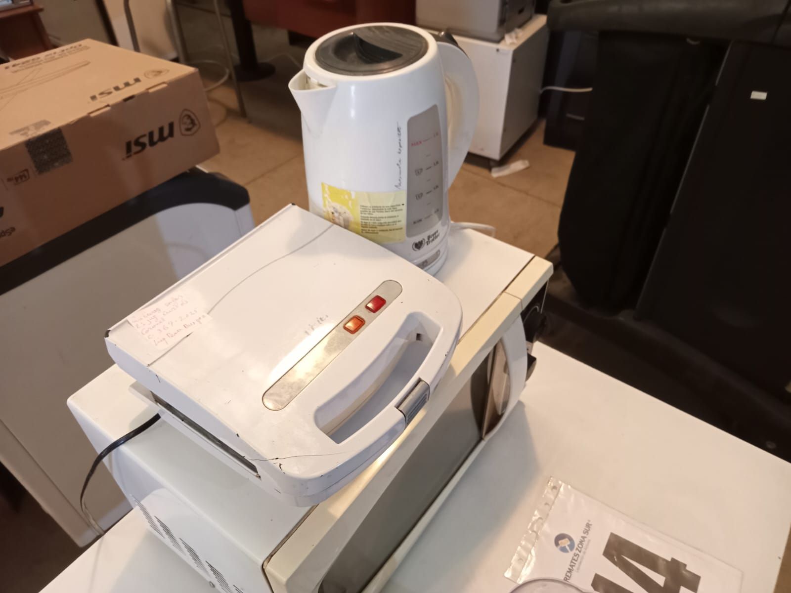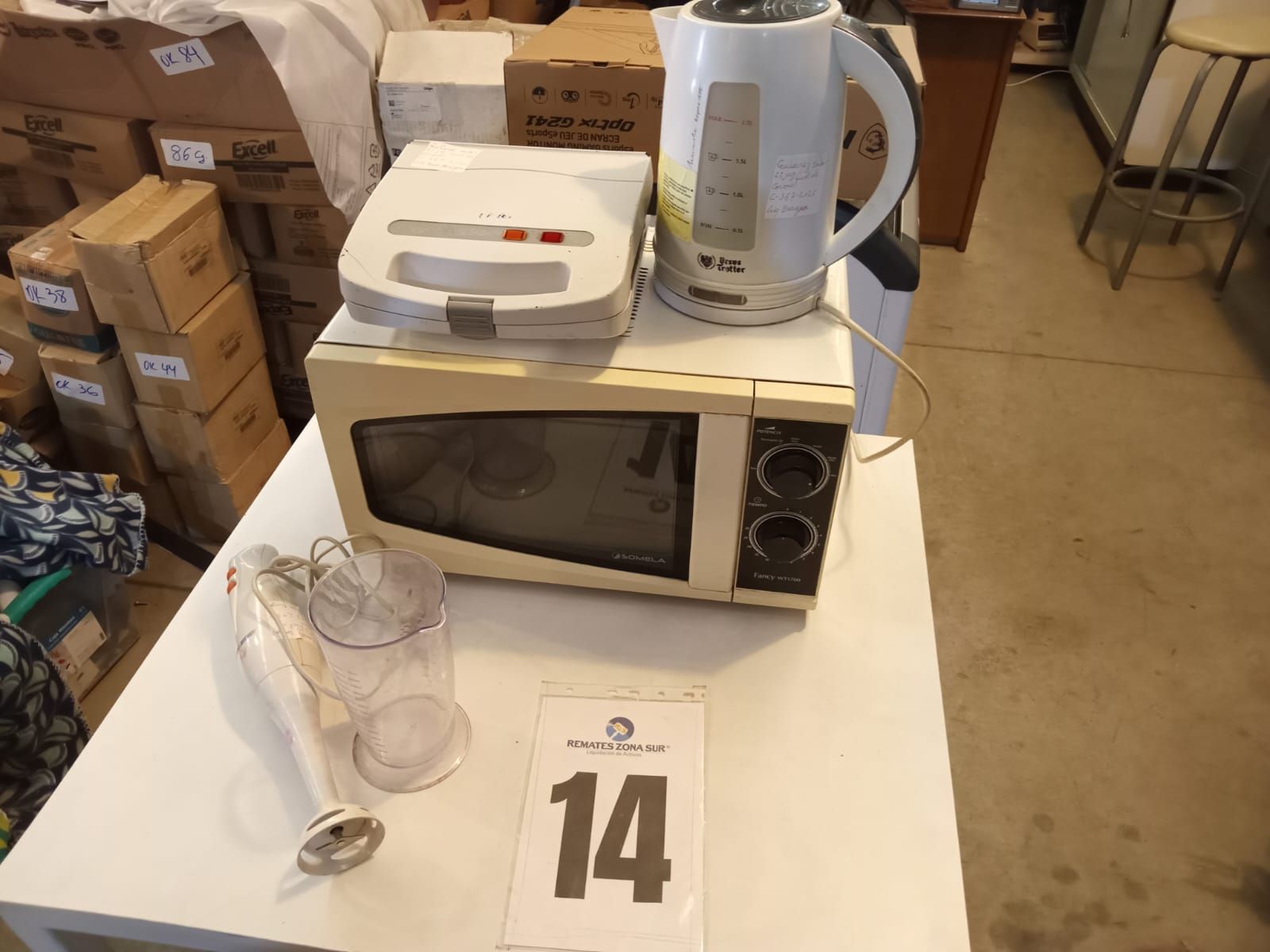 LOTE 14: Batidora manual con vaso Sindelen. Hervidor Ursus Trotter. Sandwichera Oster. Microondas Somela. (Retiro Sede RZS)