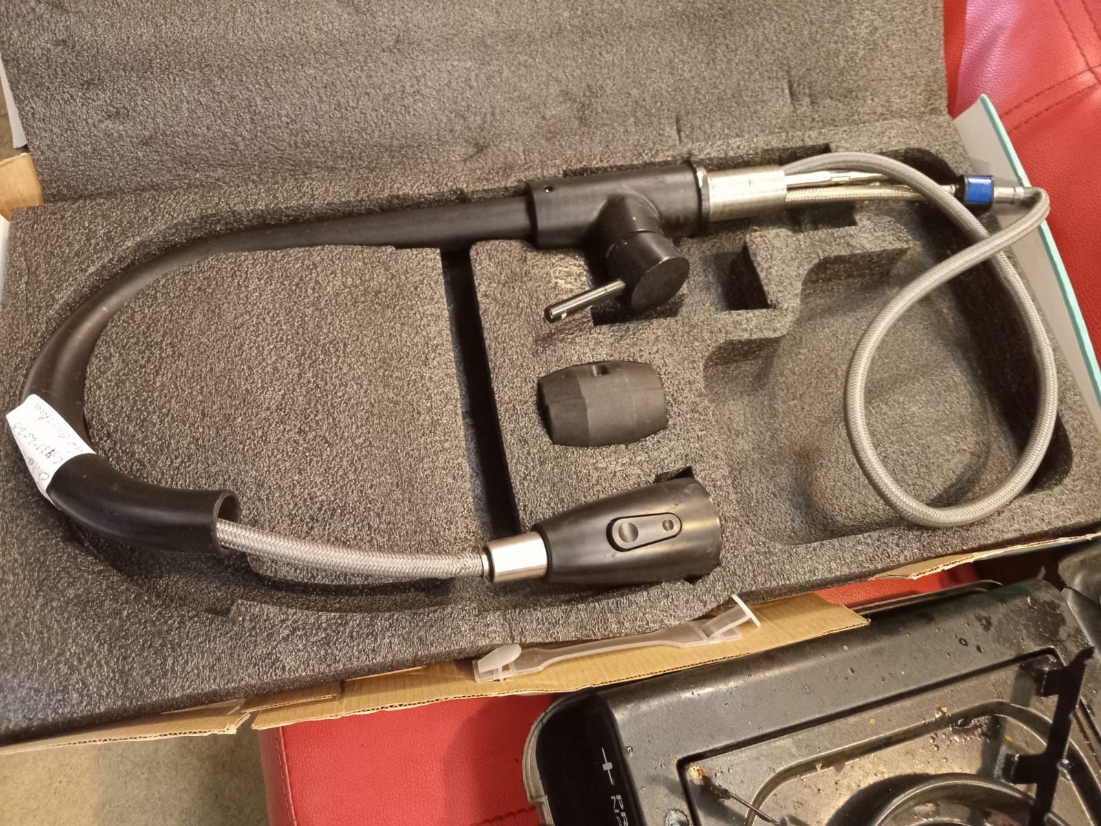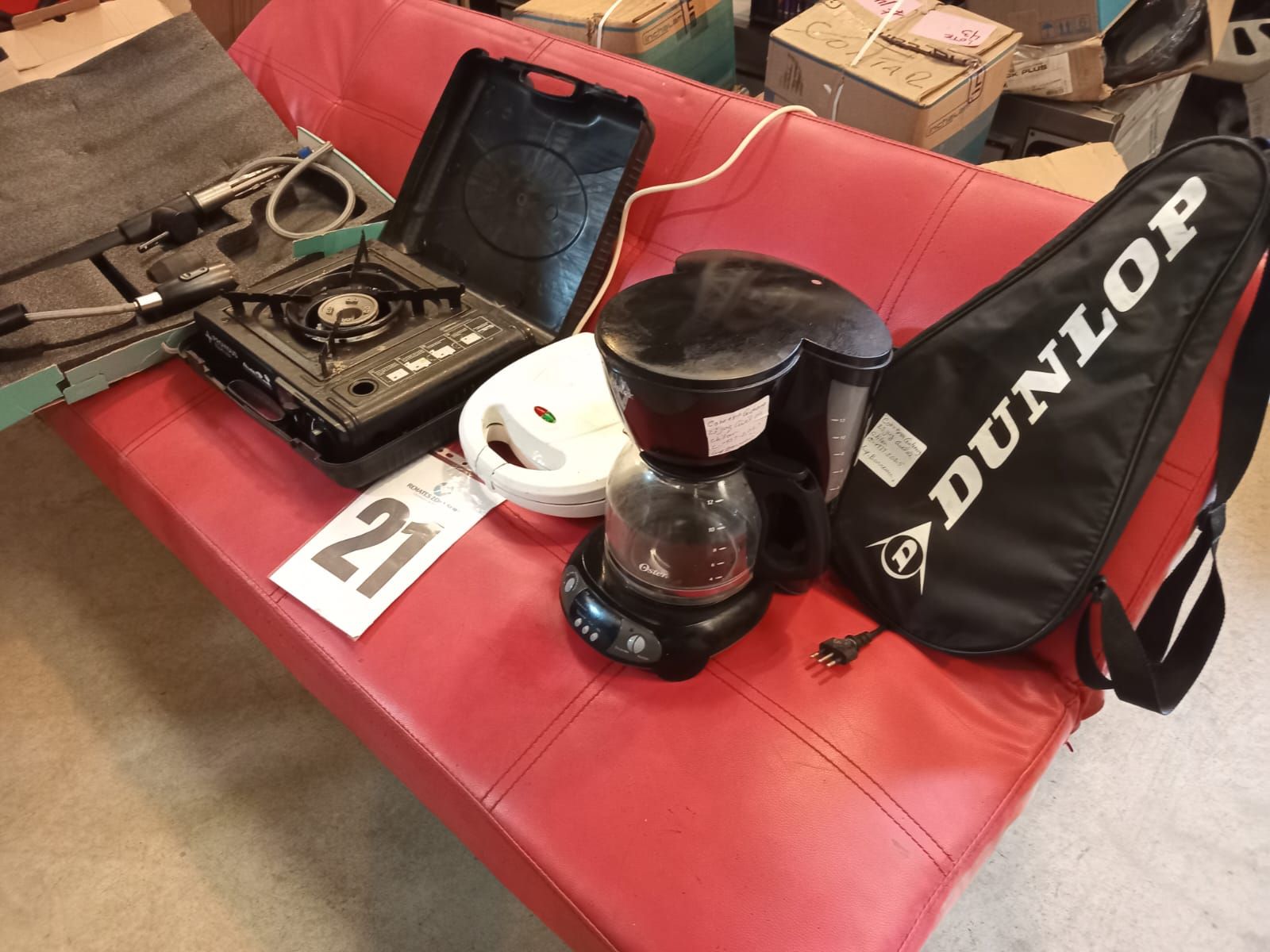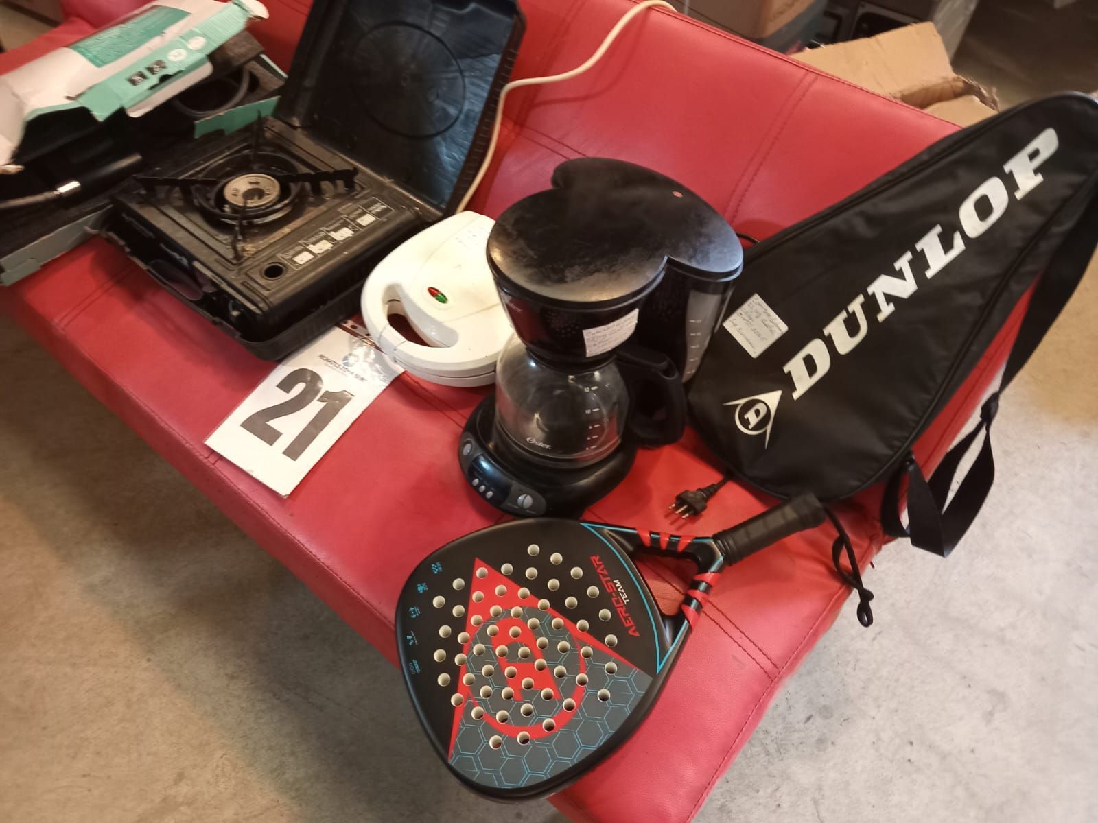 LOTE 21: Monomando extensible lavaplatos Shot Home. Pala de padel Dunlop. Cocina portable Providus. Sanguchera Nex. Cafetera Oster.