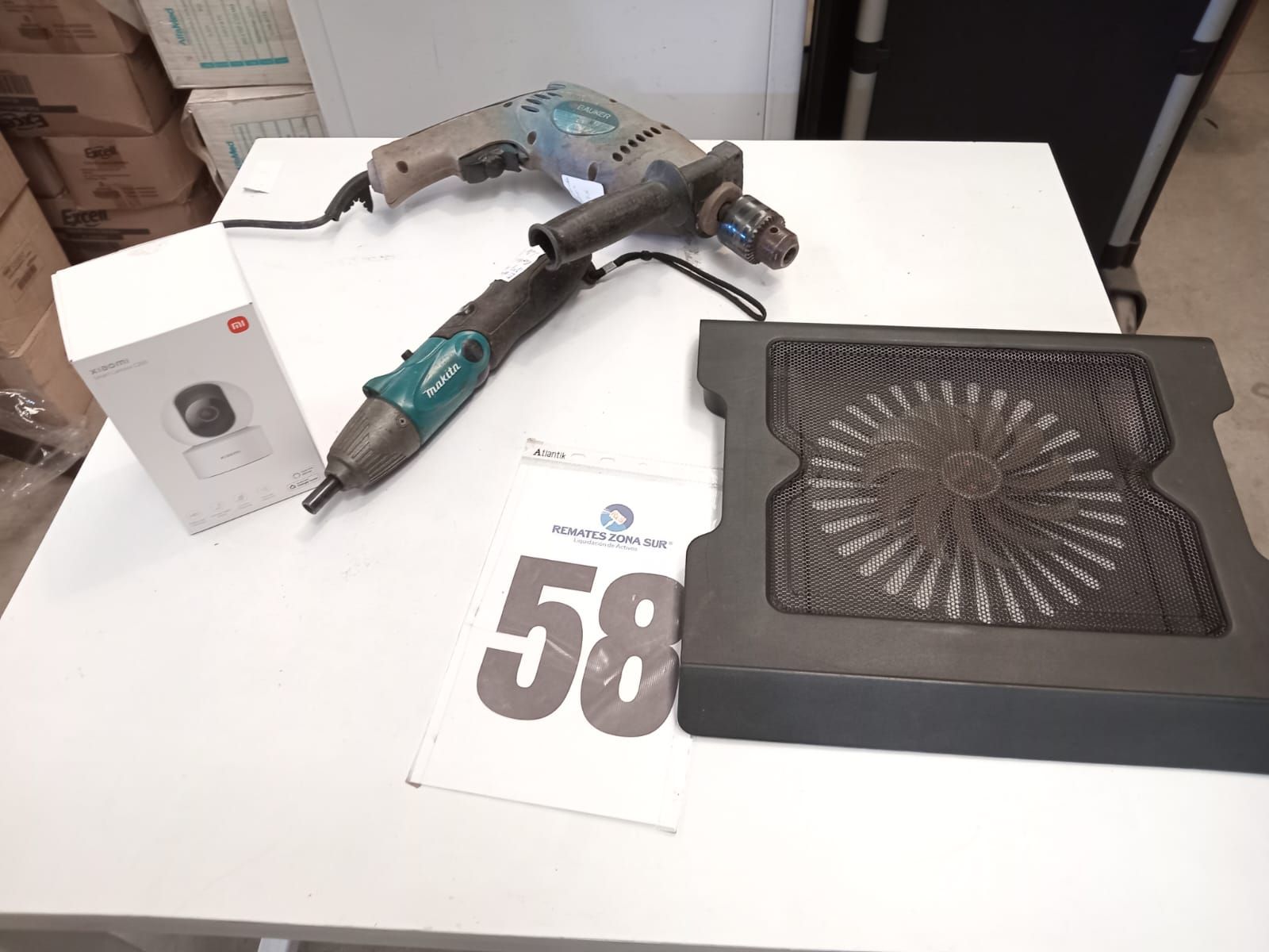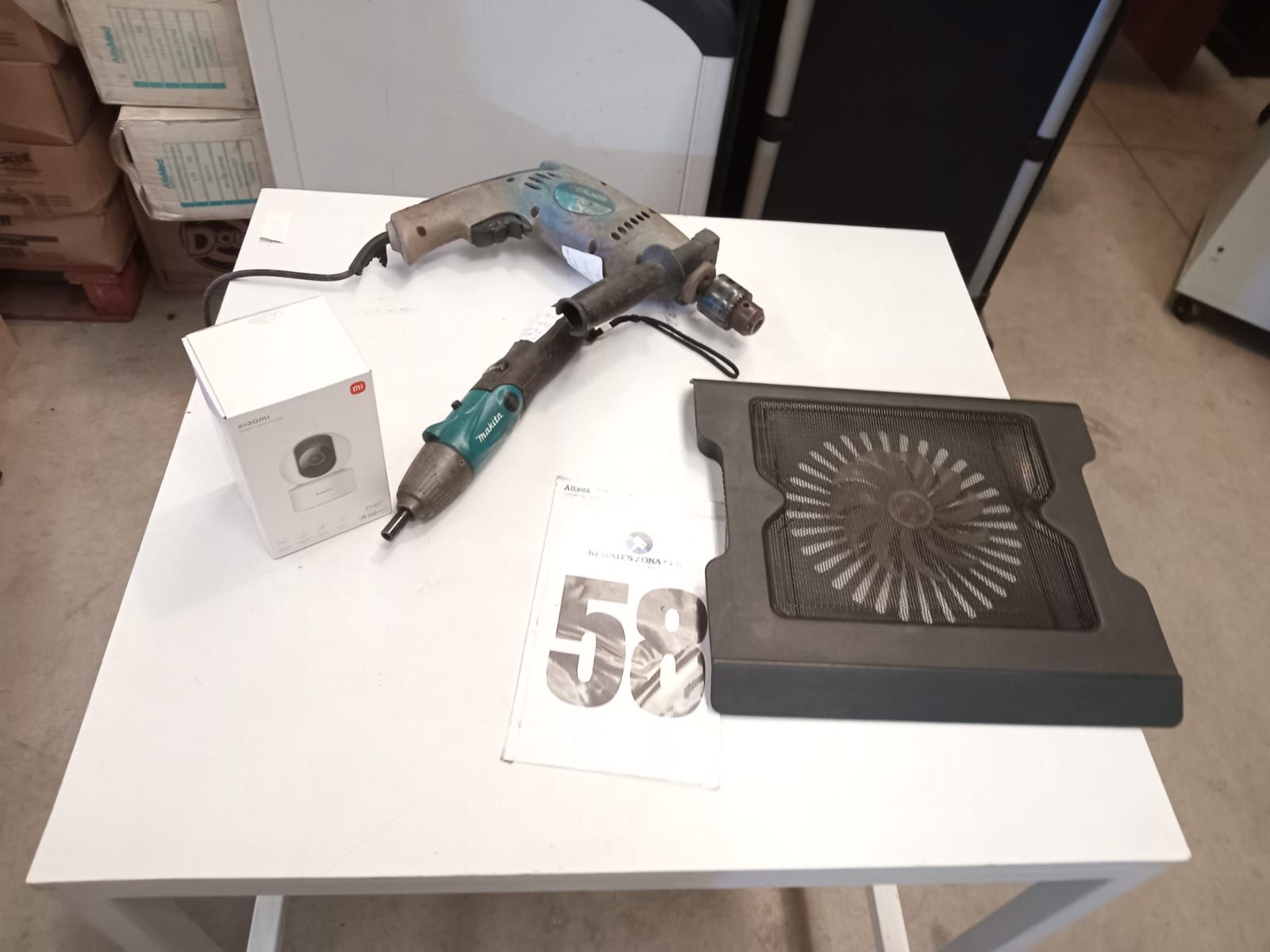 LOTE 58: Atornillador Makita. Base de Ventilador, Newo. Cámara De Seguridad, Xiaomi. Taladro Eléctrico, Bauker. (Retiro En Sede Rzs)