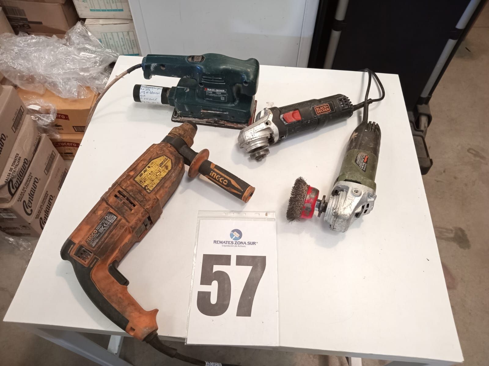 LOTE 57: Esmeril Angular Bauker. Esmeril Angular Black & Decker. Lijadora Eléctrica Black & Decker. Taladro Percutor Incco.