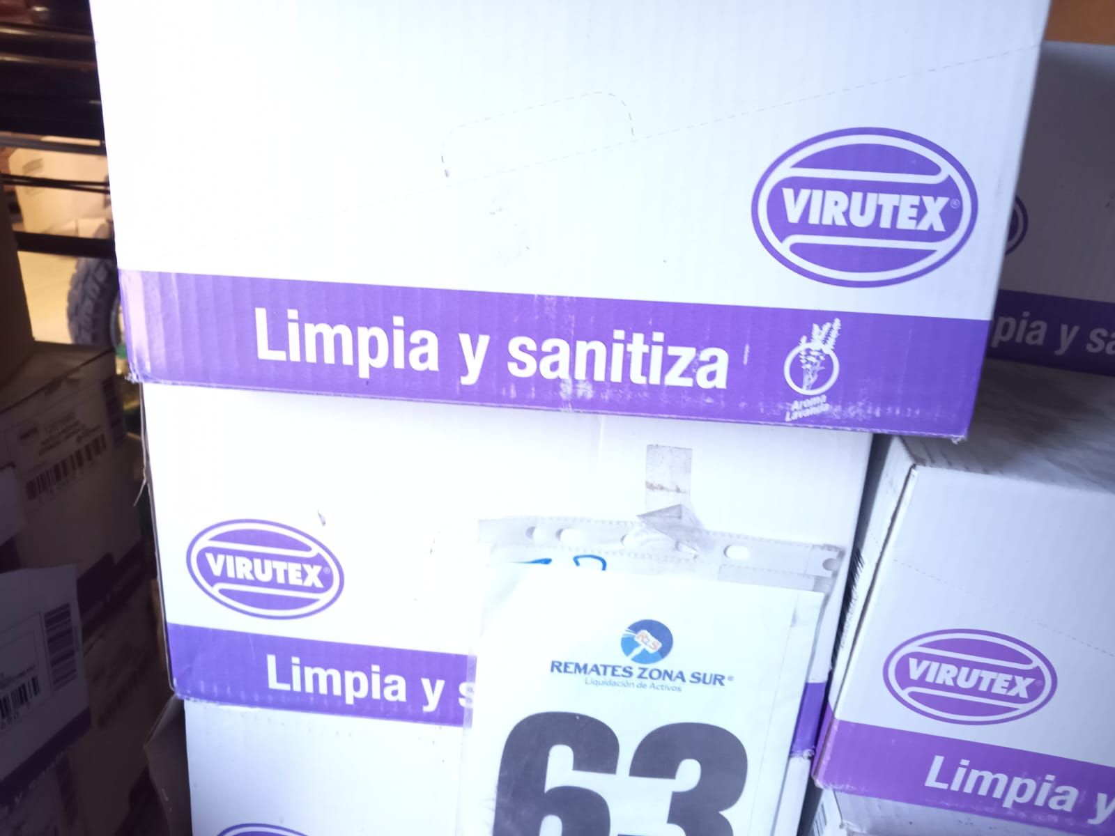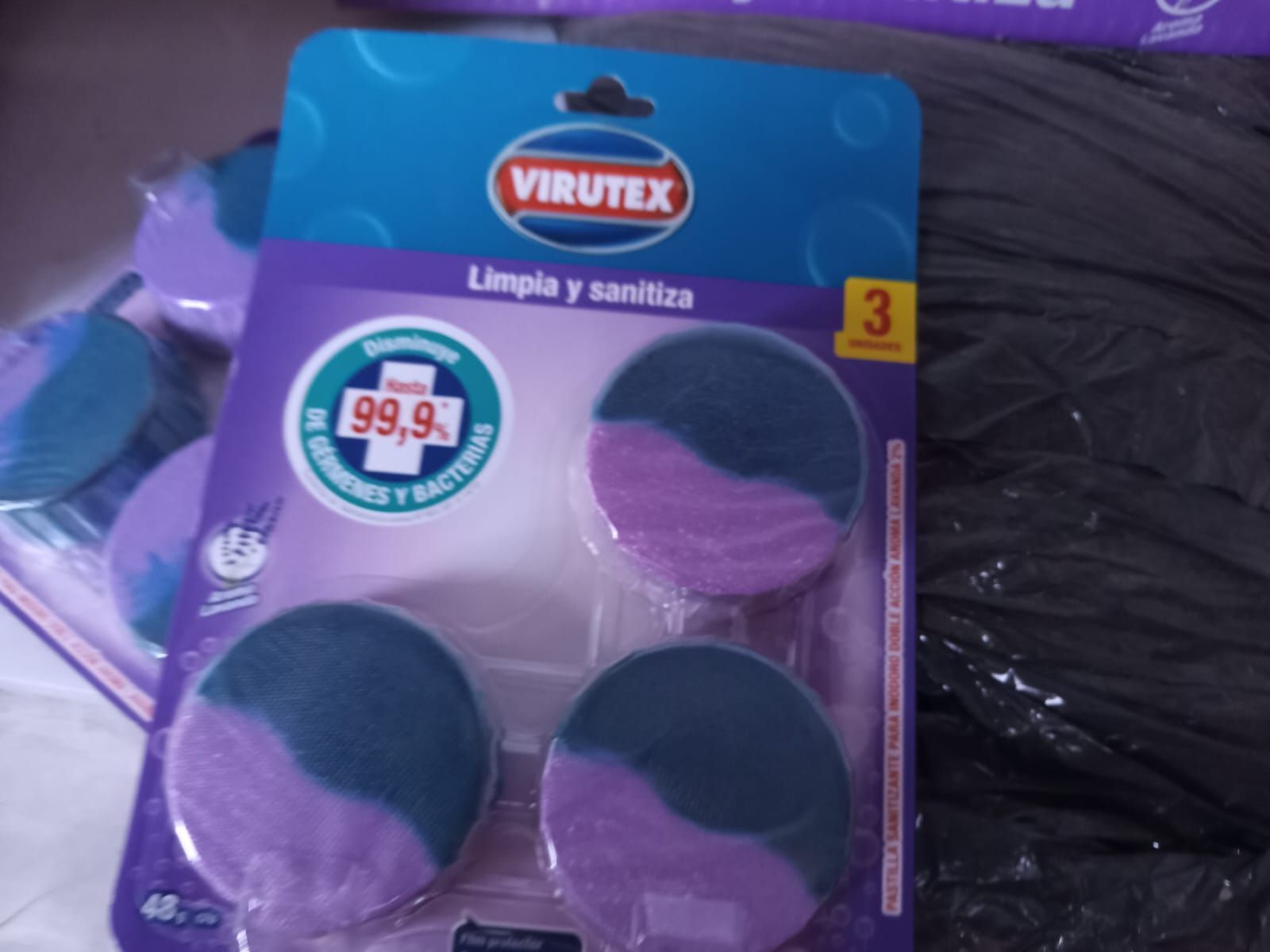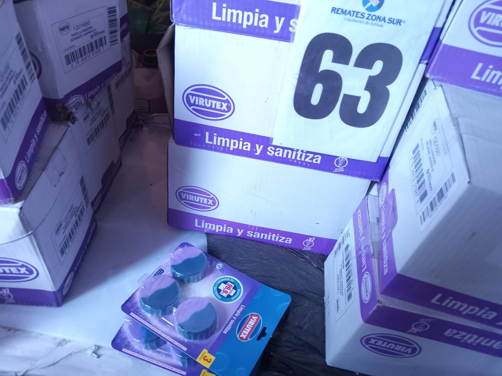 LOTE 63: 06 CAJAS PASTILLA INODORO ESTANQUE LAVANDA X3 VIRUTEX (72UN) + 17 CAJAS DE PASTILLA INODORO ESTANQUE LAVANDA X1 VIRUTEX (408UN) + LIMPIADOR DESINFECTANTE ANTIACAROS BIO EXCELL 500 CC (32UN) + 05 CAJAS DE CANASTILLA WIESE LAVANDA 35 GRS (60UN) + 06 CAJAS DE CANASTILLA WIESE NARANJA 35 GRS (72UN) + 02 CAJAS DE ESPONJA CANALADA VIRUTEX X 1 (115) + 02 CAJAS DE PASTILLA ESTANQUE AZUL X 3 UNID (48UN) + 18 UN DE LIMPIADOR EN CREMA 700 GR MARCA ABY + 30 CAJITAS DE CANASTILLO C/3 REPUESTOS PASTILLA VIRUTEX + 84 CAJAS Y 42 SUELT DE PAÑO MICROFIBRA MULTIUSO 38X38 EXCELL (3882UN) + 12 LIMPIADOR Y ABRILLANTADOR MANLAC 1 LT.