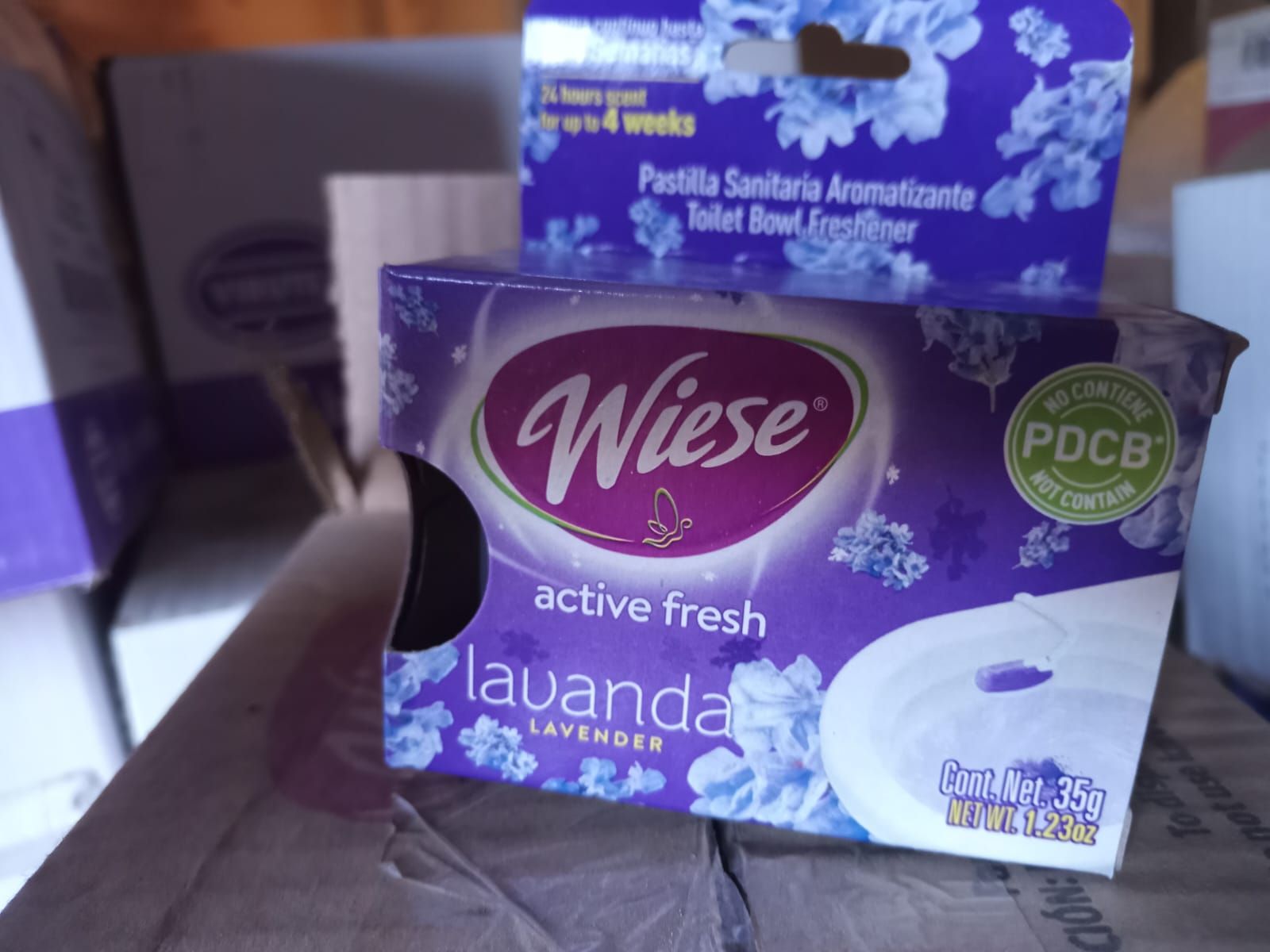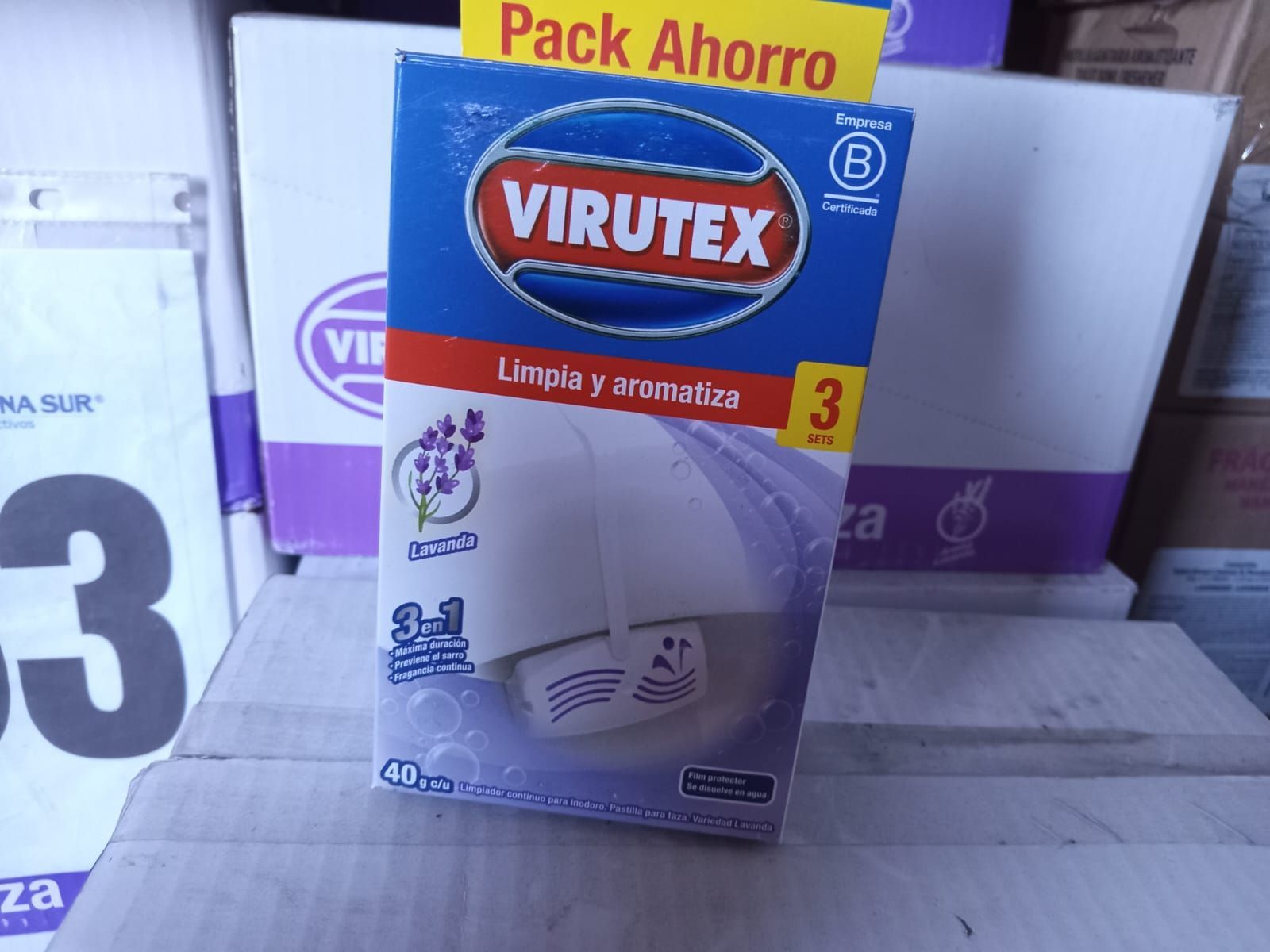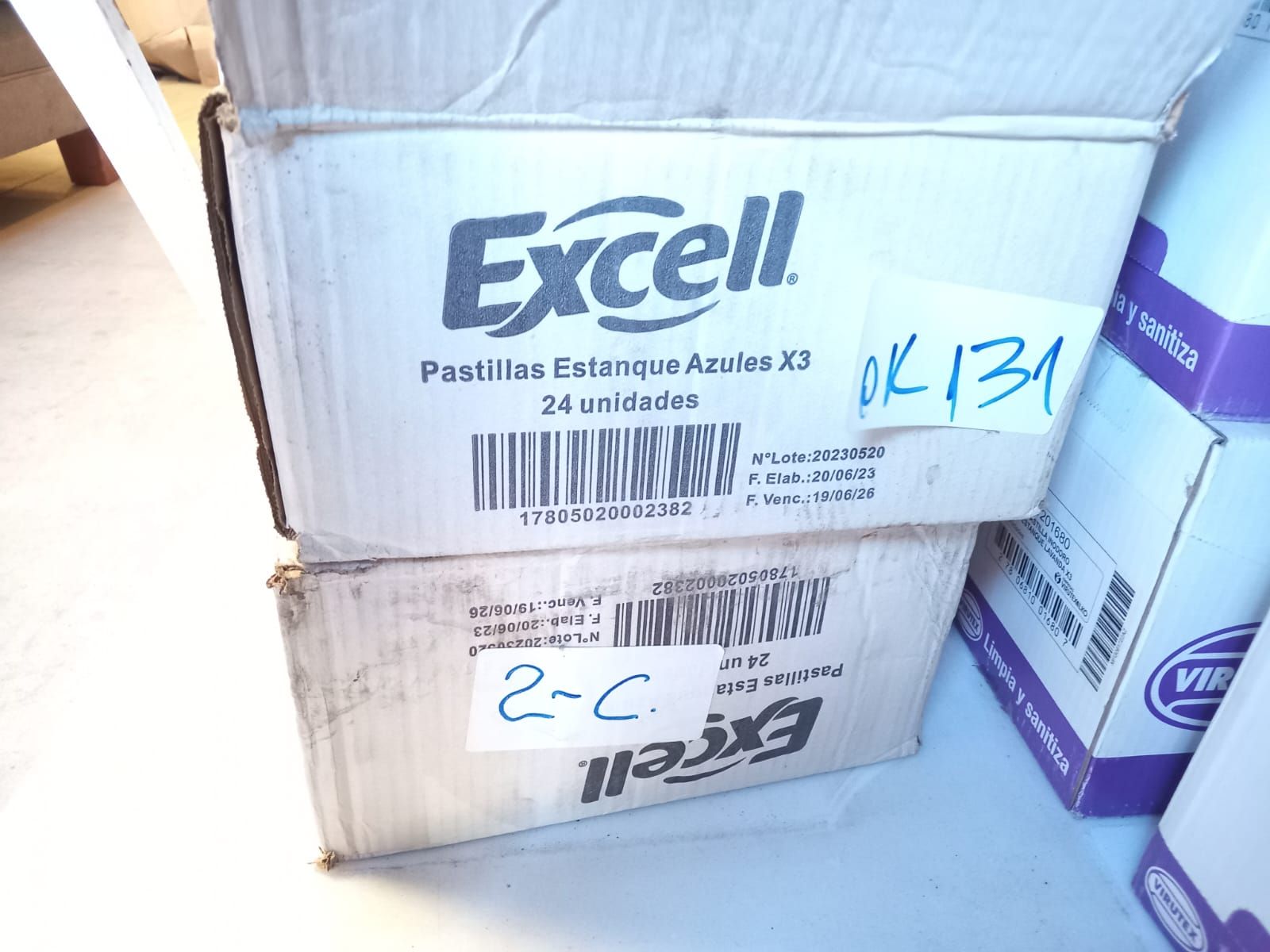 LOTE 63: 06 CAJAS PASTILLA INODORO ESTANQUE LAVANDA X3 VIRUTEX (72UN) + 17 CAJAS DE PASTILLA INODORO ESTANQUE LAVANDA X1 VIRUTEX (408UN) + LIMPIADOR DESINFECTANTE ANTIACAROS BIO EXCELL 500 CC (32UN) + 05 CAJAS DE CANASTILLA WIESE LAVANDA 35 GRS (60UN) + 06 CAJAS DE CANASTILLA WIESE NARANJA 35 GRS (72UN) + 02 CAJAS DE ESPONJA CANALADA VIRUTEX X 1 (115) + 02 CAJAS DE PASTILLA ESTANQUE AZUL X 3 UNID (48UN) + 18 UN DE LIMPIADOR EN CREMA 700 GR MARCA ABY + 30 CAJITAS DE CANASTILLO C/3 REPUESTOS PASTILLA VIRUTEX + 84 CAJAS Y 42 SUELT DE PAÑO MICROFIBRA MULTIUSO 38X38 EXCELL (3882UN) + 12 LIMPIADOR Y ABRILLANTADOR MANLAC 1 LT.