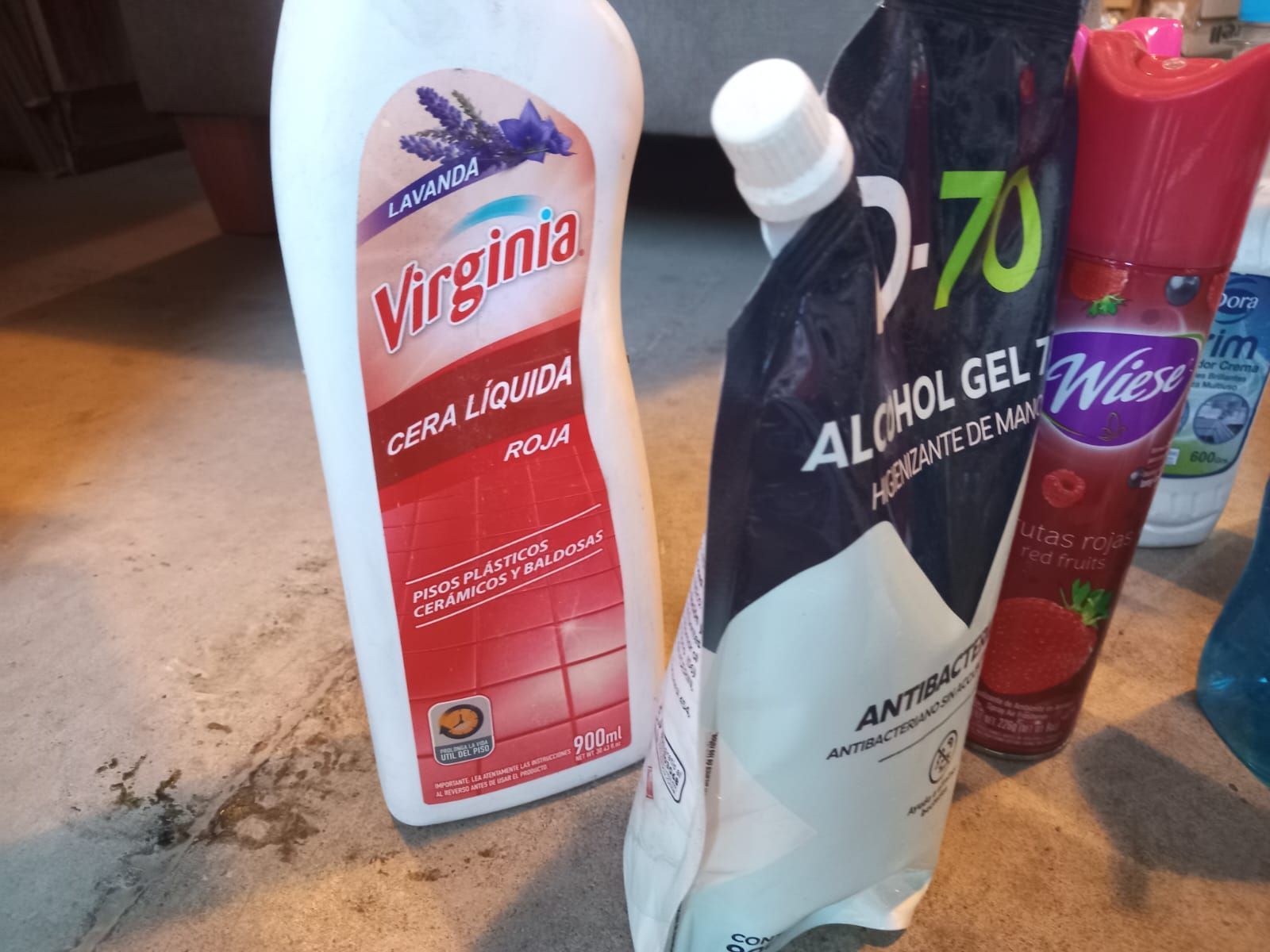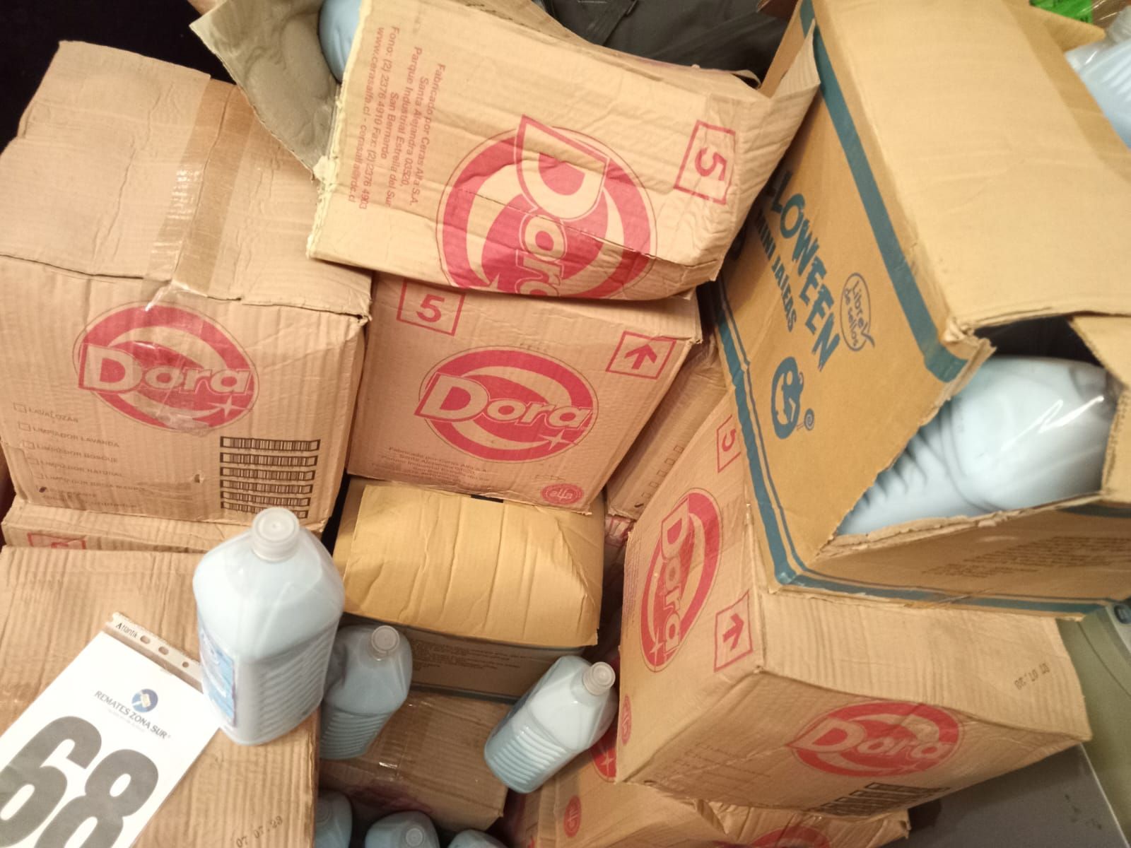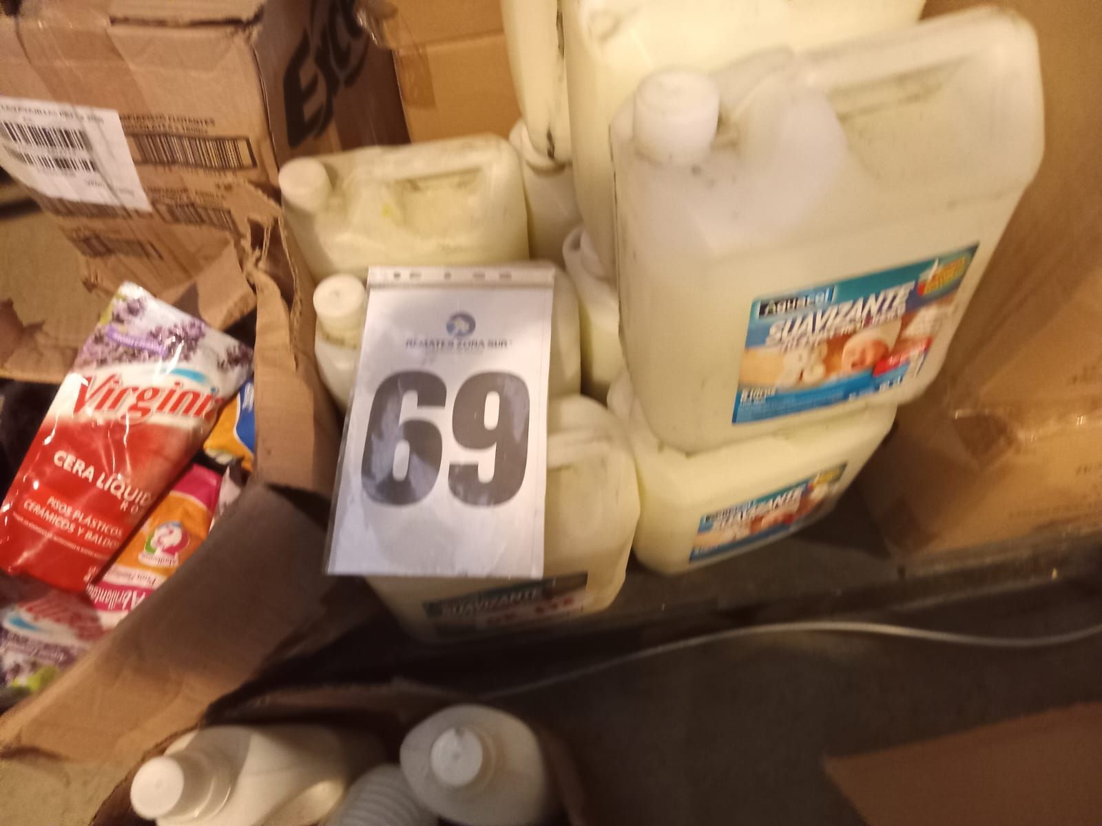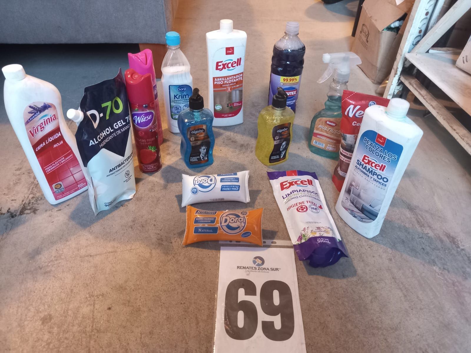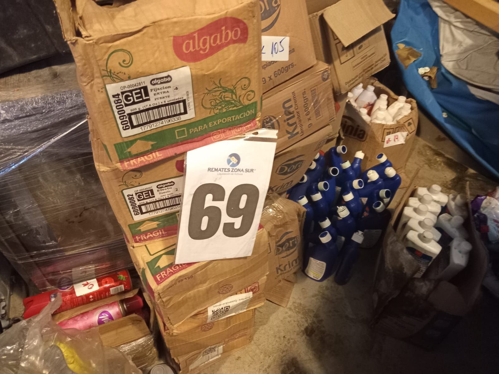 LOTE 69: 21UN LIMPIADOR PISO FLOTANTE VIRGINIA LAVANDA 900 ML + 33UN LAVAVAJILLA BIO EXCELL 2 LTS + 13 CERA LIQUIDA ROJA VIRGINIA 900 ML LAVANDA + 07 CERA LIQUIDA AUTOBRILLO VIRGINIA INCOLORA LAVANDA 400 ML + 07UN CERA LIQUIDA AUTOBRILLO VIRGINIA ROJA LAVANDA 400 ML + LIMPIADOR PISO FLOTANTE VIRGINIA LAVANDA 400 ML + ABRILLANTADOR PISO FLOTANTE VIRGINIA LAVANDA 400 ML + 24UN GEL CAPILAR ALGABO EFECTO EXTRA FUERTE FRASCO 500 GRS + 24UN GEL CAPILAR ALGABO EFECTO HUMEDO FRASCO 500 GRS + 12 CAJAS DE LIMPIADOR EN CREMA DORA KRIM 600 GR (108UN) + 02 UN DE LIMPIA PISO EXEL 900 CC AROMA LAVANDA + 09UN DE SHAMPOO ALFOMBRA Y TAPICES EXEL 900 CC + ABRILLANTADOR PISO FLOTANTE FRUTOS DEL BIOSQUE 900 ML + 43UN DE ALCOHOL GEL 70% ANTIBACTERIANO D70 900 ML + 12UN LIMPIADOR LIQUIDO SUPERFICIE 500 ML MANLAC + 11UN DESODORANTE AMBIENTAL WEISSE 226 GR FLORAL PARADICE + 03UN DE DESODORANTE AMBIENTAL WEISSE 226 GR FRUTOS ROJOS + 19UN DE LIMPIA PISO EXEL 500 ML AROMA C/ AMONIO + 28UN REMOVEDOR DE SARRO EXEL + 216UN DE CERA EN PAN DORA 340 CC INCOLORA + 24UN DE CERA EN PAN DORA 340 CC ROJA + 24UN CERA EN PAN DORA 340 CC NATURAL + 09UN SUAVIZANTE AGUACOL 5 LTS + 02 BIDONES DE RENOVADOR DE GOMA AGUACOL 5 LTS + 02 BOLSAS DE CERA ROJA DORA 360 ML.