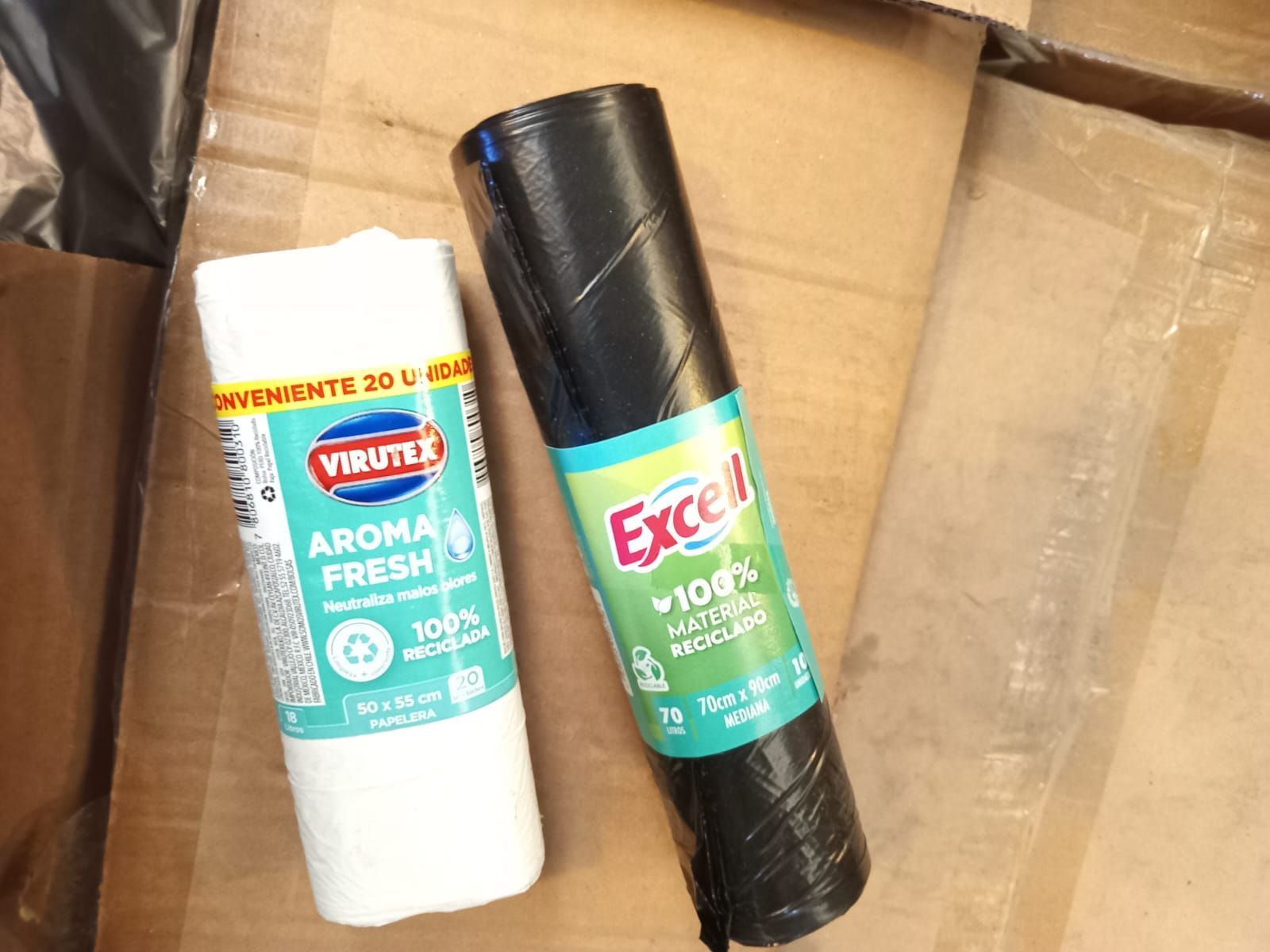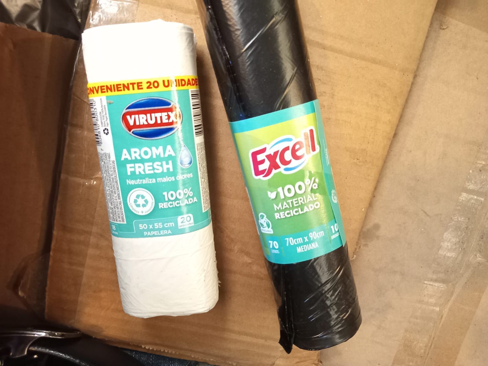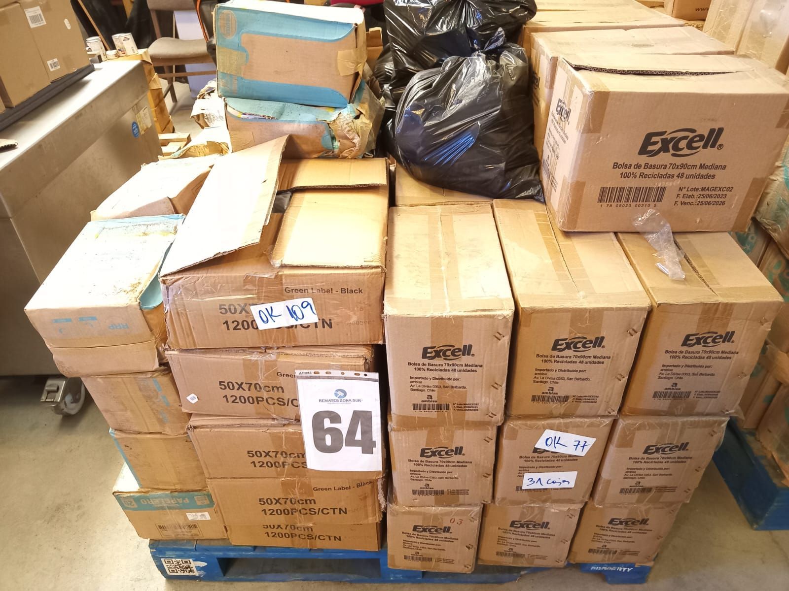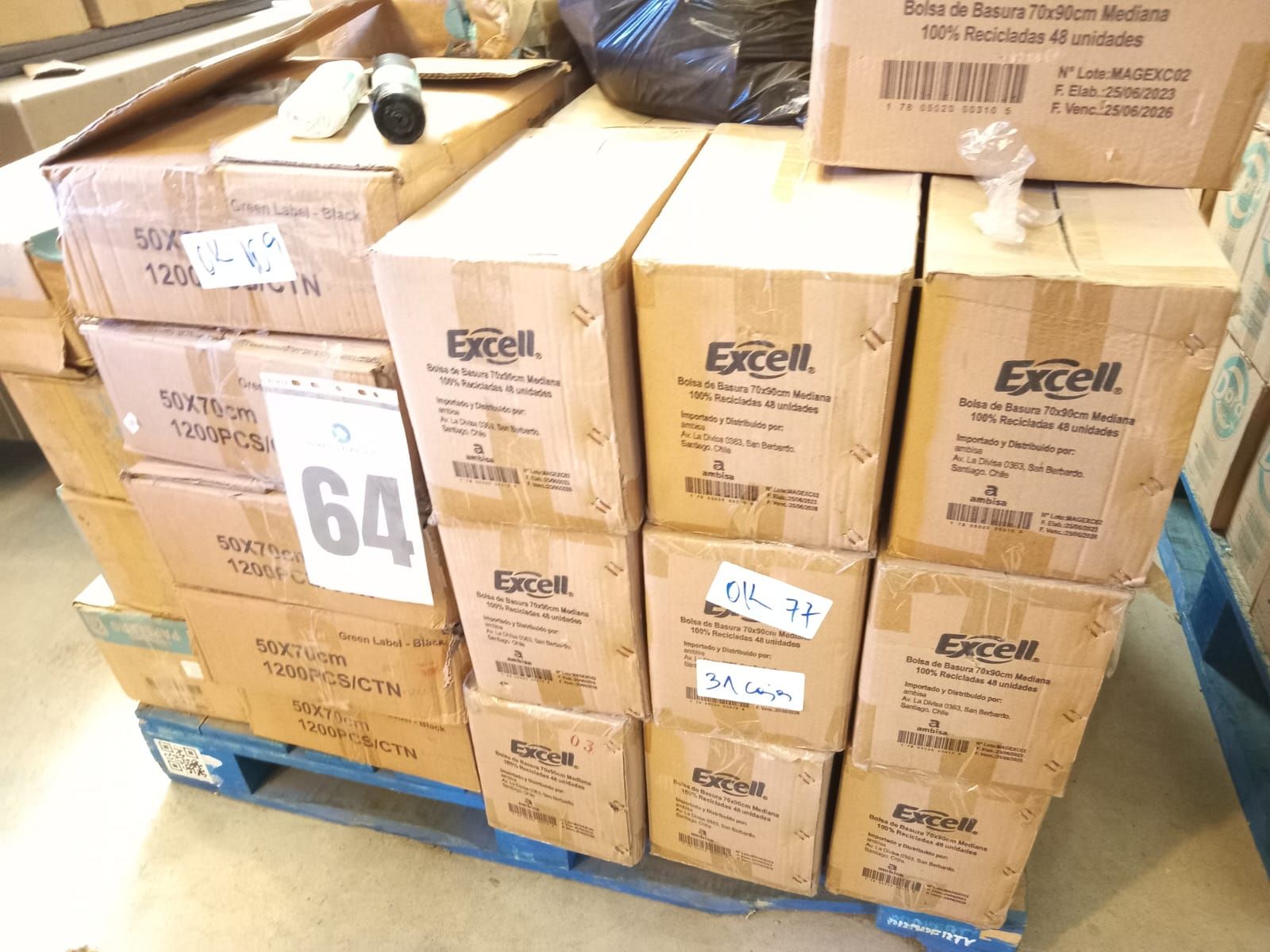 LOTE 64: 19 CAJAS DE BOLSA BASURA RECICLADA BLANCA 50X55X20 UN VIRUTEX (608UN) + 9CAJAS Y 3BOLSA DE BOLSA BASURA ECOROLLO NEGRA 50X55X20 UN VIRUTEX (288UN) + 30 CAJAS Y 38 ROLLOS S DE BOLSA BASURA EXCELL 70 X 90 (1478UN) + 05 CAJAS DE BOLSA DE BASURA ABY 50 X 70 CM (600UN).