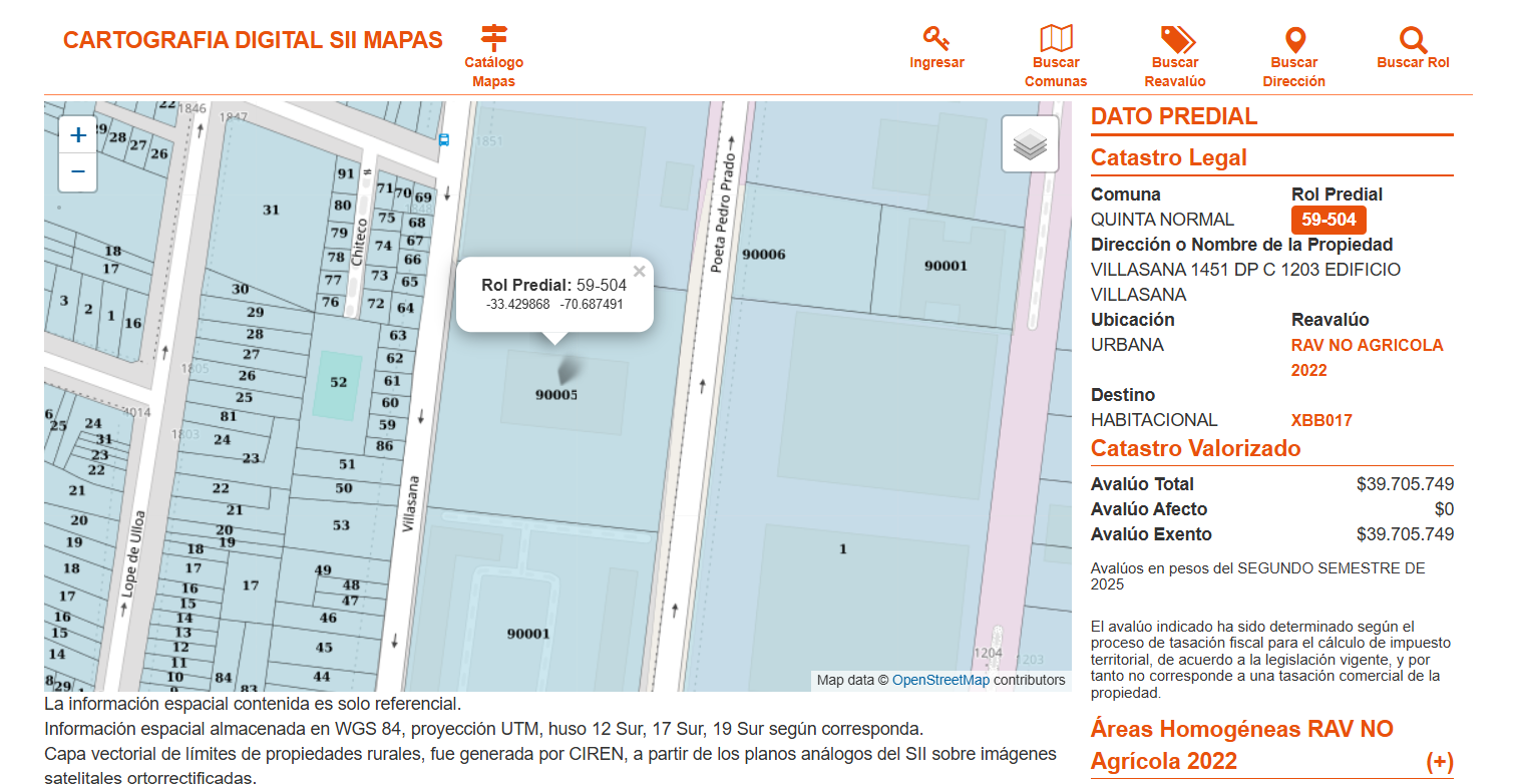 Departamento 1203 del piso 12, de la Torre C, del condominio VILLASANA, con acceso por calle Villasana 1451, Comuna de Quinta Normal, Región Metropolitana. La inscripción se encuentra a fojas 23530, número 34578, del Registro de Propiedad del año 2021, del Conservador de Bienes Raíces de Santiago. El rol de avalúo de Impuestos Internos es el número 59-504, Comuna de Quinta Normal.