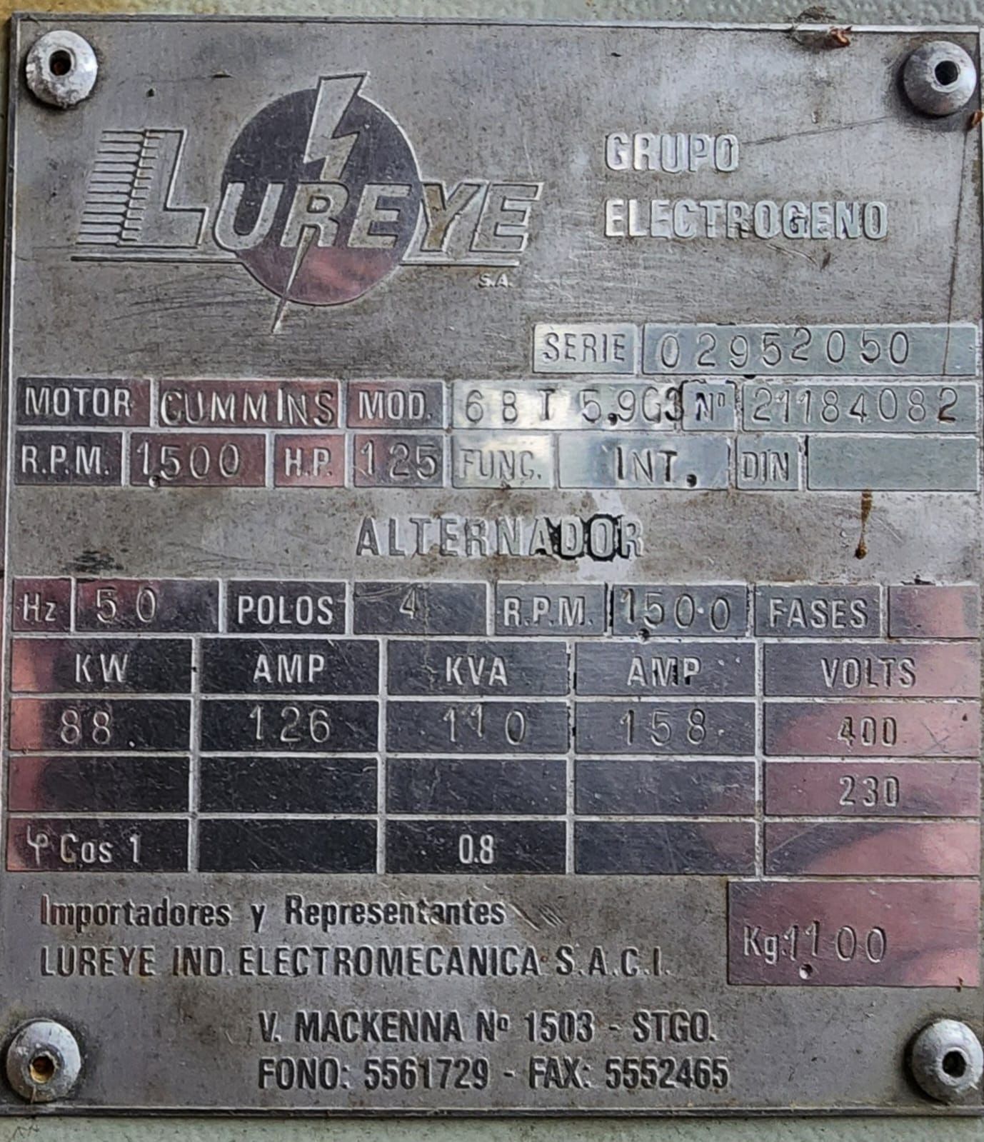 GENERADOR MARCA LUREYE MOTOR CUMMINS 110 KVA