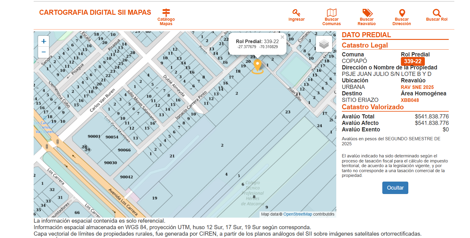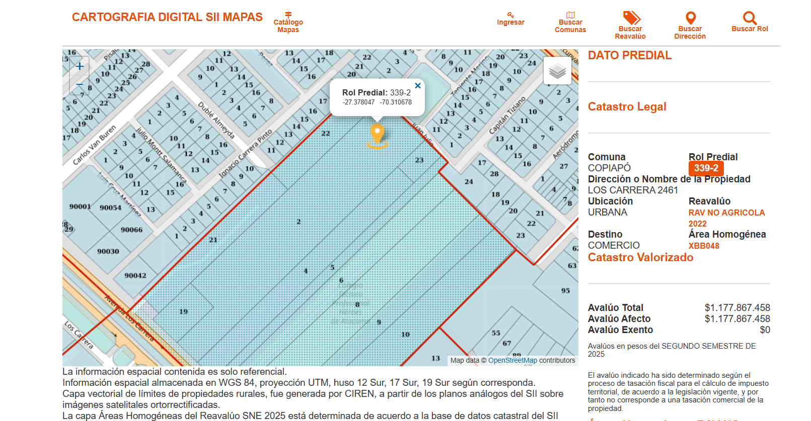 A.2.- Inmueble ubicado en calle Los Carrera N° 2425, ciudad, comuna y provincia de Copiapó, región de Atacama. El inmueble se encuentra inscrito a fojas 1175 vuelta, número 1196, correspondiente al Registro de Propiedad del año 2022 del Conservador de Bienes Raíces de Copiapó. Rol de avalúo 339-19 de la comuna de Copiapó.