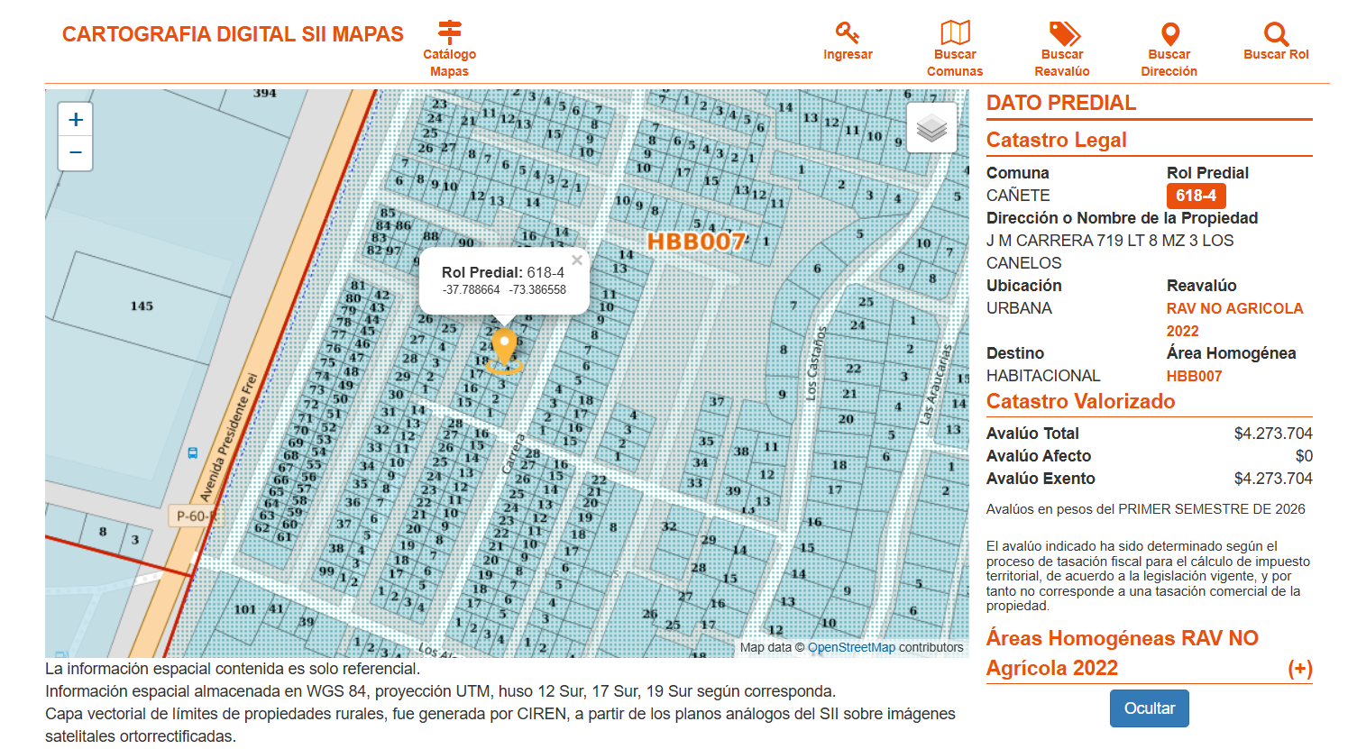 Inmueble ubicado en calle Pasaje José Miguel Carrera N°719, Población Los Canelos, comuna de Cañete, que corresponde al Lote N°8, Manzana 3, del Plano de Loteo 396 que está agregado al final del Registro de Propiedad del año 1994 del Conservador de Bienes Raíces de Cañete. El inmueble se encuentra inscrito a fojas 691, número 1240 correspondiente al Registro de Propiedad del año 2018 del Conservador de Bienes Raíces de Cañete. Rol de avalúo N° 618-004 de la comuna de Cañete.