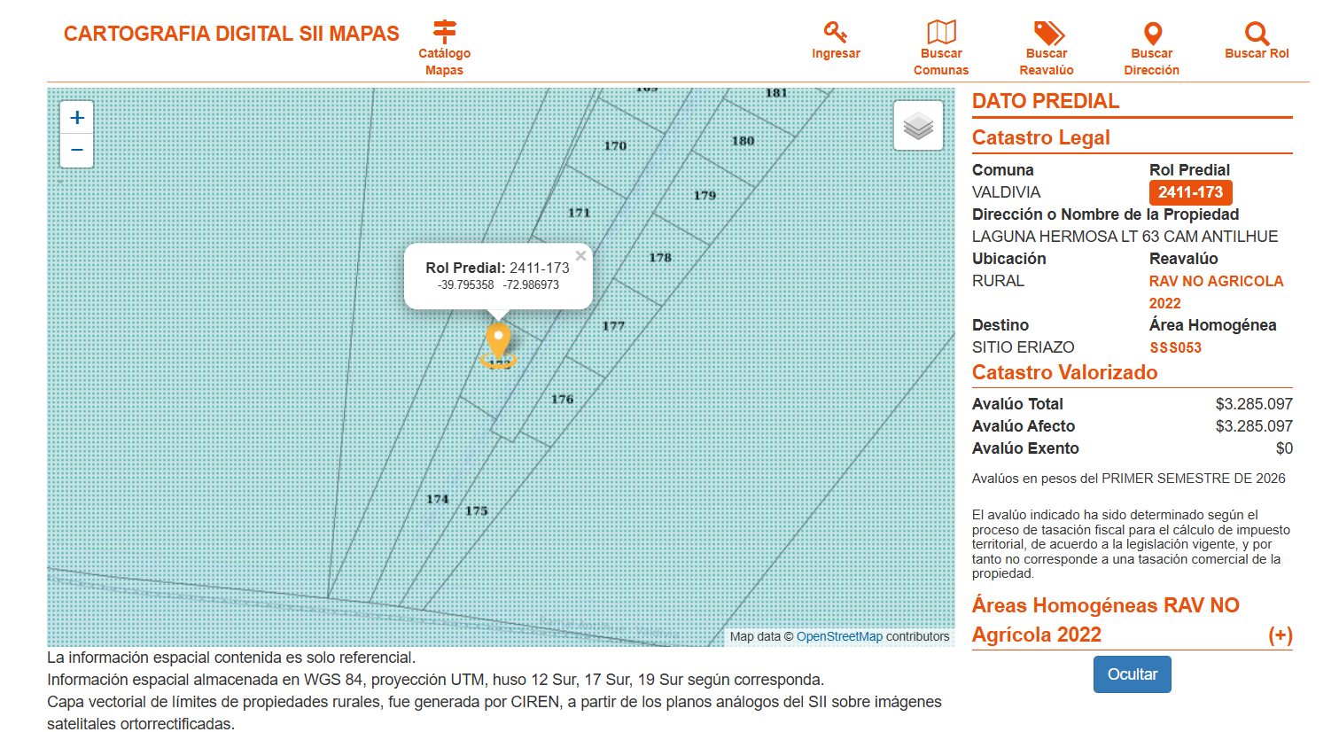 LOTE SESENTA Y TRES, del denominado Condominio Residencial Laguna Hermosa, sitio eriazo, ubicado en el predio de Cuicuilelfu, camino a Antilhue, comuna de Valdivia. El inmueble se encuentra inscrito a fojas 2863 vta. número 2563 correspondiente al Registro de Propiedad del año 2022 del Conservador de Bienes Raíces de Valdivia. Rol de avalúo N°2411-173 de la comuna de Valdivia.