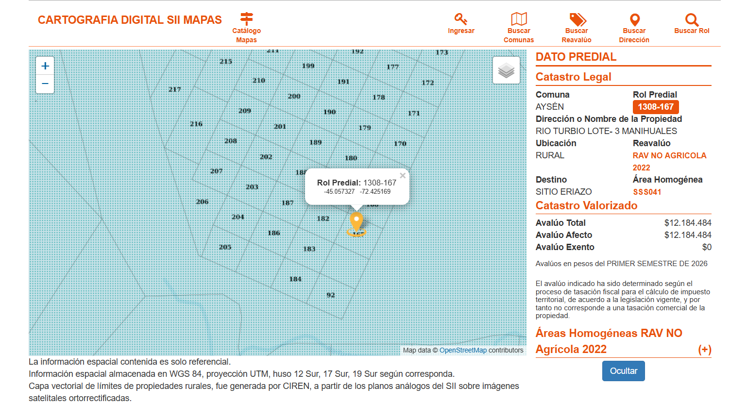 LOTE TRES, situado en el lugar Río Turbio, Villa Mañihuales, Comuna y Provincia de Aysén, Región de Aysén del General Carlos Ibáñez del Campo, de una superficie aproximada de 1,0 hectáreas. El dominio se encuentra inscrito a fojas 2568, número 1867 del Registro de Propiedad del año 2023 del Conservador de bienes Raíces de Aysén. Rol de Avalúo N°1308-167 de la Comuna de Aysén.