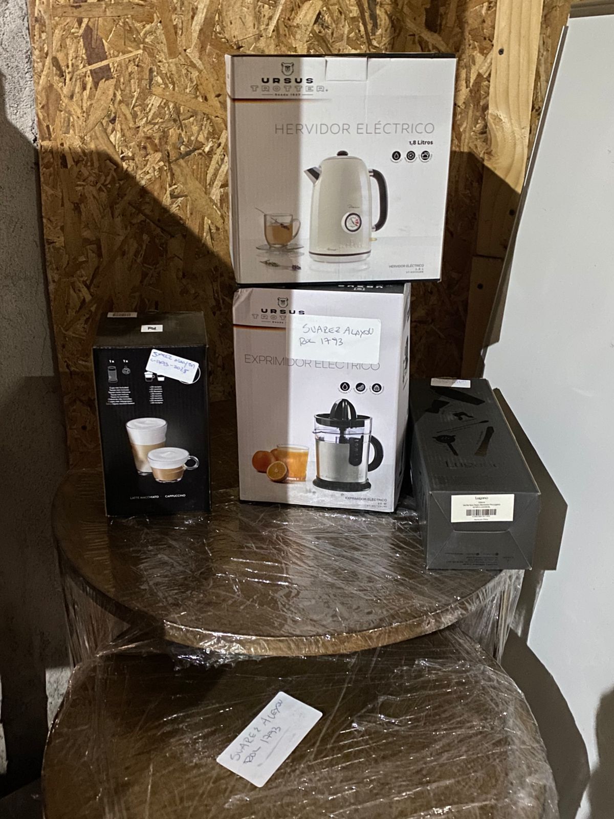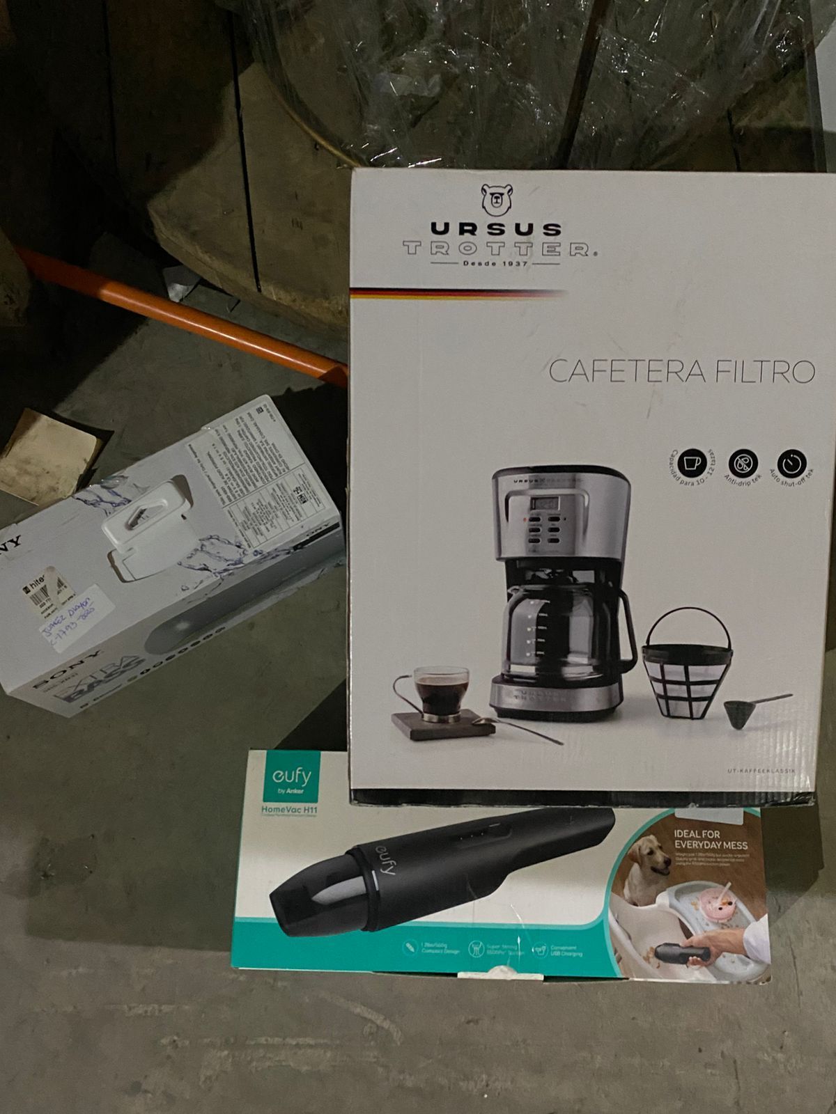 LOTE 184: Mesa De Centro. Mesa De Apoyo. Espejo. Hervidor Ursus Trotter. Set De Cocteleria. Exprimidor Eléctrico Ursus Trotter. Cuadro Fotográfico. Balanza Digital. Cafetera Ursus Trotter. Espumador Nesspreso. Lámpara De Piso Abitaré. Aspiradora Euty. Parlante Sony. Estante De Vidrio.