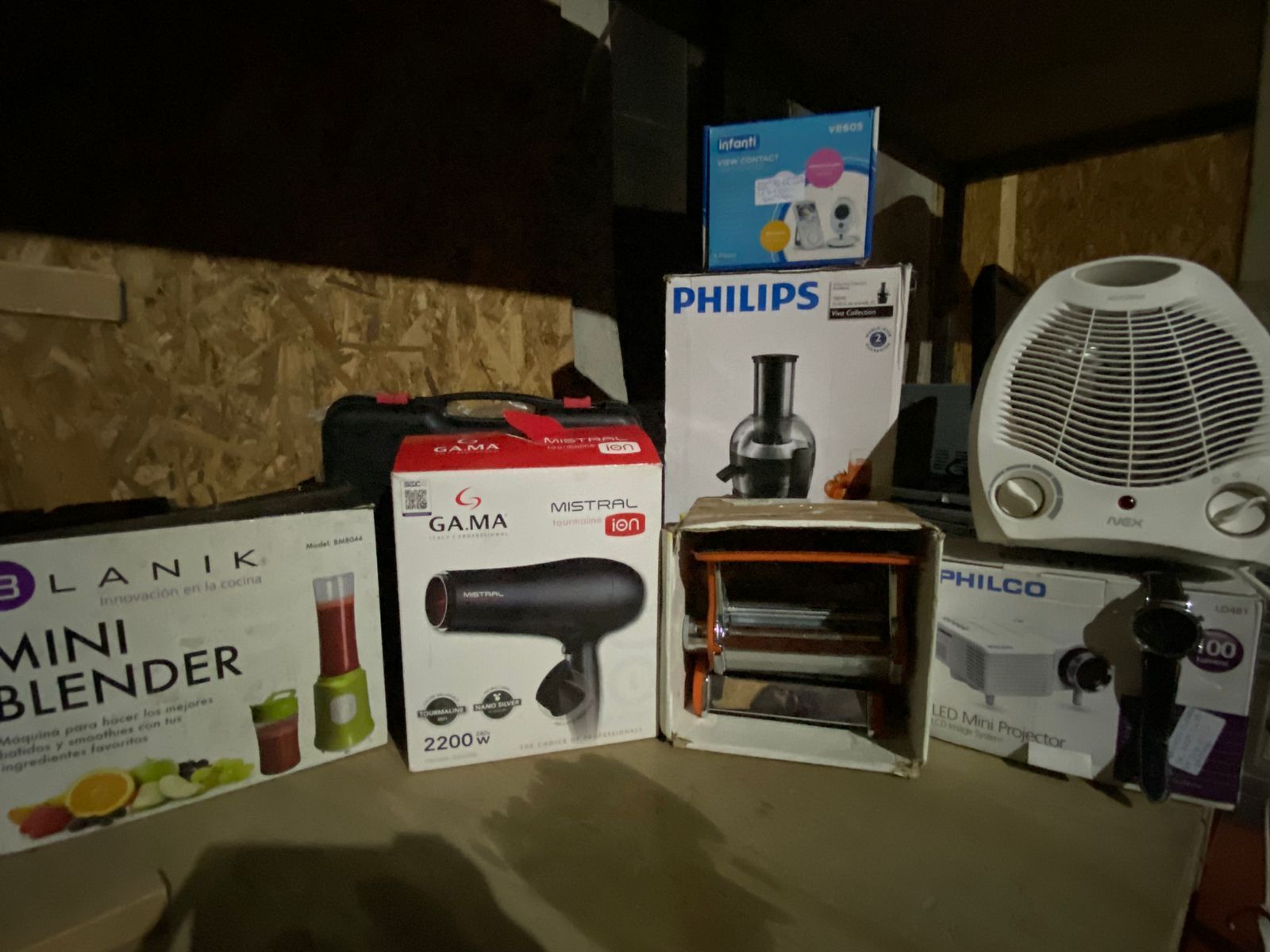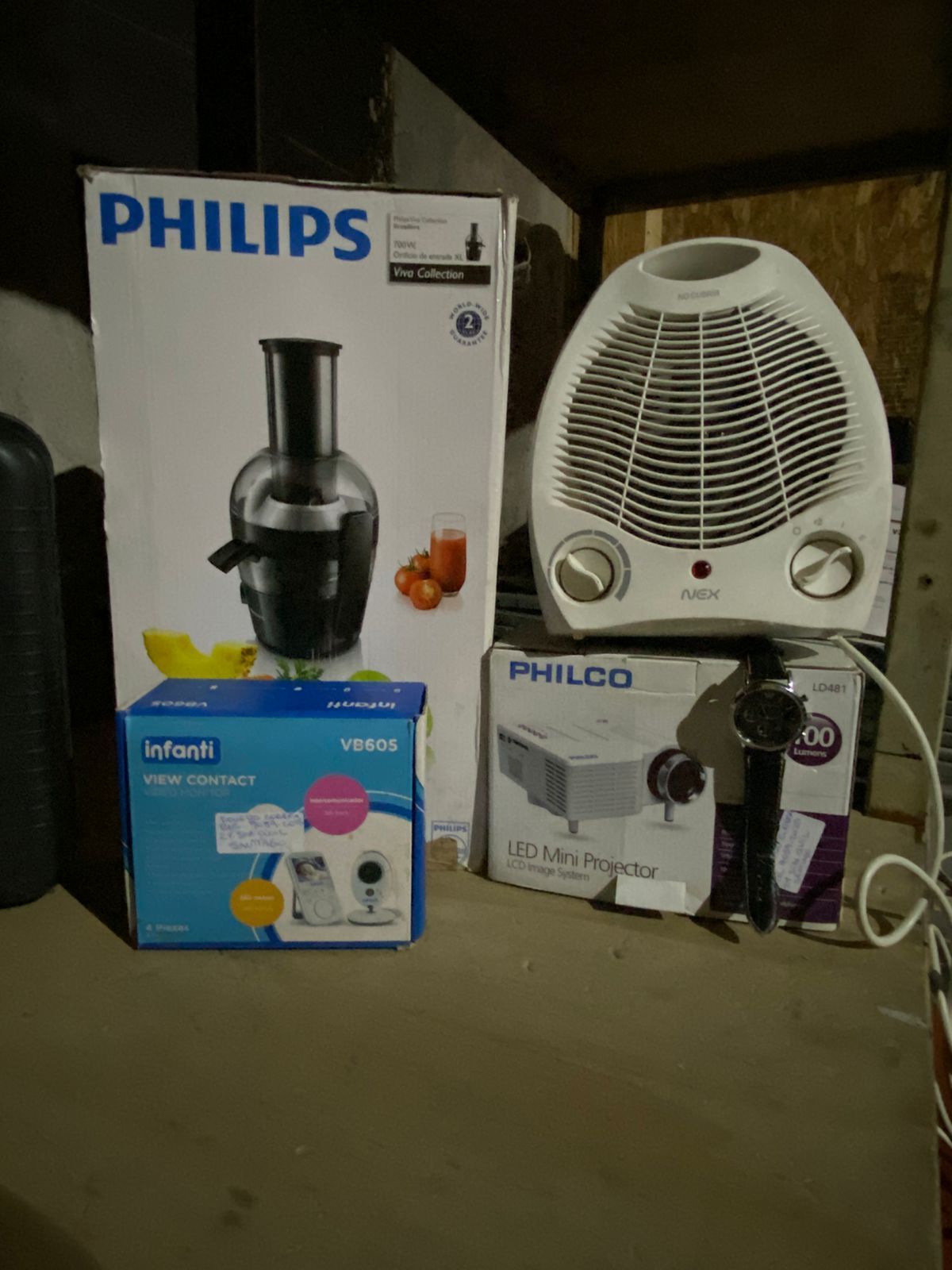 LOTE 191: Monopatin eléctrico, falta cargador y correa. Reloj de mano Armani. Extractor de Jugo Philco. Cocinilla portatil. Maquina de pastas, faltan algunas piezas. Proyector Philco. Cama para niños. Secador de pelo. Calefactor. Juguera con vaso.