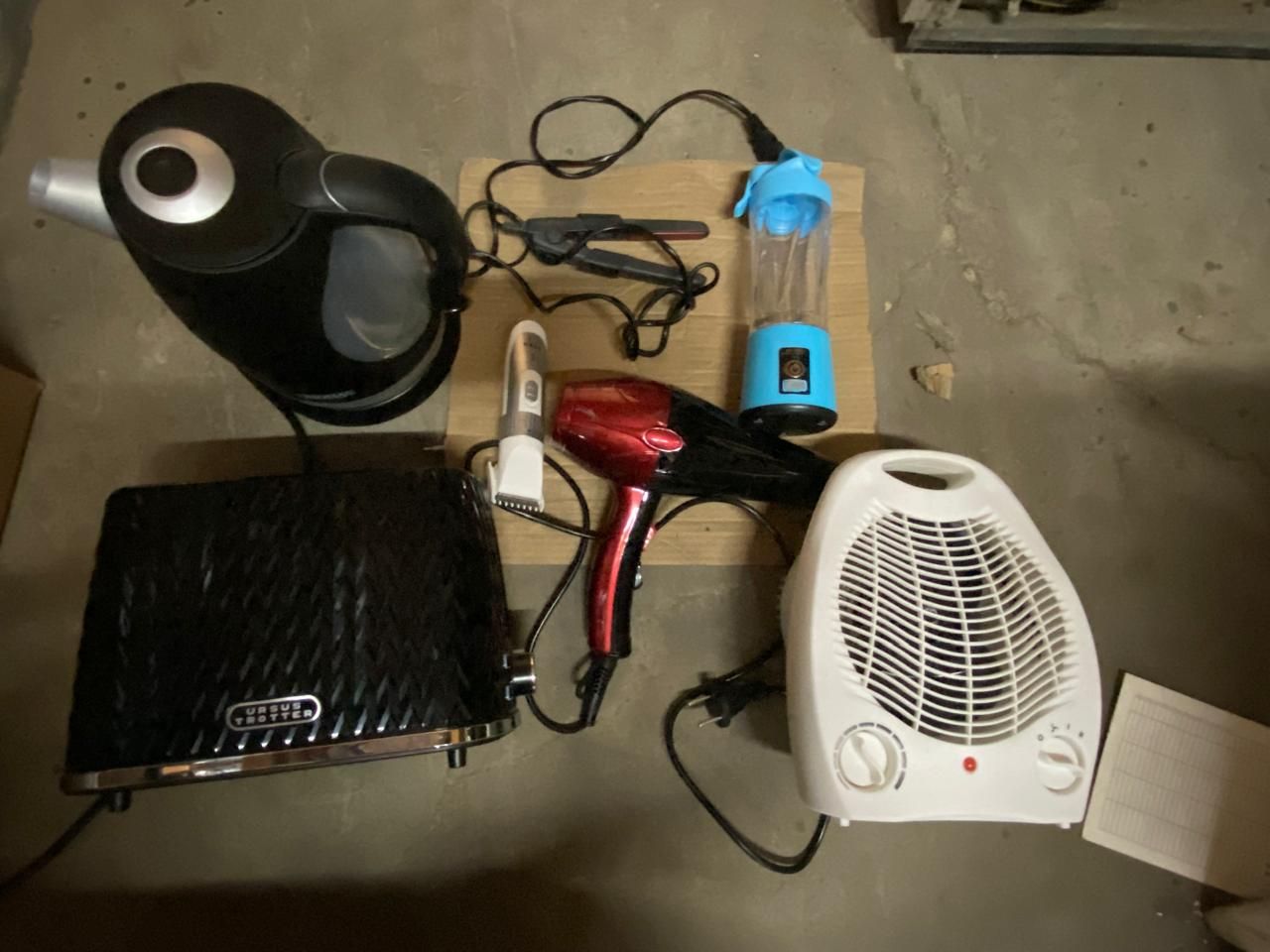 LOTE 189: Calefactor Eléctrico Marca Thomas. Hervidor Color Blanco Marca Thomas. Juguera Portatil Color Blanco Marca China. Maquina De Afeitar Color Dorado Marca China. Plancha De Pelo Color Rojo/Negro. Secador De Pelo Color Negro Marca Nova. Tostador Electrico Color Negro Sin Marca. (Retiro En Stgo. De Chile)