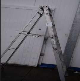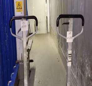 LOTE 148: 5 Transpaletas manuales 1 Carro Altura 1 Escalera tijera 1 Escalera de acero azul.